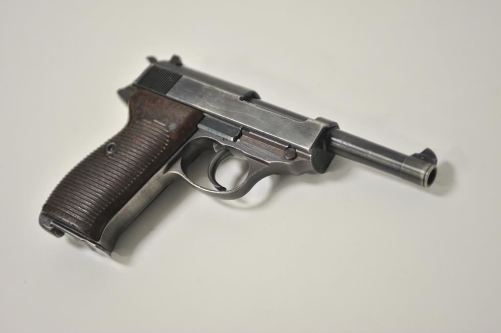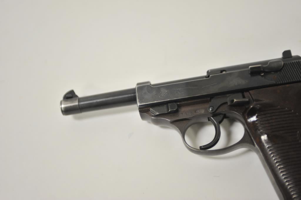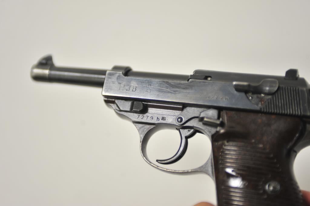 P-38 semi-automatic pistol, ac 43-marked, 9mm caliber, 4.75” barrel, military finish, maroon grips, S/N 7279h; overall very good to near fine condition displaying 80-90% original military finish, very good bore, crisp action, sharp markings and very good to near fine grips. (C&R/PPT). Est.: $400-$800.