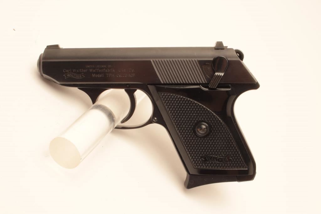 Walther Model TPH by Interarms semi-automatic pistol, .25 ACP caliber, 2.75” barrel, blued finish, checkered plastic grips, S/N G000399; overall fine condition showing minimal use or handling; with factory blue hardcase and end label numbered to this gun. (Modern/PPT). Est.: $350-$700.