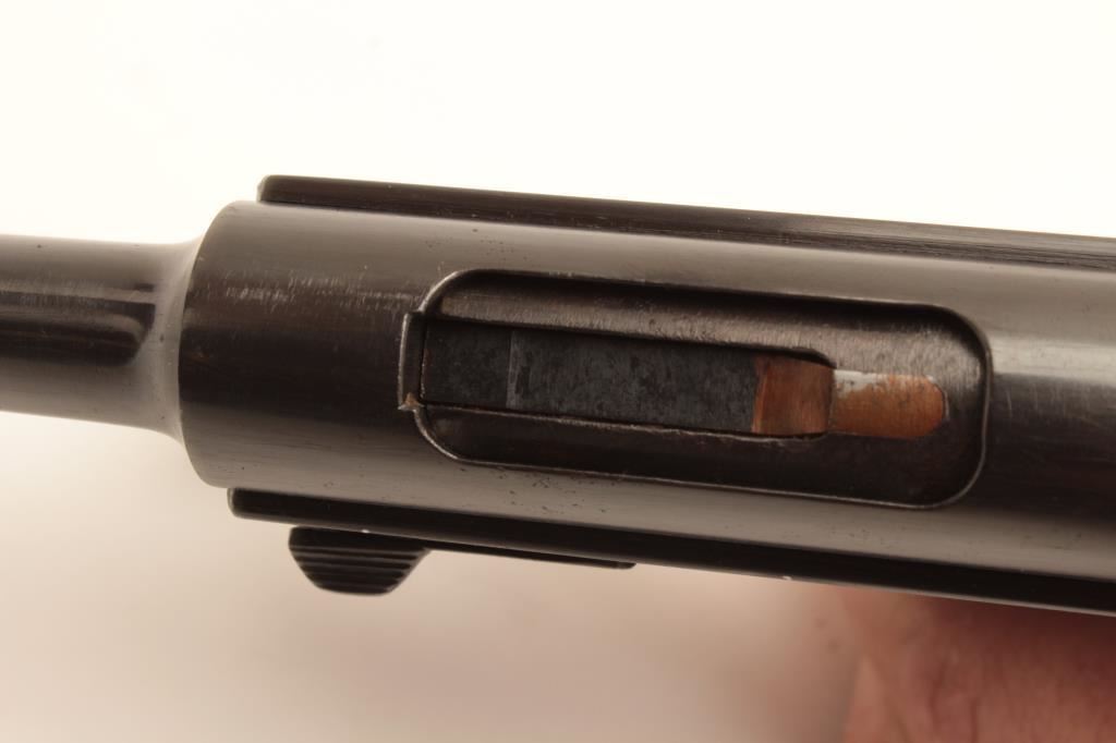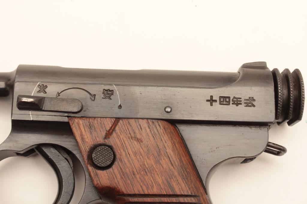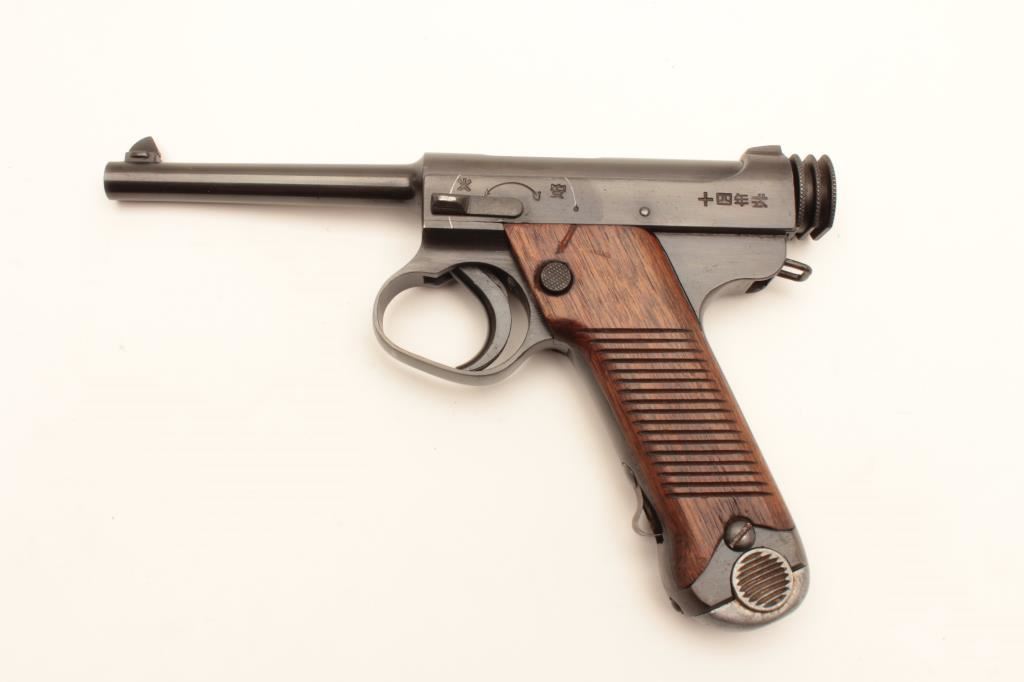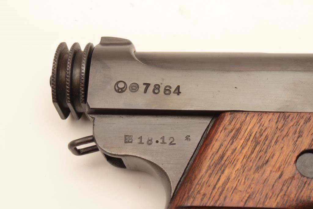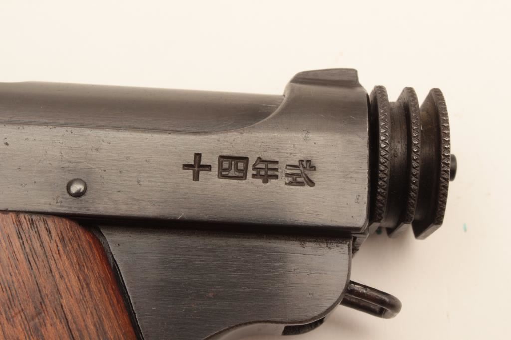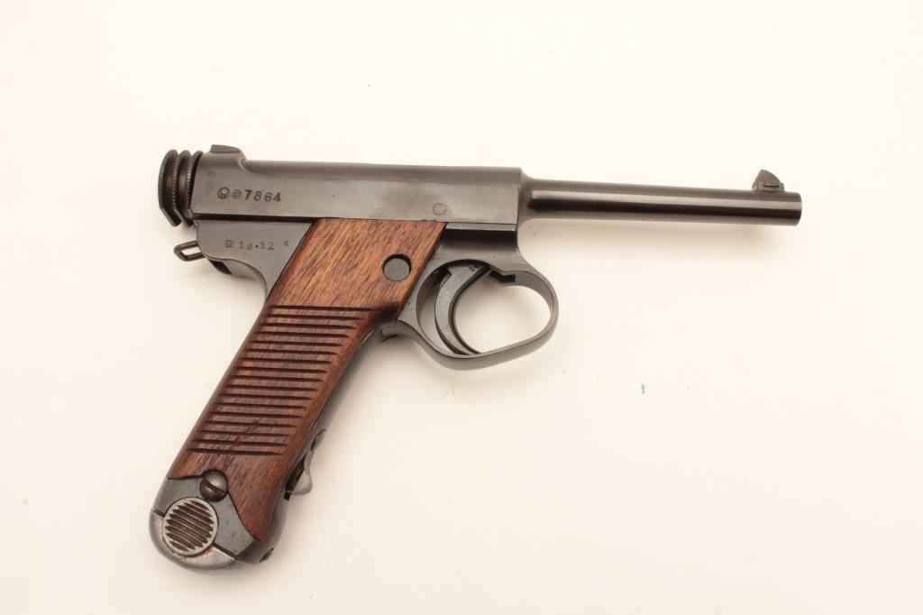 Restored Japanese Nambu semi-automatic pistol, 8mm caliber, 4.5” barrel, re-blued finish, wood grips, S/N 7864, 18.12 stamped on rear right side of frame; majority of re-blue finish remains, good grips and markings; good action; accompanied by a reproduction leather “clamshell” holster. (C&R/PPT). Est.: $200-$400.
