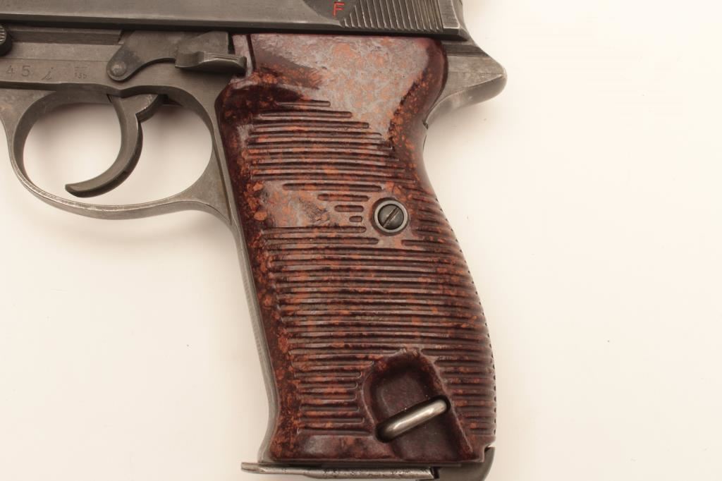 Re-worked German P-38 semi-automatic pistol, byf 43 marked, 9mm caliber, 5” barrel, mat grey finish, brown plastic grips, S/N 45i; overall good condition with good bore, action, markings and grips; accompanied by a reproduction flap leather holster. (C&R/PPT). Est.: $250-$500.