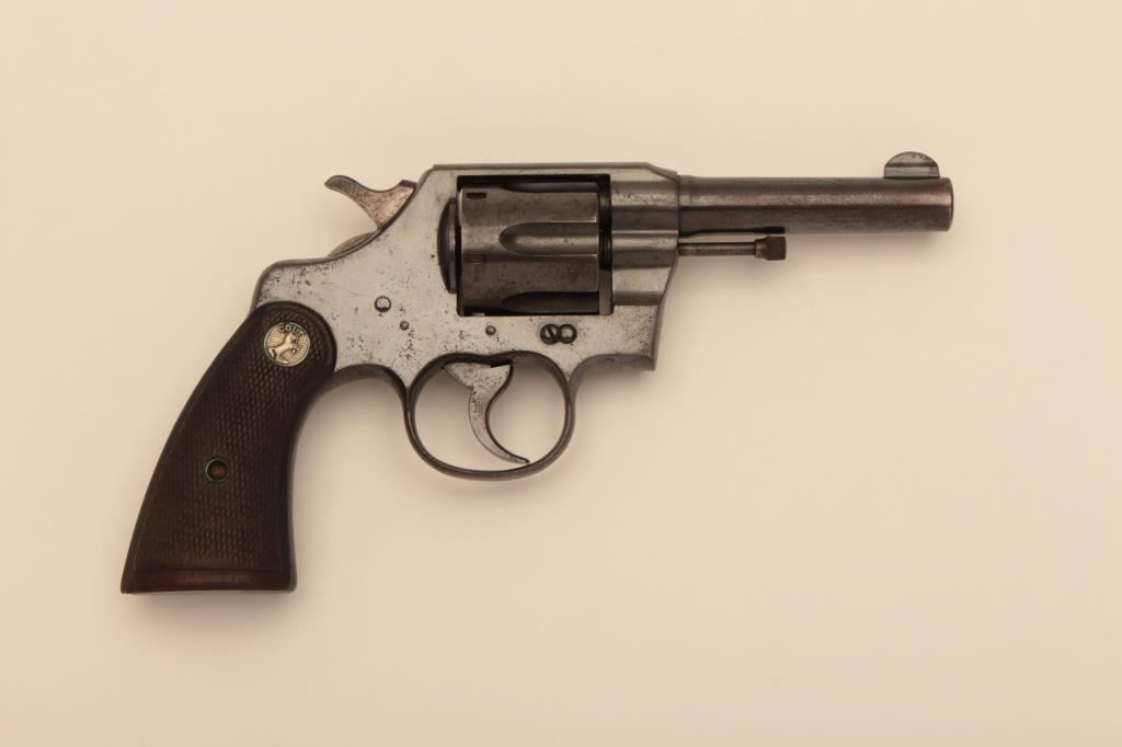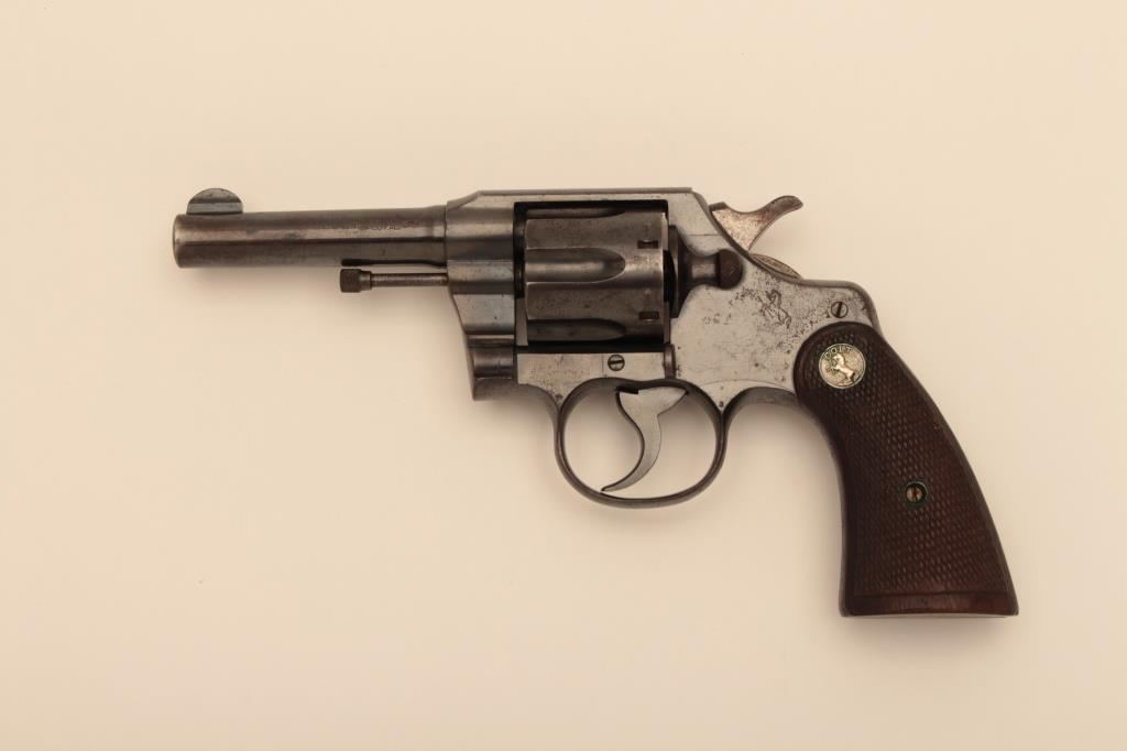 Colt Army Special DA revolver, .38 caliber, 4” barrel, blued finish, checkered wood medallion grips, S/N 509048; overall good to very good condition displaying majority of original blued finish with some scattered light erosion and pinprick pitting, very good bore, crisp action and markings, very good grips; would benefit from a careful oiling and cleaning as appears to have been in storage for quite a while. (C&R/PPT). Est.: $300-$500.