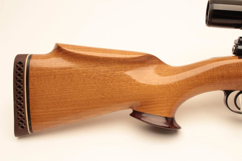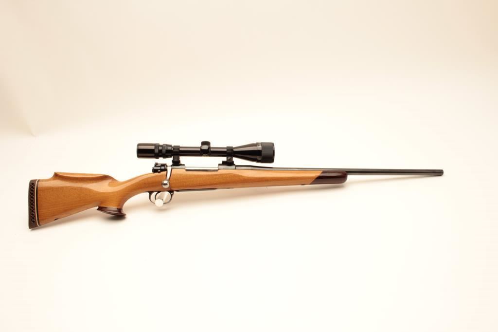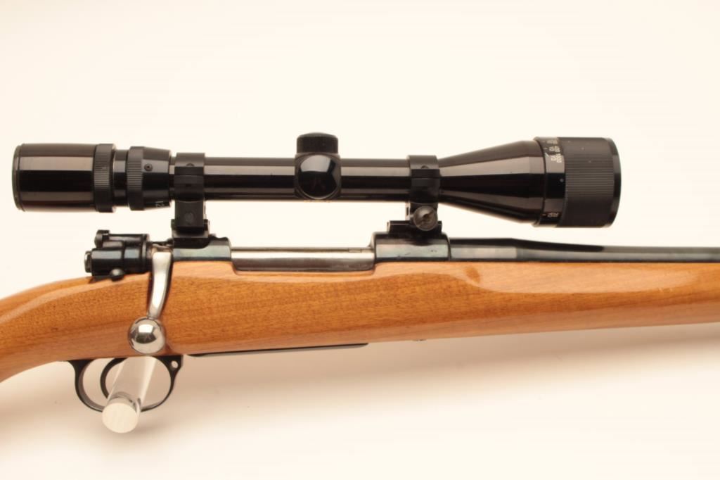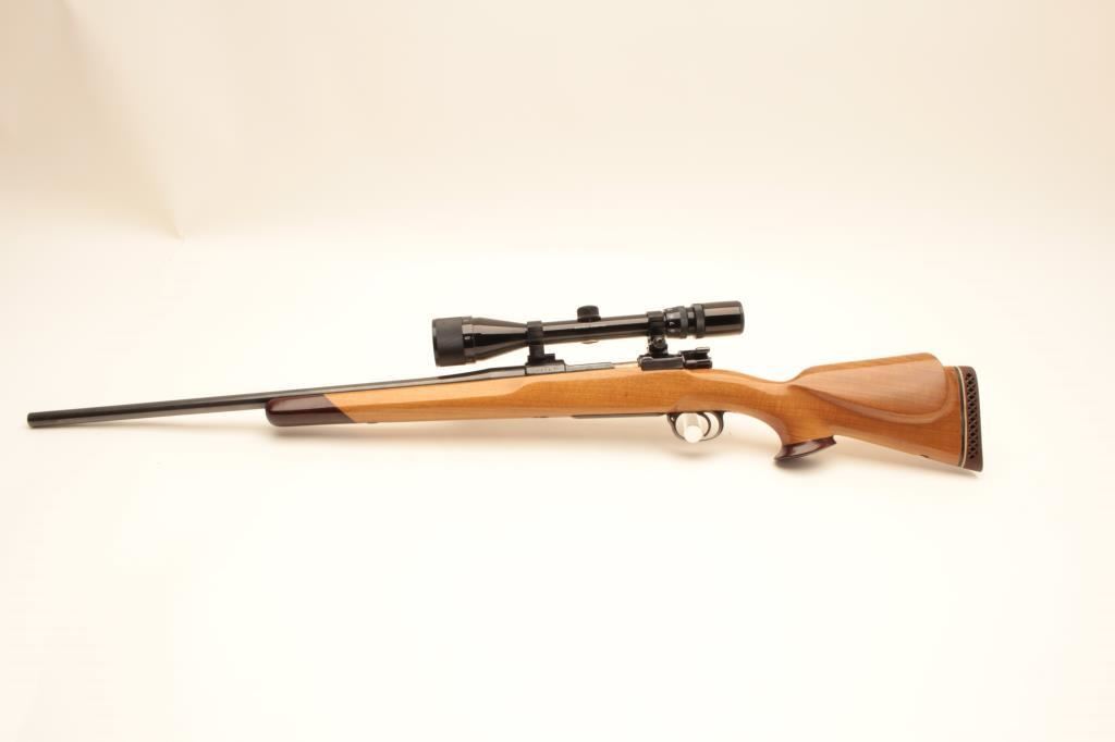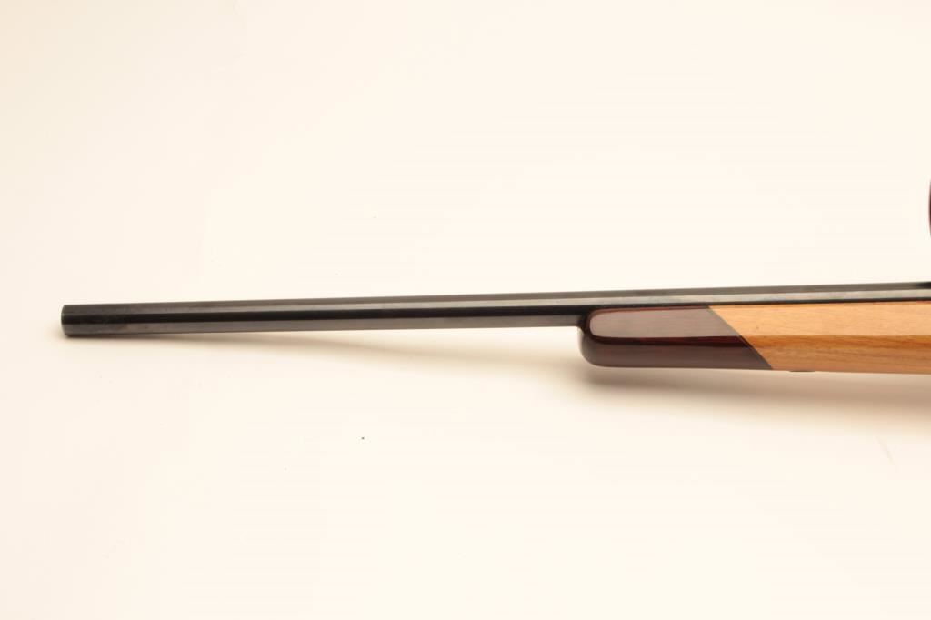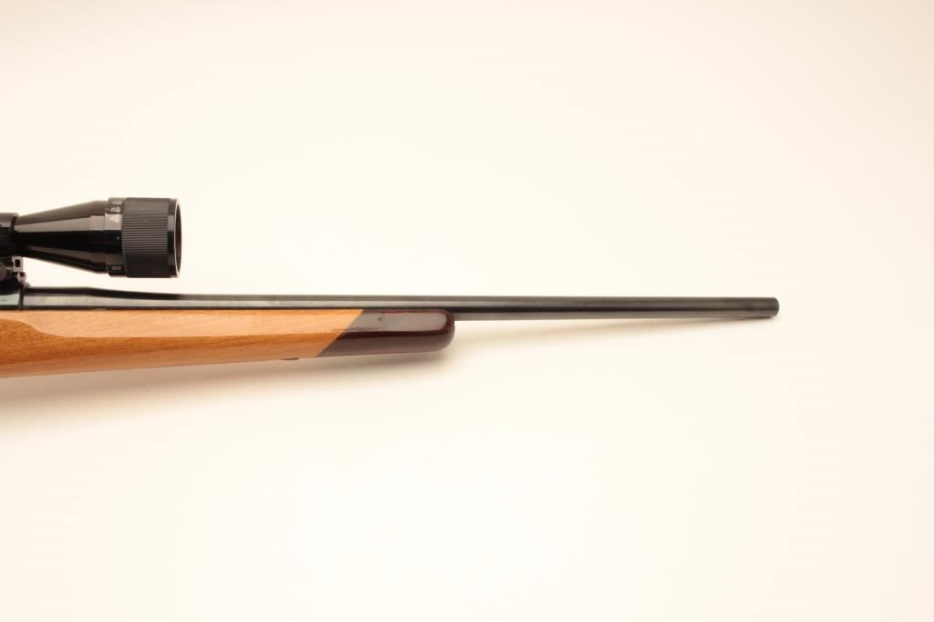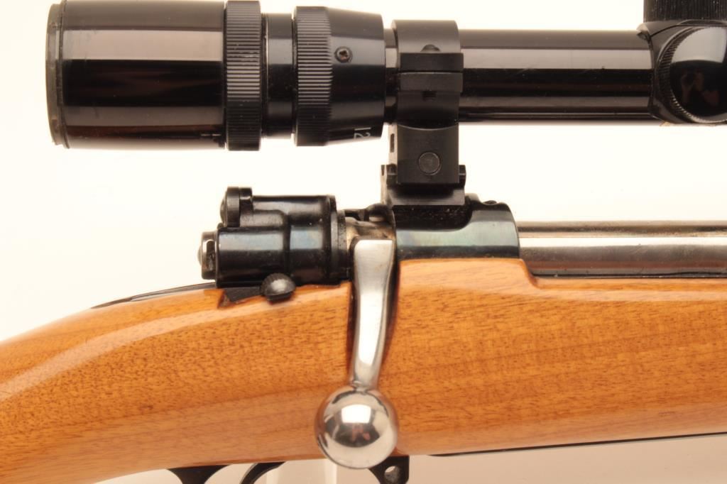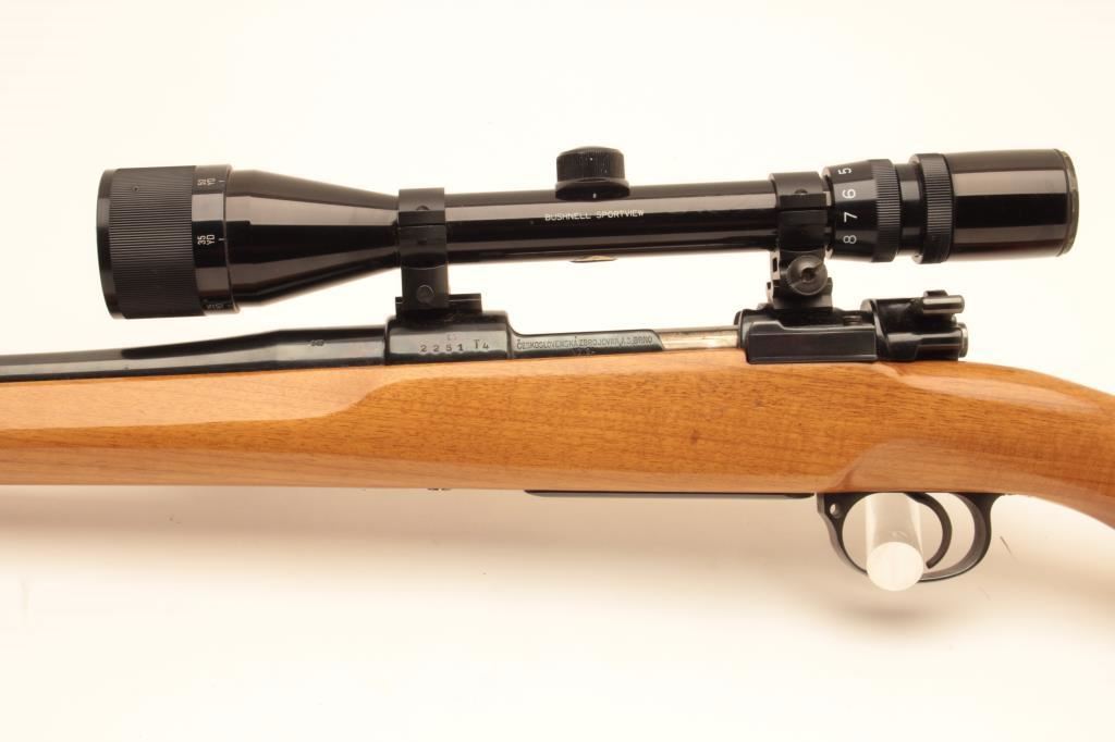 Customized CZ bolt action rifle, .243 caliber, 22.5” barrel, blued finish, custom wood stock, S/N 2251 T4, mounted with a Bushnell Sportview scope displaying crisp optics; gun is in overall very good condition as sporterized; very good bore, action, markings and wood stock. (Modern/PPT). Est.: $300-$600.