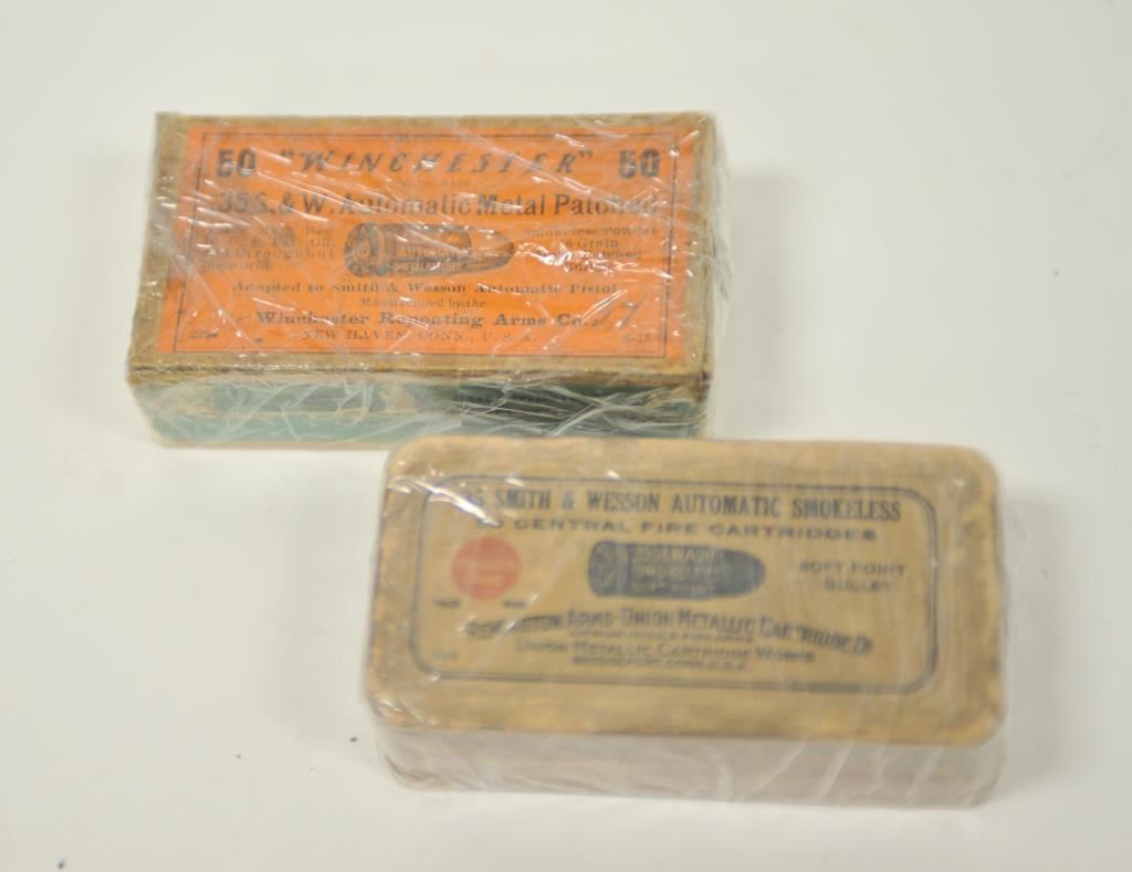 Lot of 2 boxes of collectible .35 Smith & Wesson center fire cartridges, one by Remington/UMC; the other by Winchester; both boxes wrapped in cellophane. Est.: $150-$300.