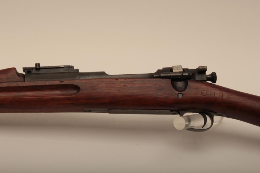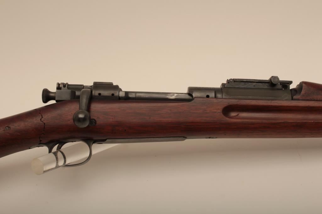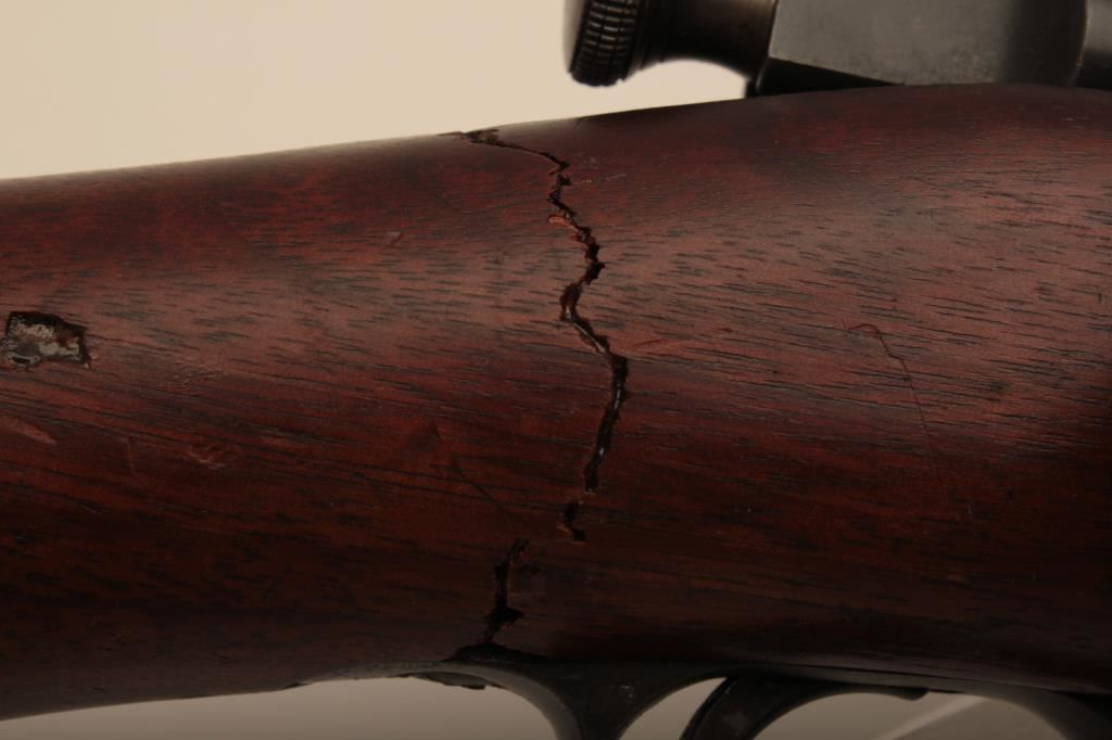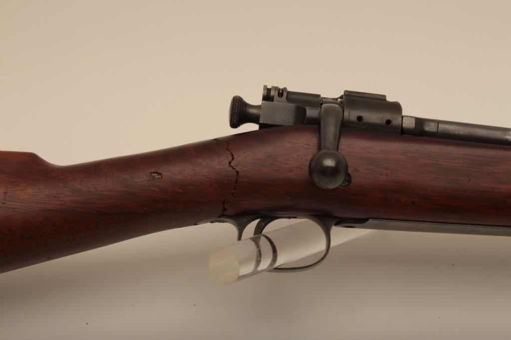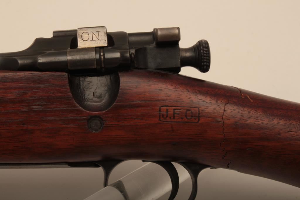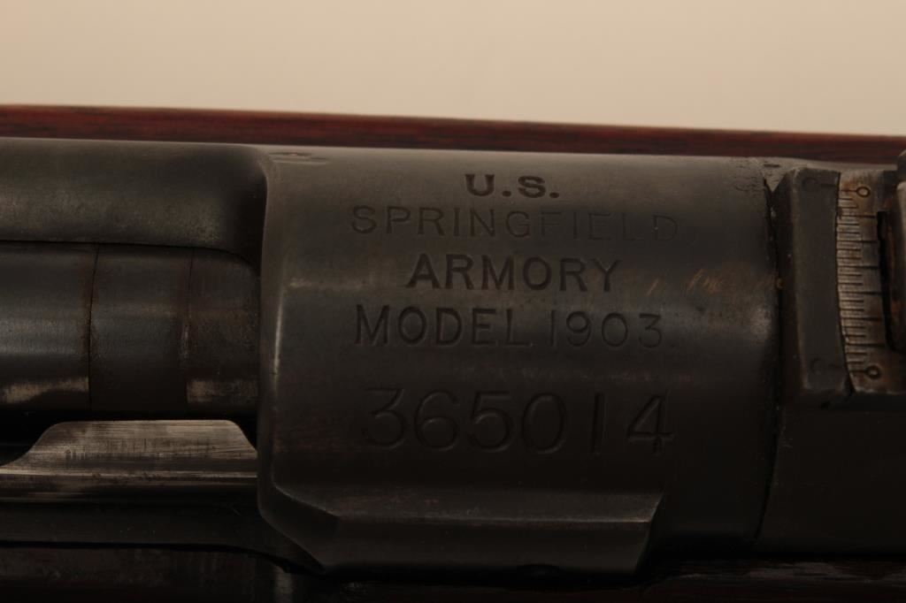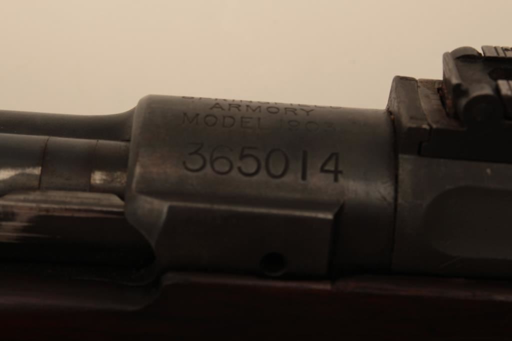 U.S. Springfield Model 1903 bolt action rifle, .30-06 caliber, 24” barrel marked HS/flaming bomb/7-44; military finish to metal surfaces, good bore, good markings, cleaning kit in butt trap, stock shows circle P proof and J.F.C. inspector’s cartouche; wrist of stock is broken behind top strap/trigger guard. (C&R). Est.: $250-$500.