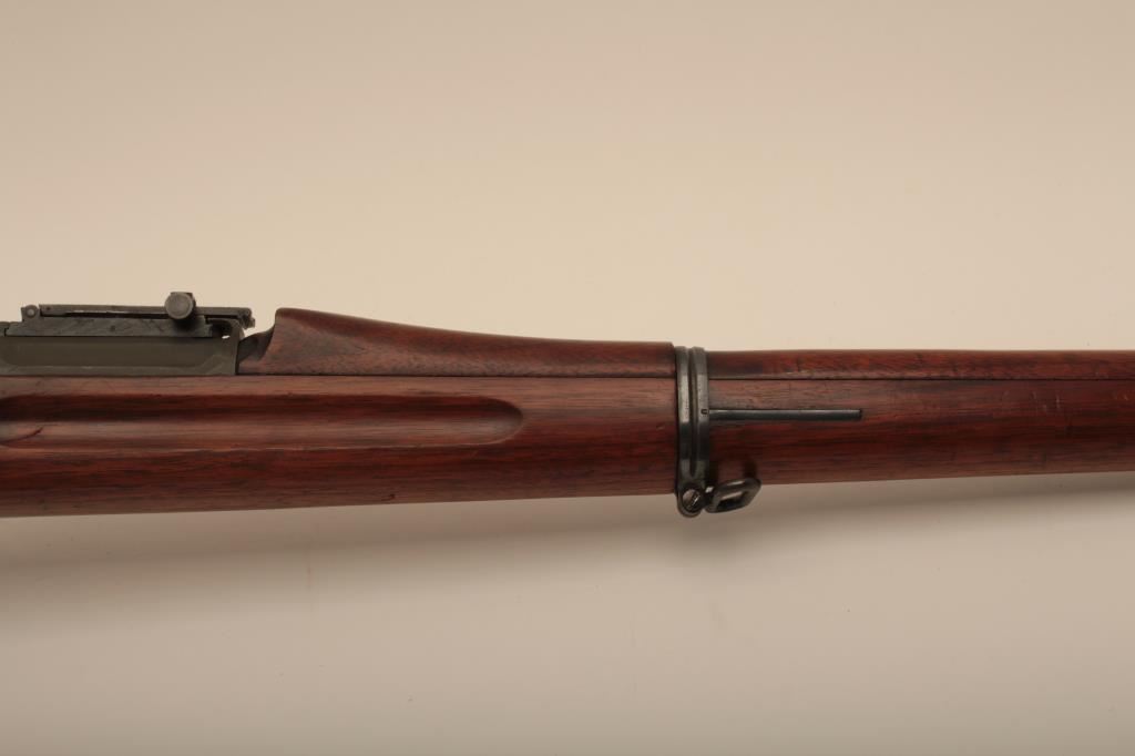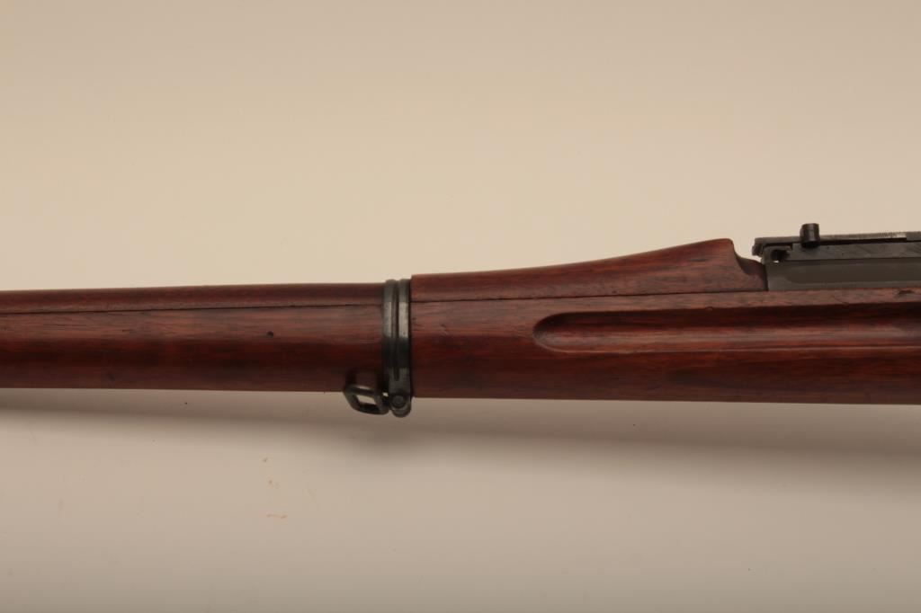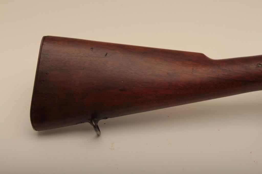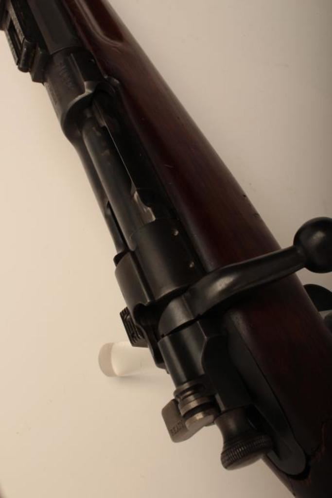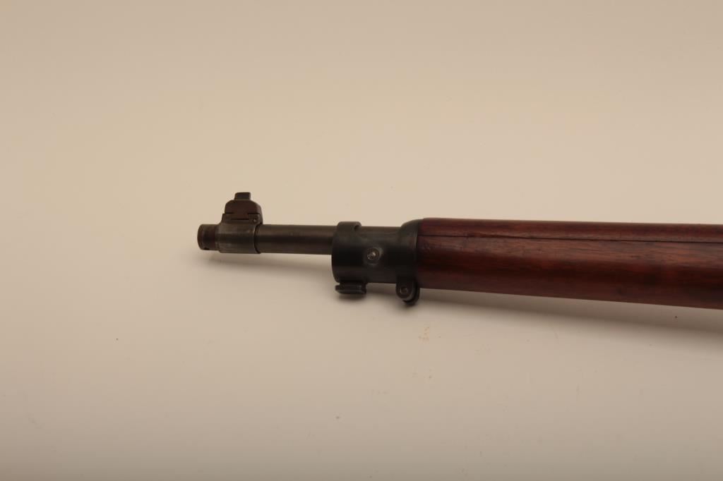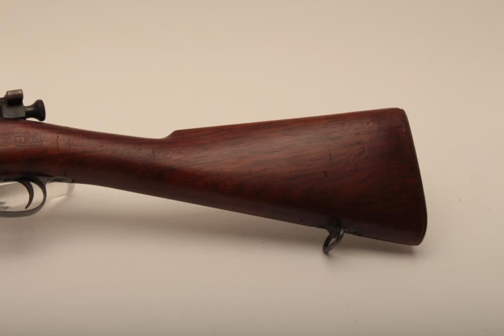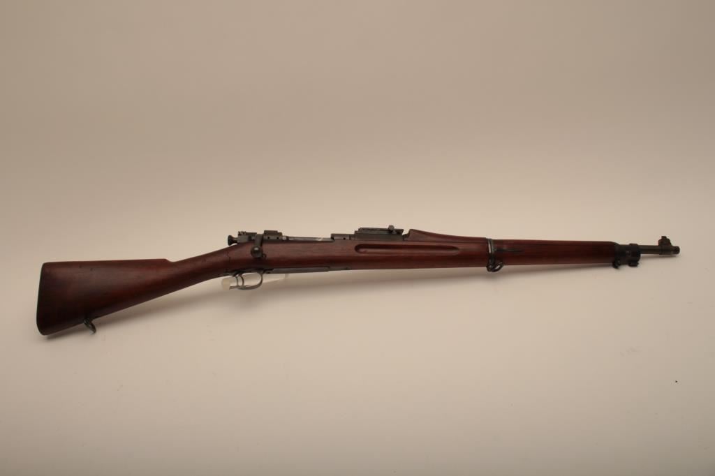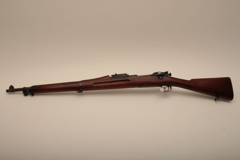 U.S. Springfield Model 1903 bolt action rifle, .30-06 caliber, 24” barrel marked HS/flaming bomb/7-44; military finish to metal surfaces, good bore, good markings, cleaning kit in butt trap, stock shows circle P proof and J.F.C. inspector’s cartouche; wrist of stock is broken behind top strap/trigger guard. (C&R). Est.: $250-$500.