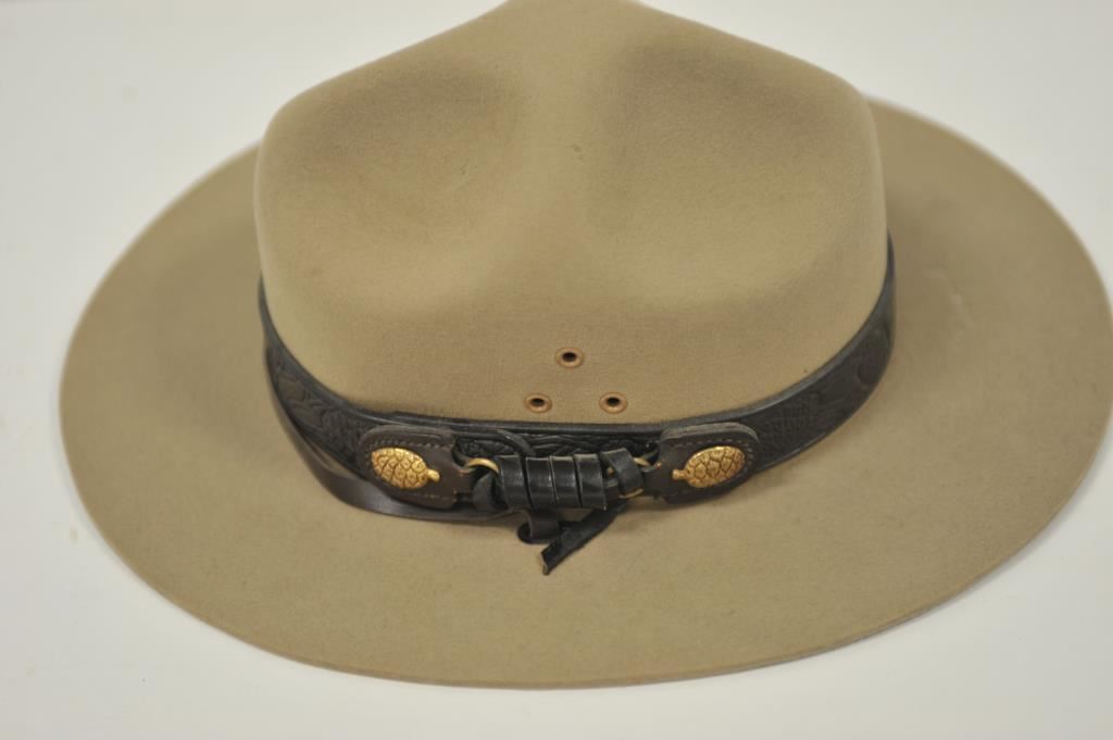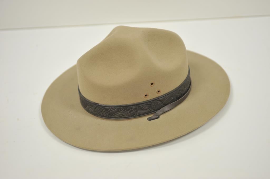 U.S. National Park Service “Ranger” style hat, size 7-3/8 by Stratton, very good to fine condition with USNPS tooled leather band and chin strap. Est.: $75-$150.