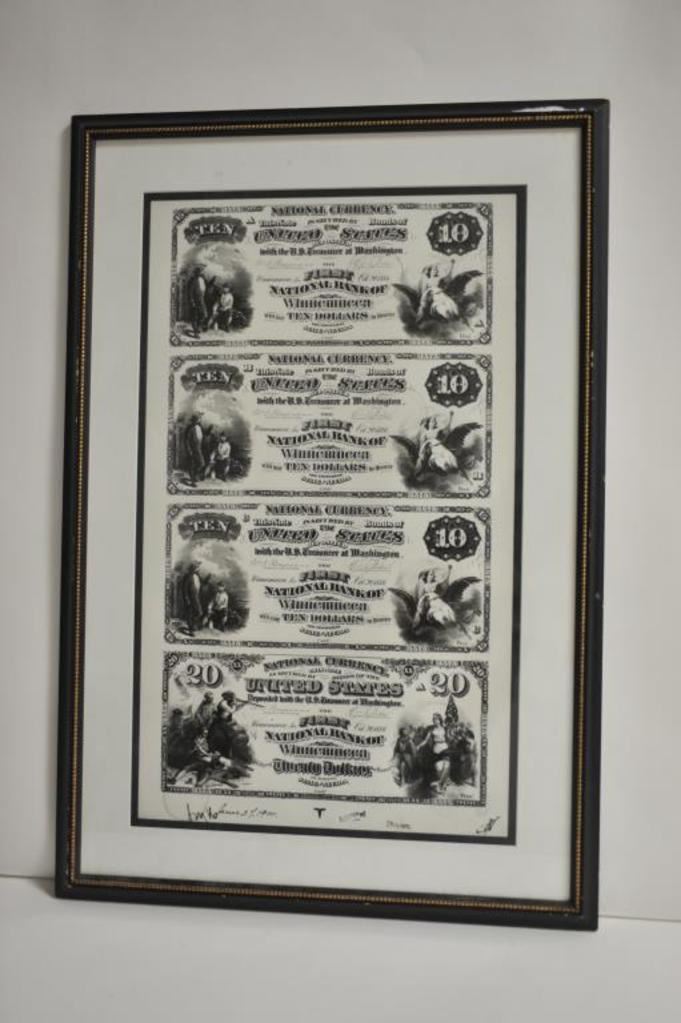 Framed and matted reprint of mint sheet of U.S. currency; approximately 29” x 19”. Est.: $50-$100.