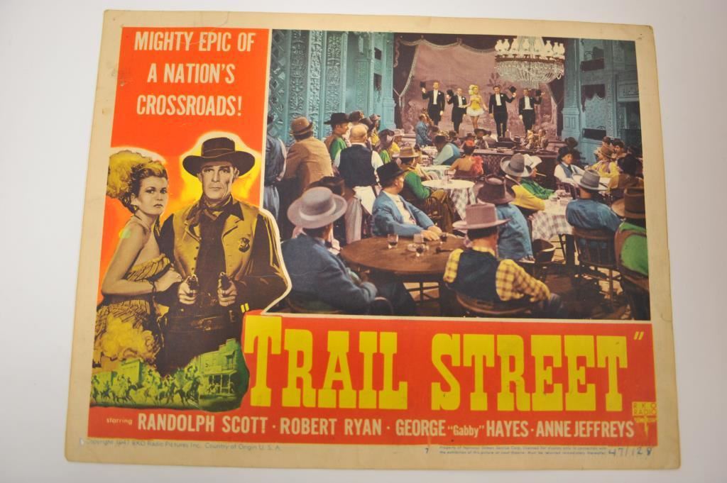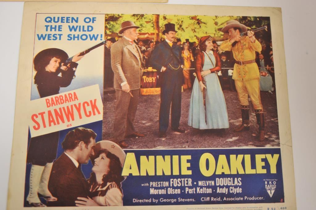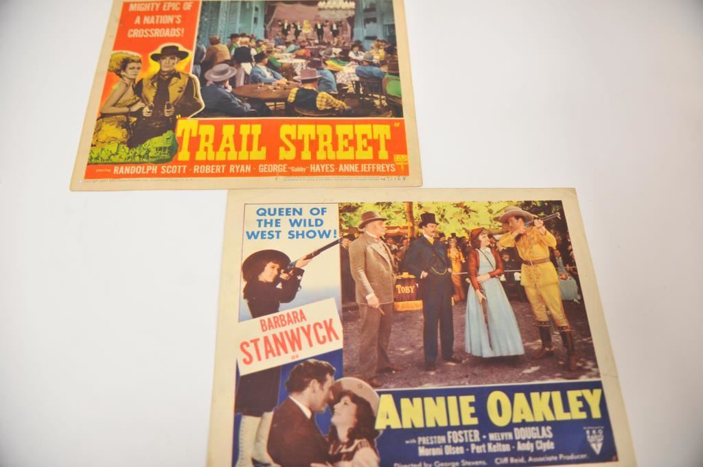 Lot of 2 lobby cards advertising western films. Both original. 1. “Annie Oakley” starring Barbara Stanwyck. Measuring 11” x 14”. 1952 dated (R-52 /1400 marked) and RKO Studios. Good condition with minor discoloration and slight damage. 2. “Trail street” starring Randolph Scott, Robert Ryan and “Gabby” Hayes”. Measures 11” x 14”. Dated 1947 RKO Studios. #47/128. Good condition with minor discoloration and slight damage. Est.: $50-$100