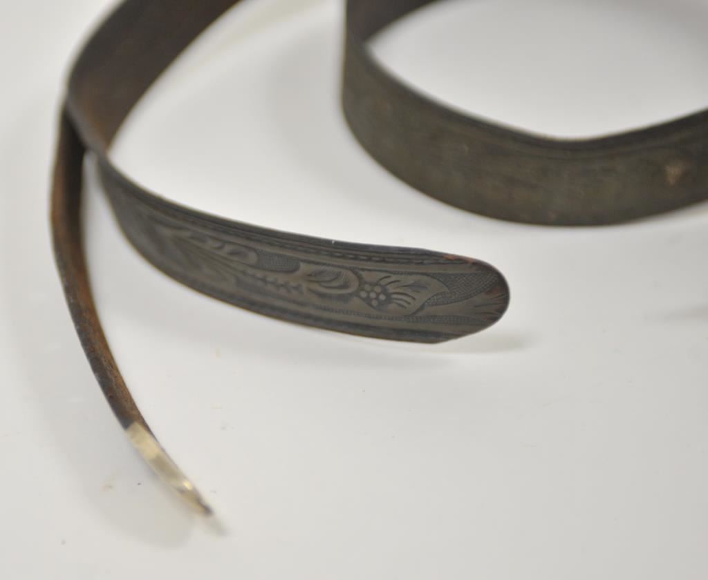 Vintage buckle and belt set signed “Diablo” and sterling includes keepers and tab. Tooled vintage belt measuring 1 1/8” wide. Worn engraving. Est.: $75-$150