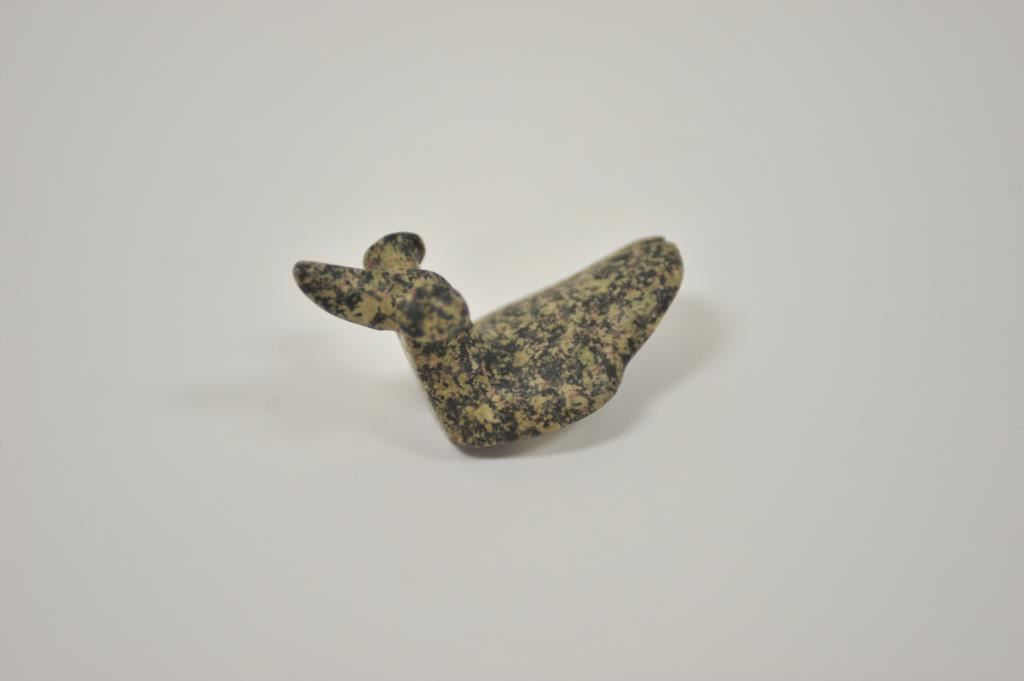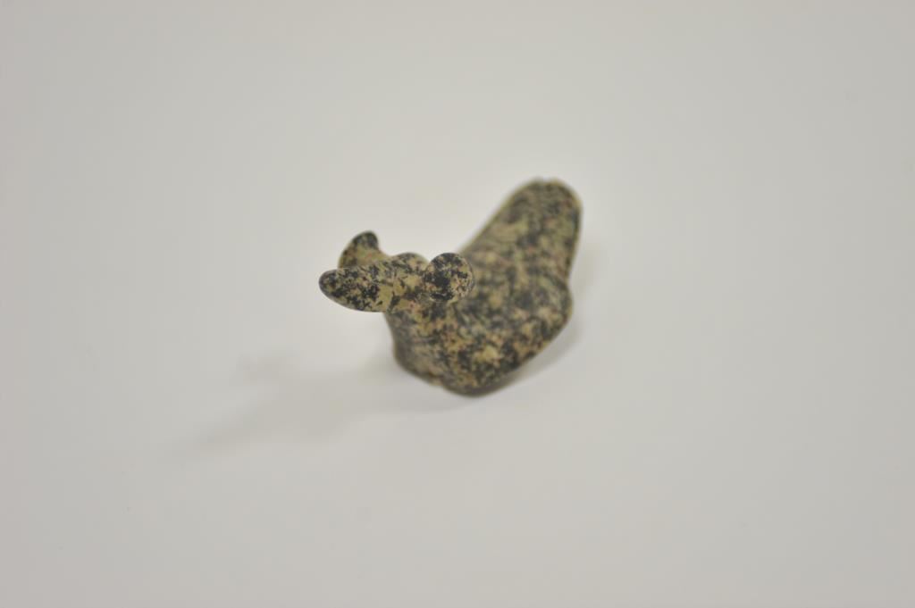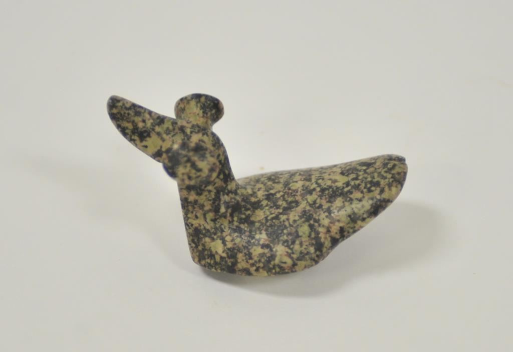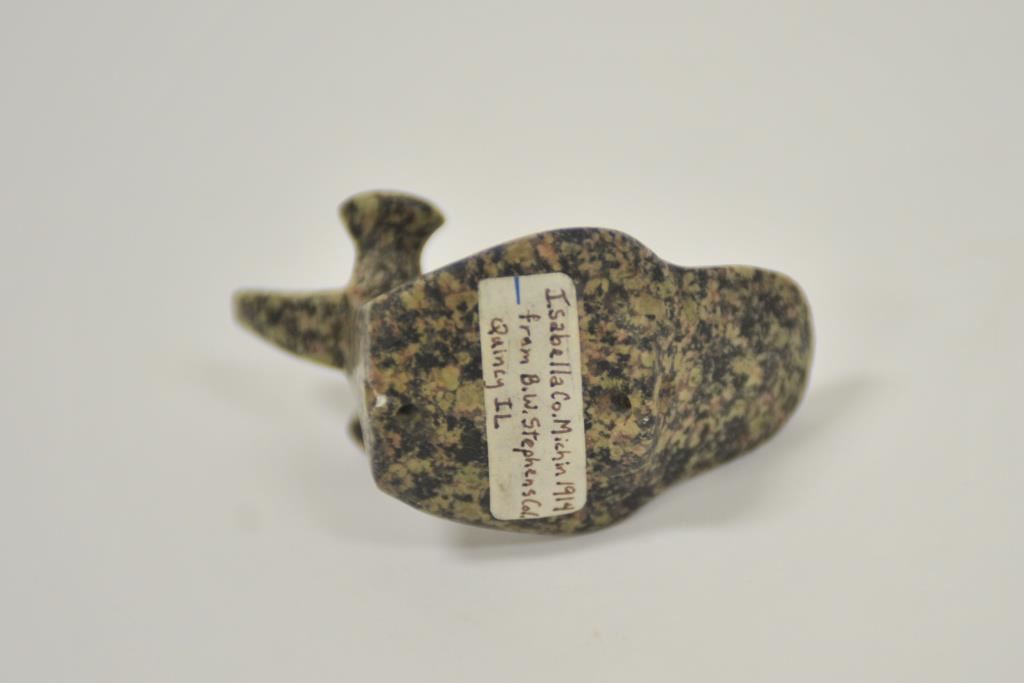 Carved old stone effigy of bird, approximately 3” x 2” overall with old tag on bottom “Isabella Co. Mich. in 1914 from B.W. Stephens Col./Quincy IL.”. Est.: $100-$200.