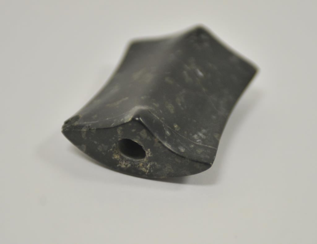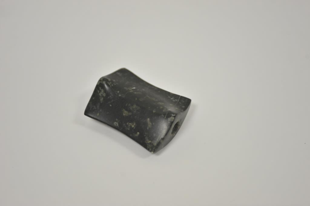 Shaped and polished old stone piece with vertical hold thru center approximately 3” x 2.5” overall appearing to be some type of weapon or axe head. Est.: $75-$125.
