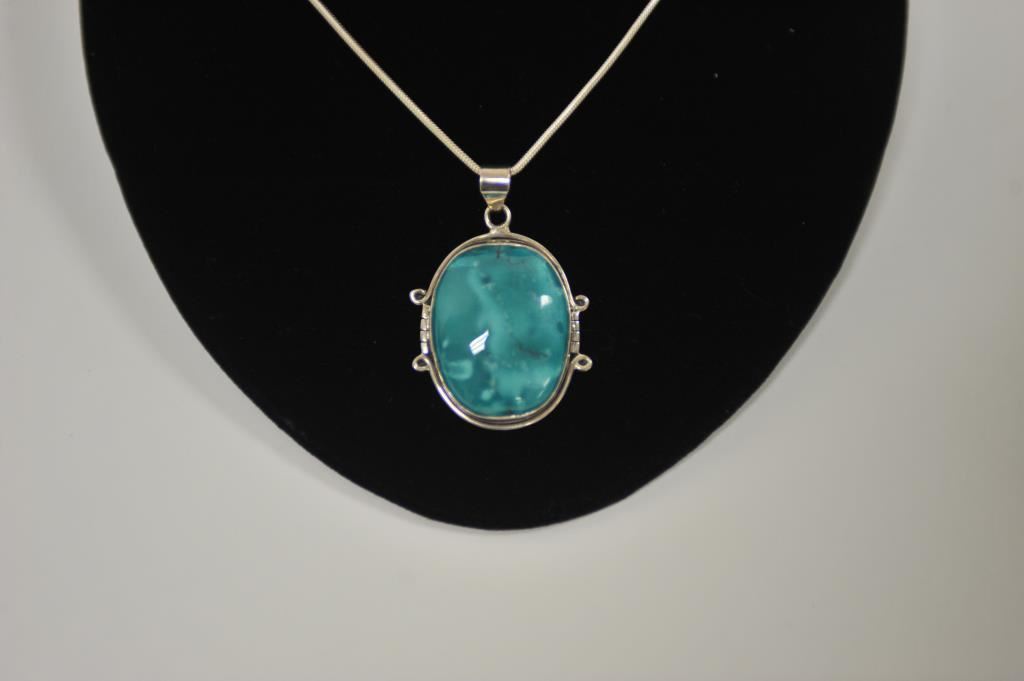 Sterling silver turquoise pendant necklace, approximately 1.75” X 1.5” with beautiful stone, bezel and neck strap. Est.: $300-$500.