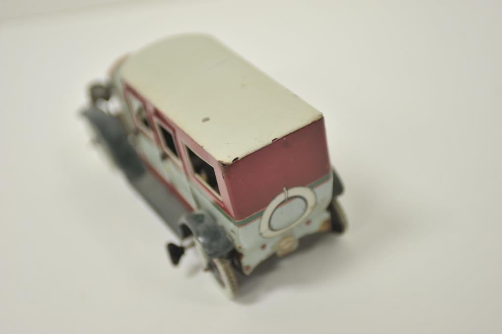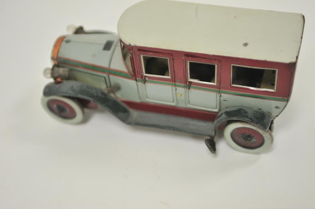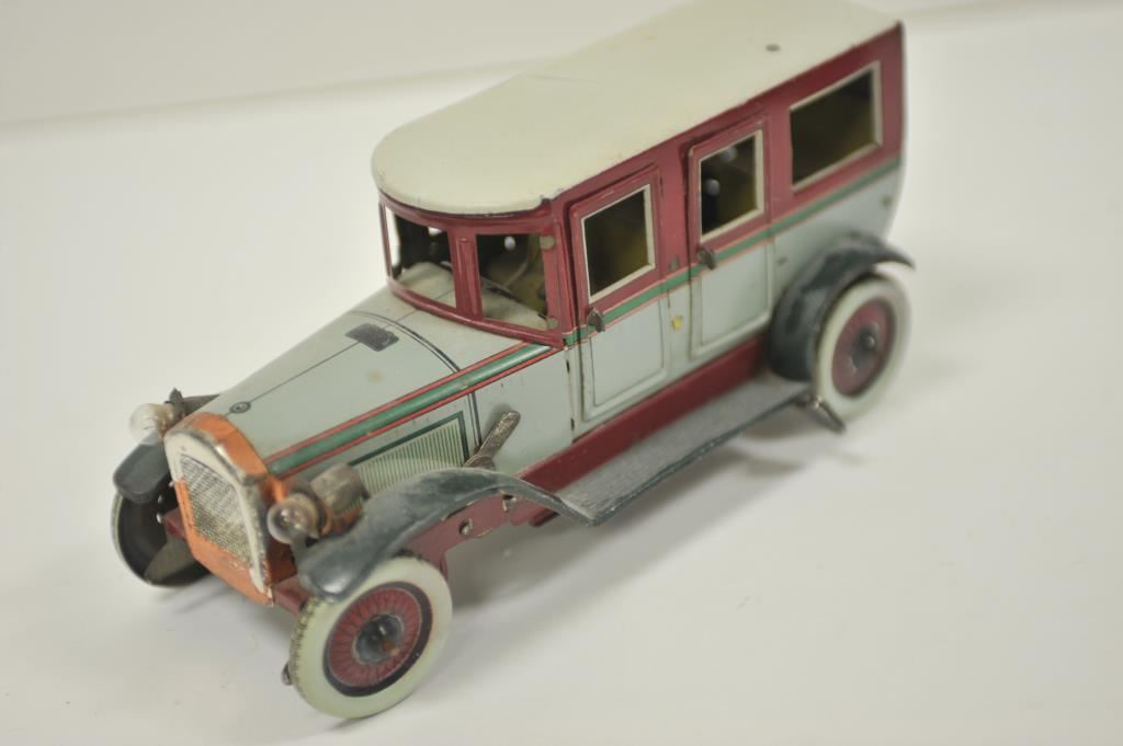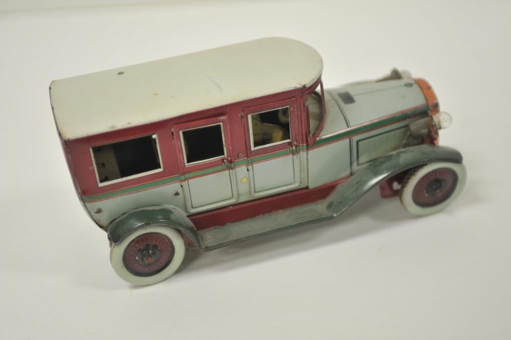 German-made antique wind-up tin toy truck and driver with majority of original paint remaining; set up for battery to work headlights. Est.: $300-$600.