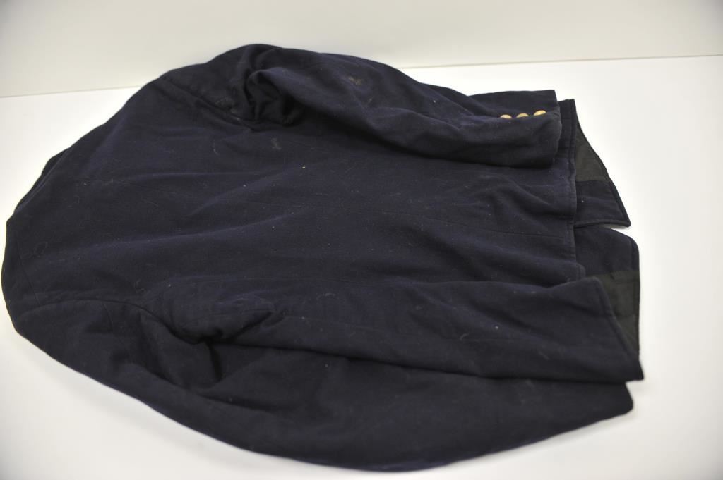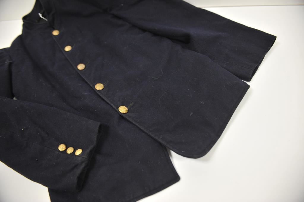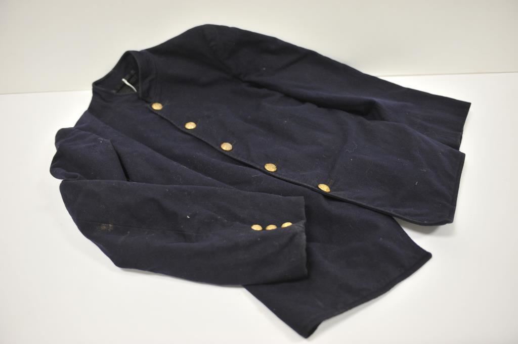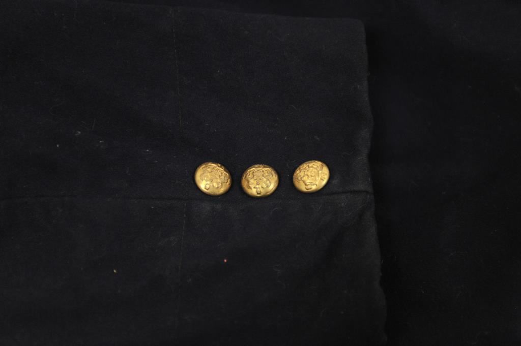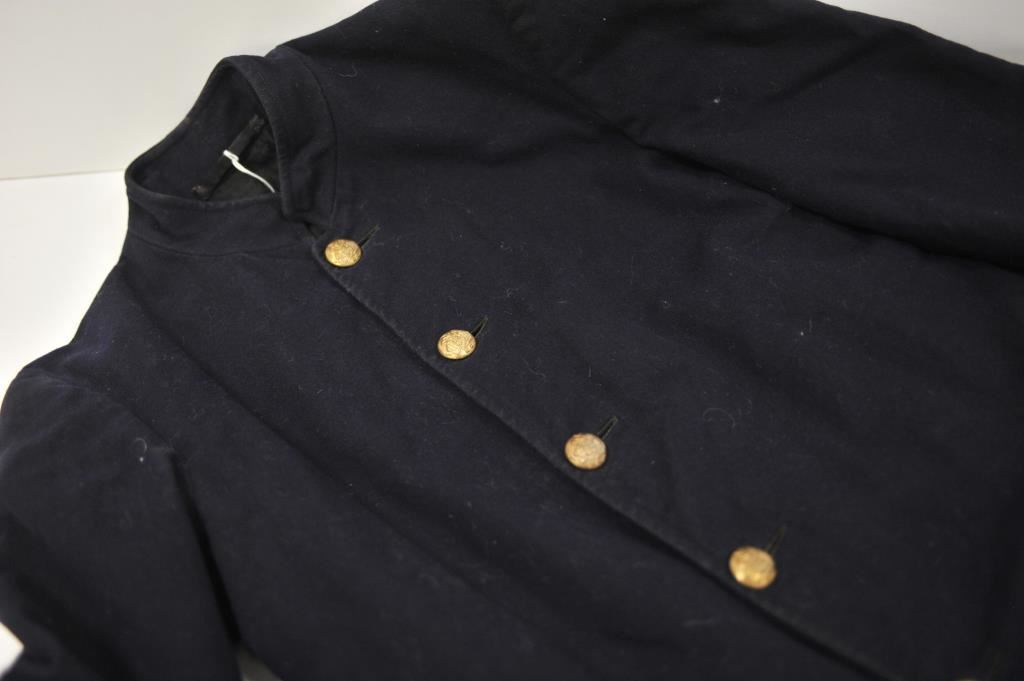 Dark blue medical jacket with “N.C.” (North Carolina?) brass buttons; overall good condition; may be an older reproduction; no makers tag inside collar area; from an estate. Est.: $100-$200.