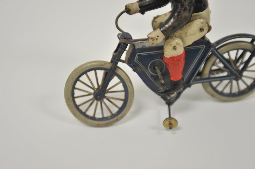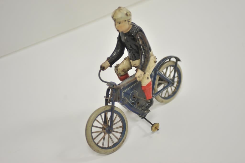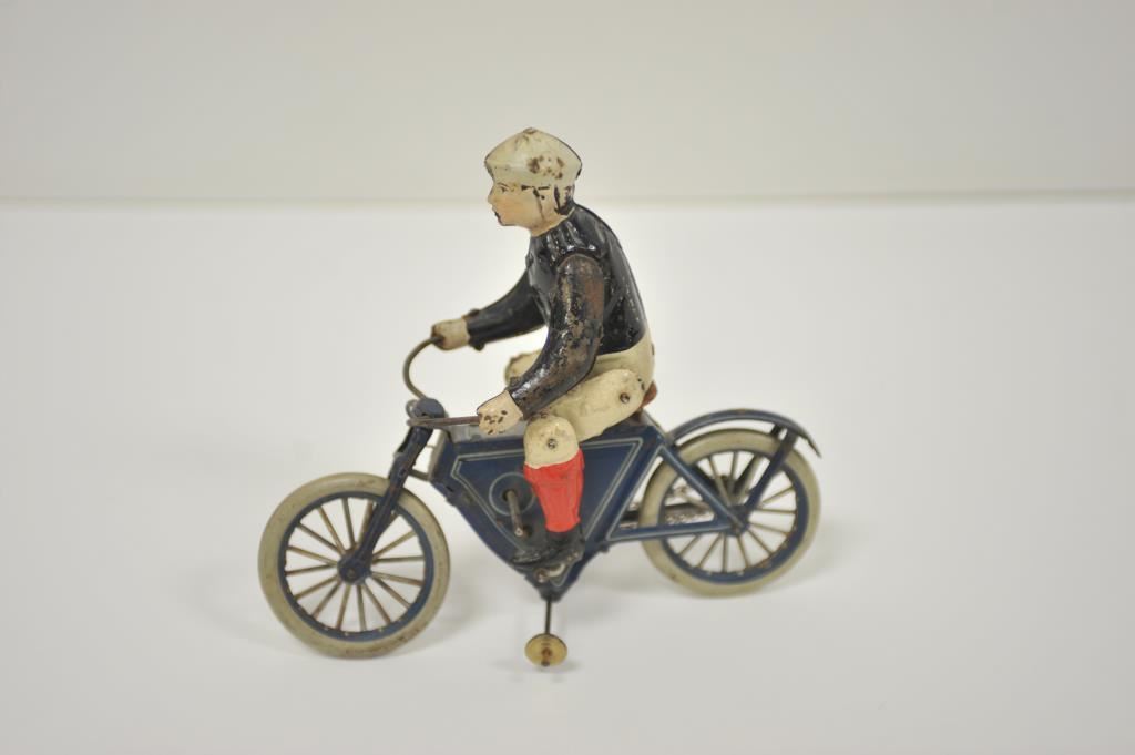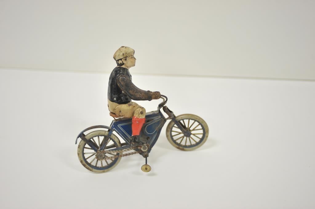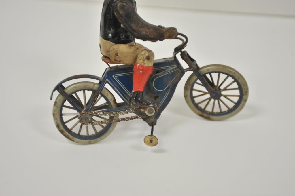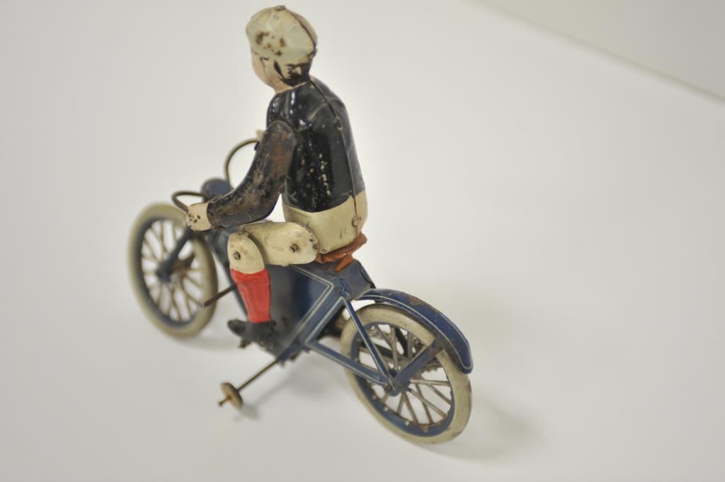 Antique tin wind-up toy motorcycle and rider, approximately 8.5” long, 3” wide and 7.5” in height; majority of original paint remains. Est.: $175-$350.