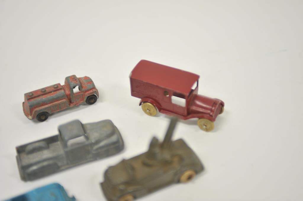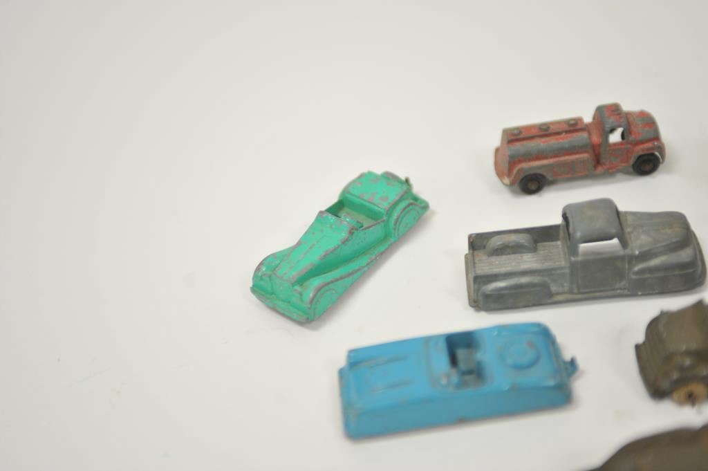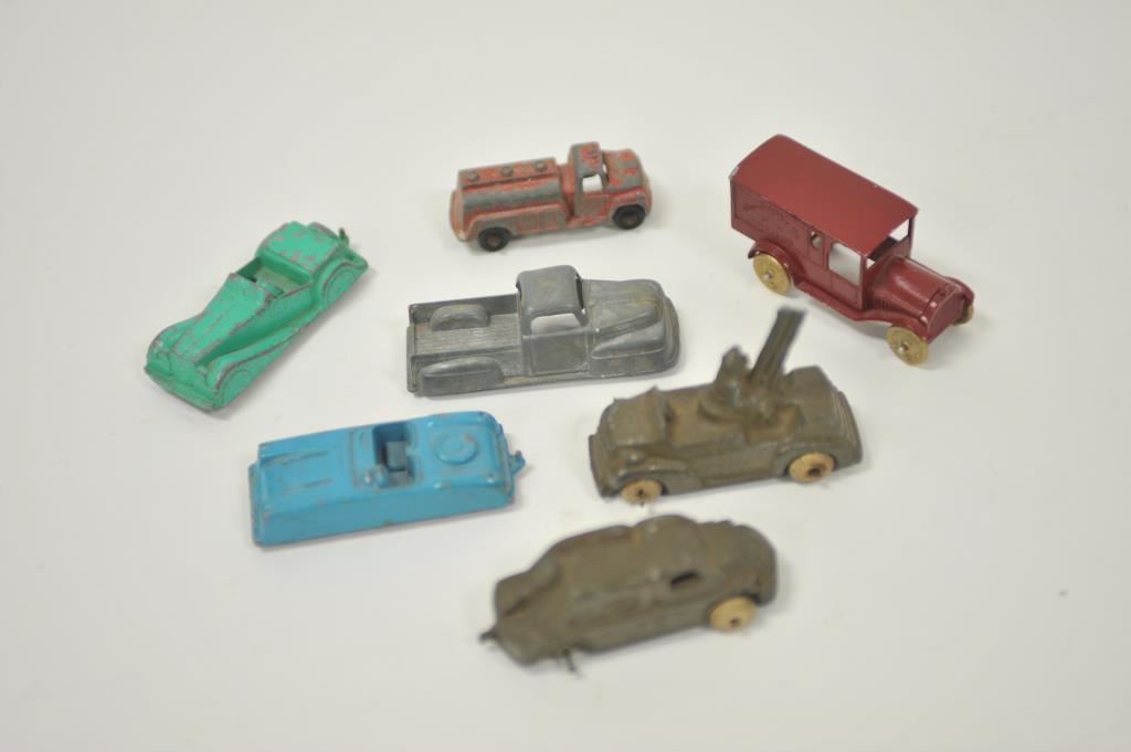 Lot of 7 small metal old collectible toy vehicles, each approximately 3” in length; some cars, trucks and two military vehicles (one vehicle missing one wheel). Est.: $50-$100.