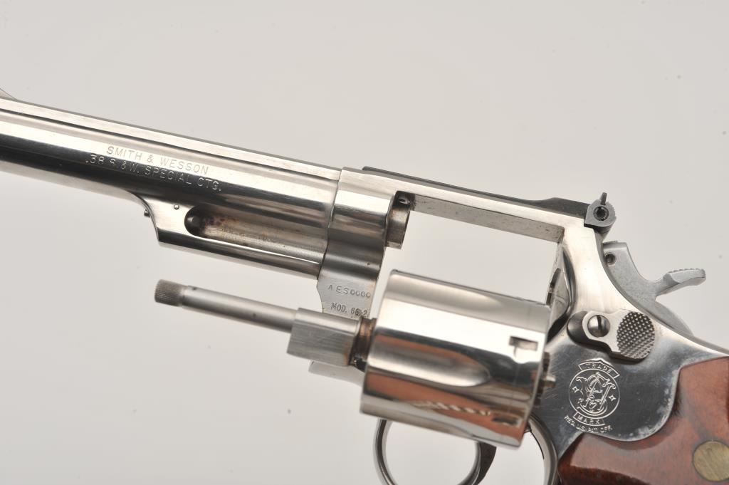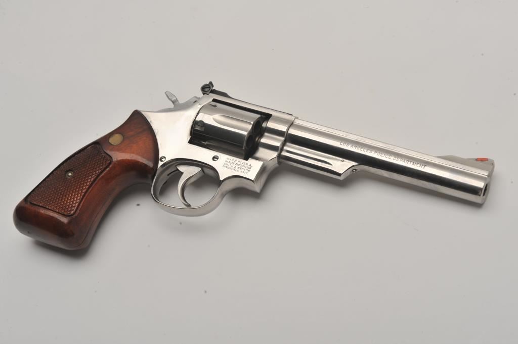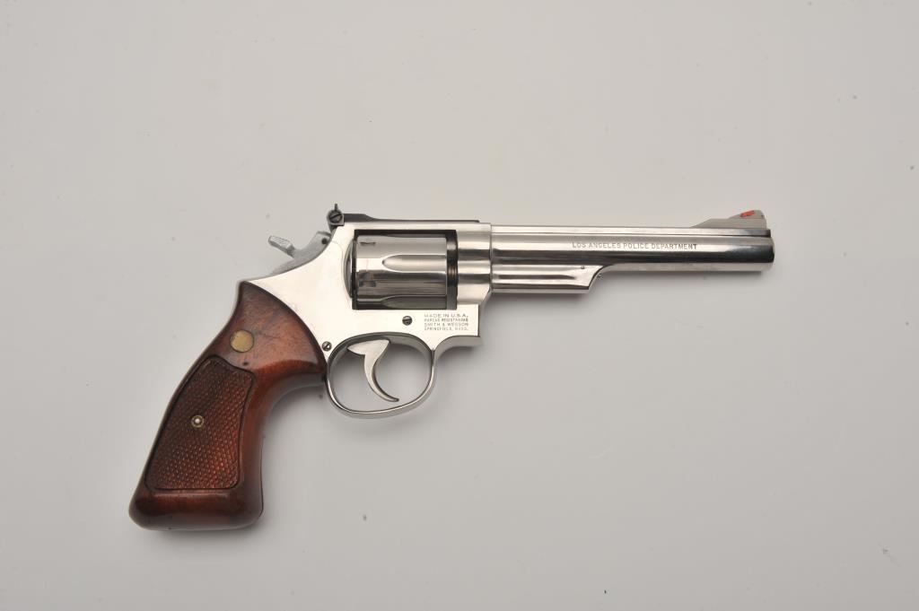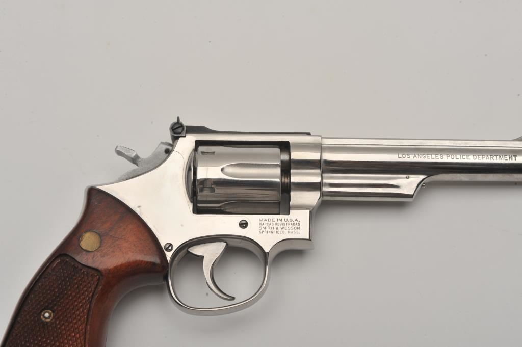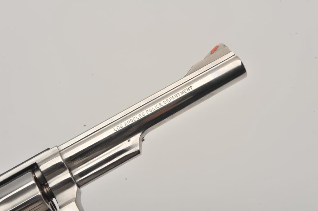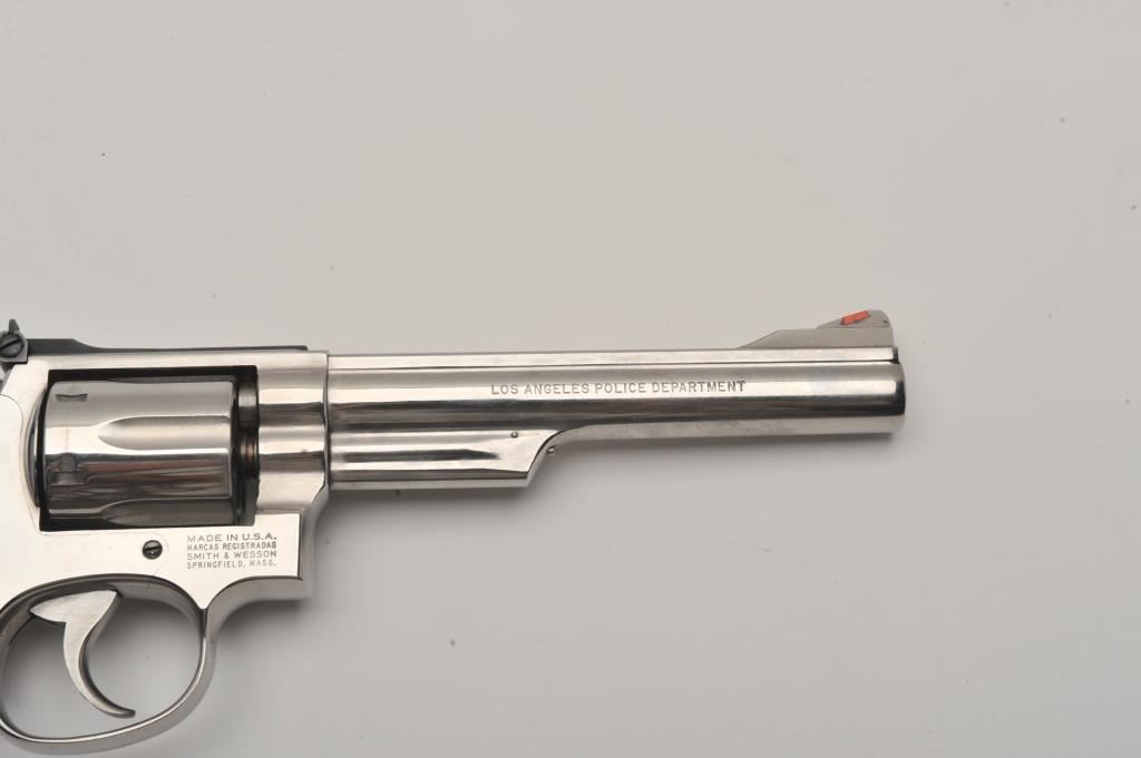 Smith & Wesson Model 68-2 Los Angeles Police Department Commemorative revolver, .38 Special caliber, Serial #AES0000. The pistol is in very good to nearly fine overall condition with a 6” barrel with a red ramp front and adjustable rear sights. The pistol retains nearly all of its polished stainless steel finish with light holster wear at the muzzle and small scratches. The right side of the barrel is marked, “LOS ANGELES POLICE DEPARTMENT”. The checkered wood medallion grips are in very good condition with sharp checkering. The bore is good, the action crisp and markings are sharp. The lot includes the original blue cardboard factory box and associated packaging materials. Est.: $400-$800. (Modern/PPT).