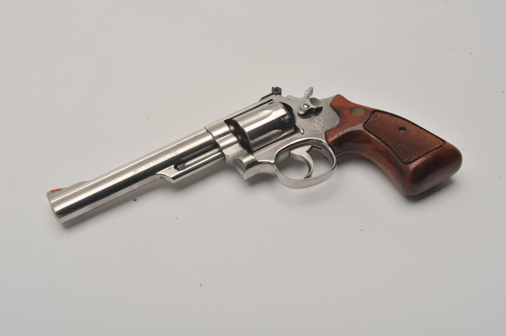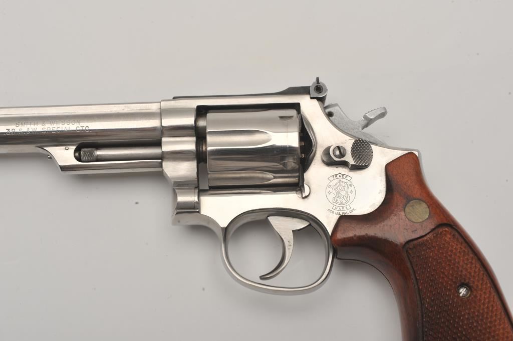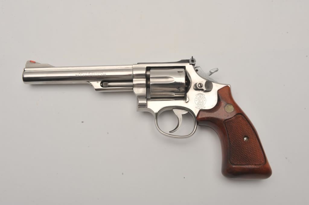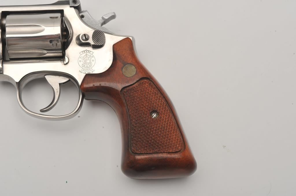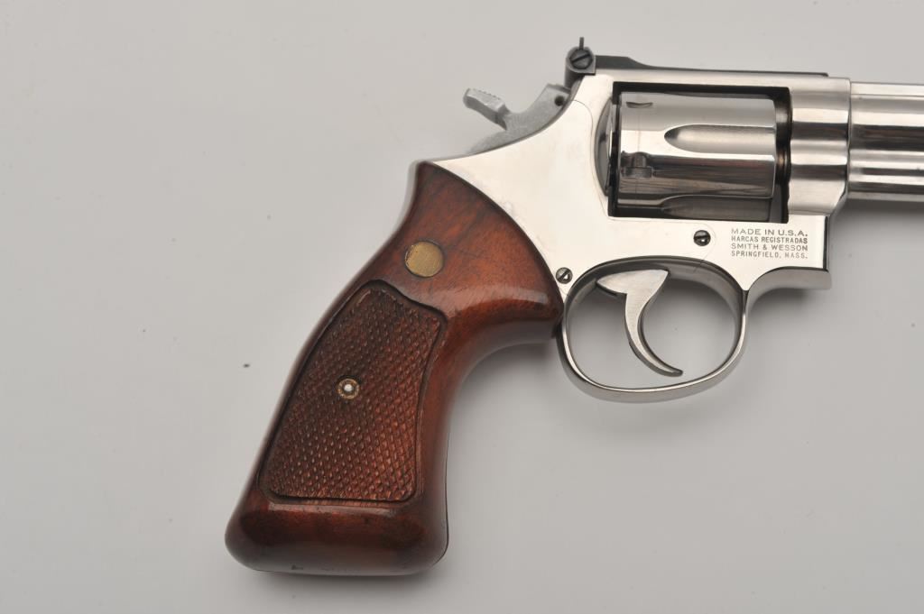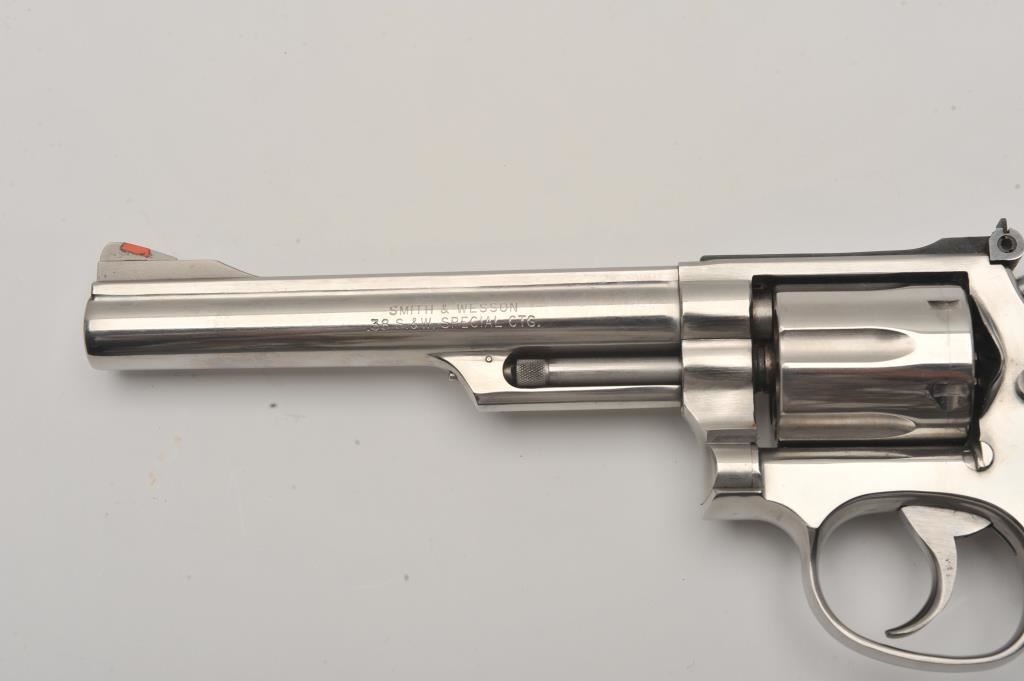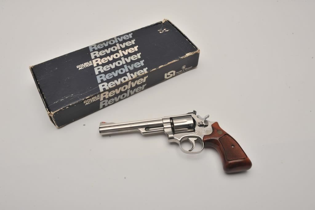 Smith & Wesson Model 68-2 Los Angeles Police Department Commemorative revolver, .38 Special caliber, Serial #AES0000. The pistol is in very good to nearly fine overall condition with a 6” barrel with a red ramp front and adjustable rear sights. The pistol retains nearly all of its polished stainless steel finish with light holster wear at the muzzle and small scratches. The right side of the barrel is marked, “LOS ANGELES POLICE DEPARTMENT”. The checkered wood medallion grips are in very good condition with sharp checkering. The bore is good, the action crisp and markings are sharp. The lot includes the original blue cardboard factory box and associated packaging materials. Est.: $400-$800. (Modern/PPT).