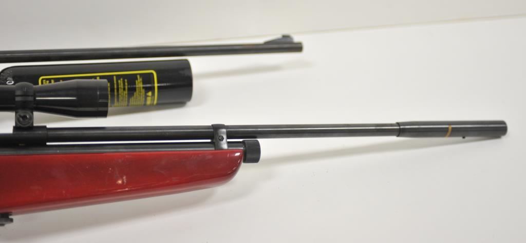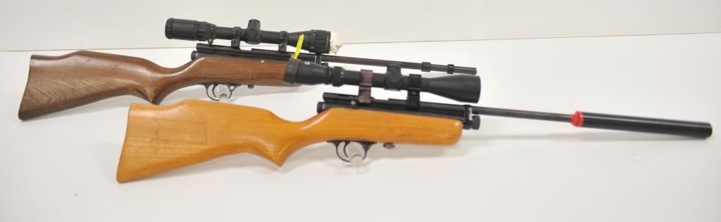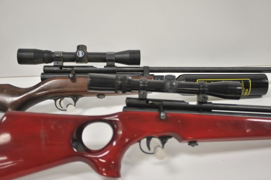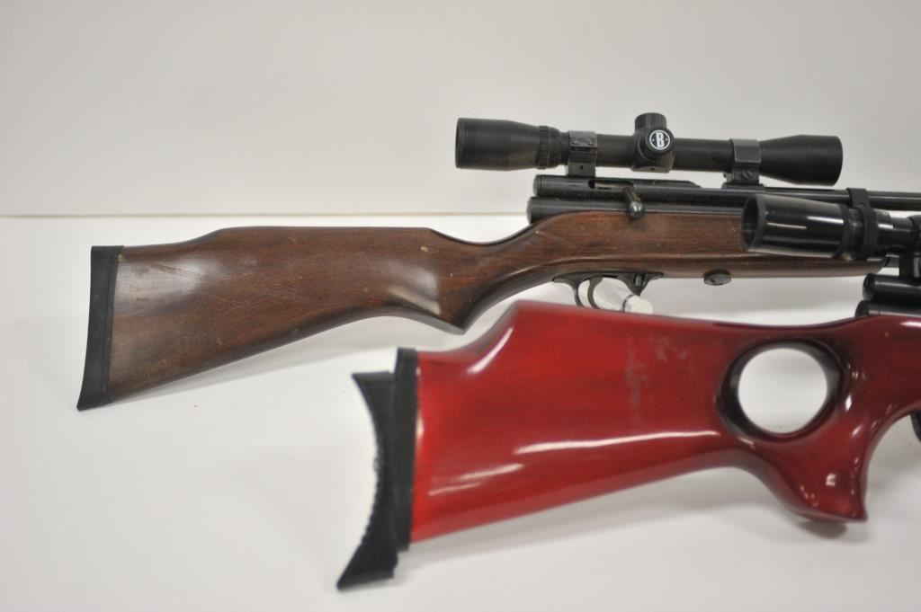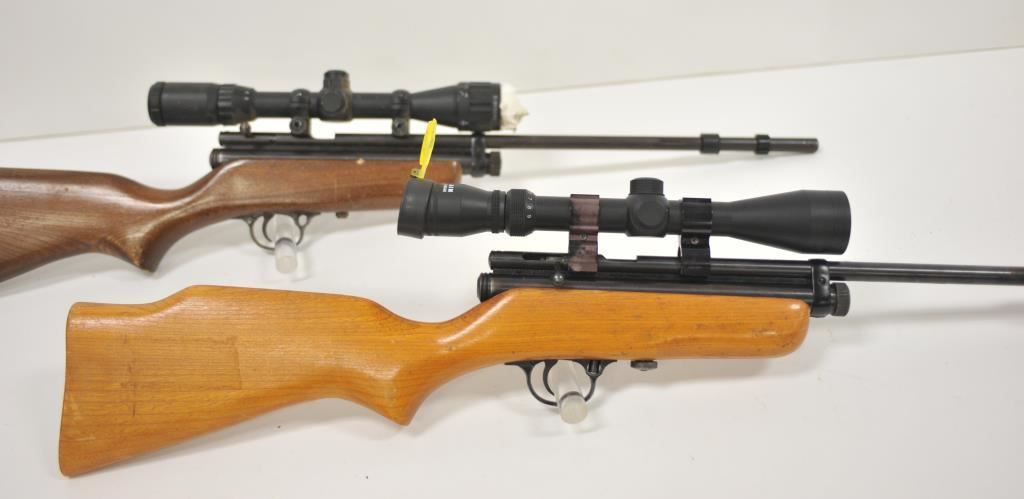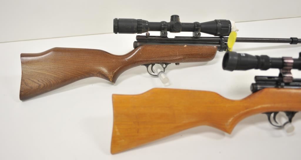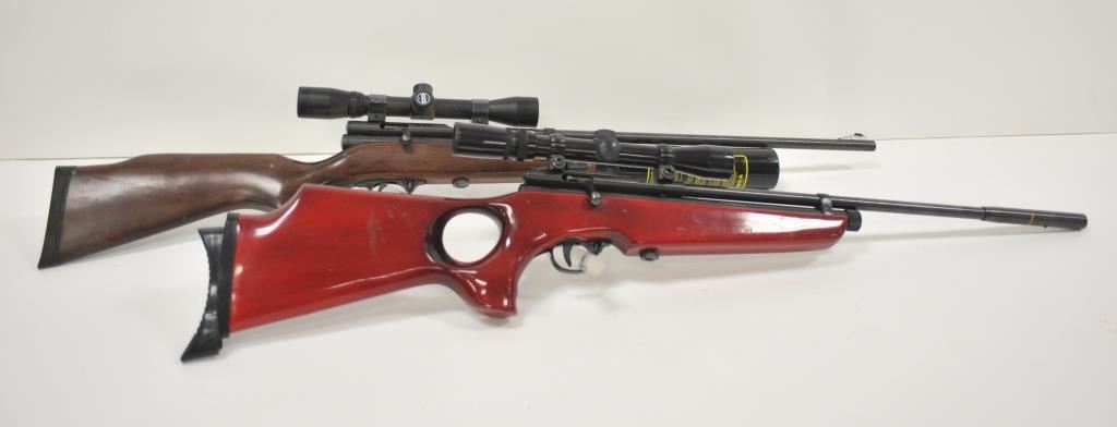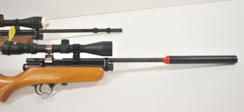 Lot of four CO2 powered air rifles. The lot includes two Crosman Model 187 Pellgun .177 caliber CO2 air rifles in fair overall condition with light surface rust on the metal surfaces and scoped with AIM 3 x 9 x 40 and Leapers 3 x 9 x 32 variable power rifle scopes. The other two are marked “Made in China” and feature upgraded target stocks. Both are topped with Bushnell rifle scopes. Est.: $125-$250.