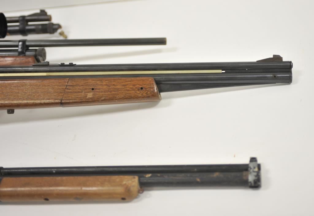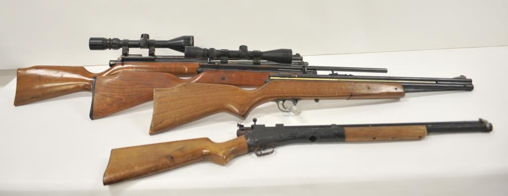 Lot of four assorted air rifles. The lot includes a Sears pump model missing the bolt, a JC Higgins .22 caliber CO2 rifle, vintage Crosman Arms and Taiyo Juki “BOBCAT” air rifle with steel CO2 canister and topped with a Buck Ridge 3 x 9 x 50 variable power scope. All rifles are in fair condition with surface rust on the metal parts and wood stocks showing heavy wear. Est.: $50-$100.