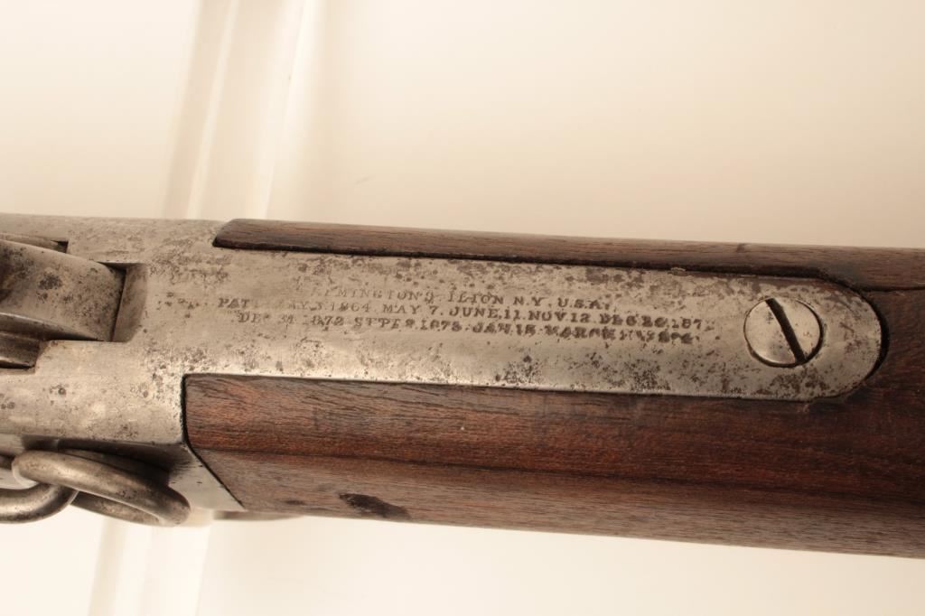Remington Rolling Block single shot saddle ring carbine, .45 caliber, Serial #NSNV. The carbine is in fair overall condition with a 20” barrel. The metal surfaces have been cleaned to a silver patina with light to moderate pitting in areas. The receiver retains the saddle ring and the action not working at the time of description. The smooth wood butt stock is in good condition with the fore end missing. The bore is worn and pitted in areas. Est.: $200-$400. (Antique).