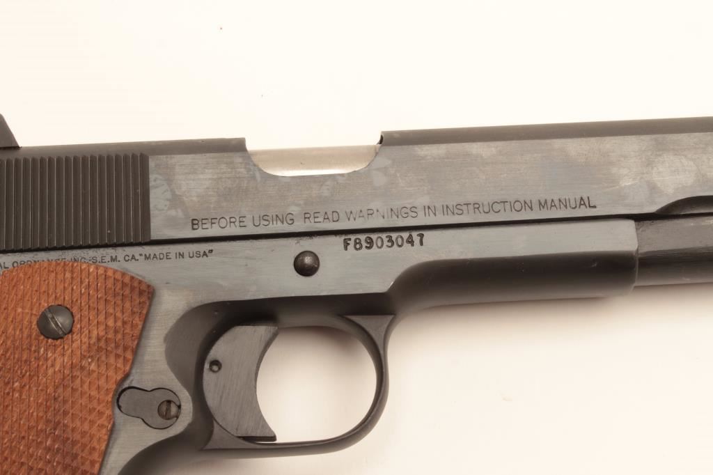 Federal Ordinance Government Model semi-automatic pistol, .45 caliber, 5” barrel, blued finish, checkered wood grips, S/N F8903047;overall fine condition with a fine bore, crisp action, very good markings and fine grips. (Modern/PPT). Est.: $250-$500.