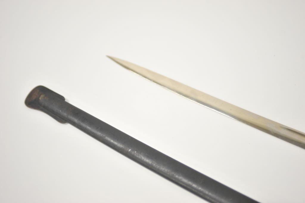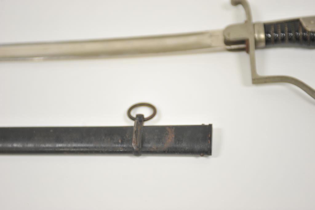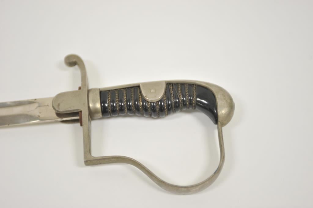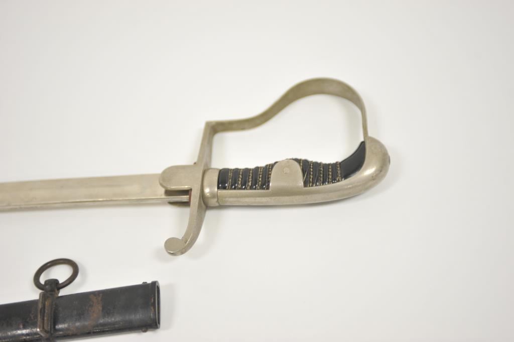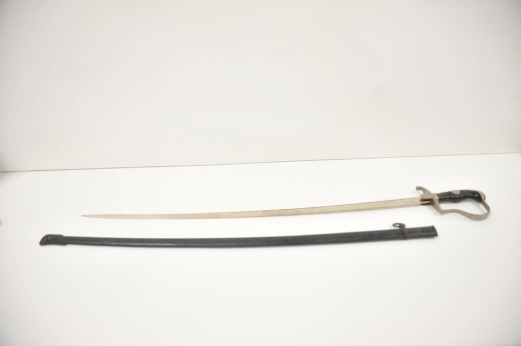 German dress sword with metal scabbard. The sword is in good overall condition with a 32 ½” Eckhorn blade and an overall length of 37 ½”. The blade does not appear to have been sharpened. The handguard and pommel are grey metal with a wood grip with wire wrap. The metal scabbard is painted black with numerous areas of light surface rust and the hanger is intact. Est.: $200-$400.