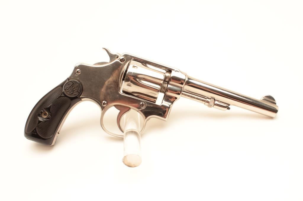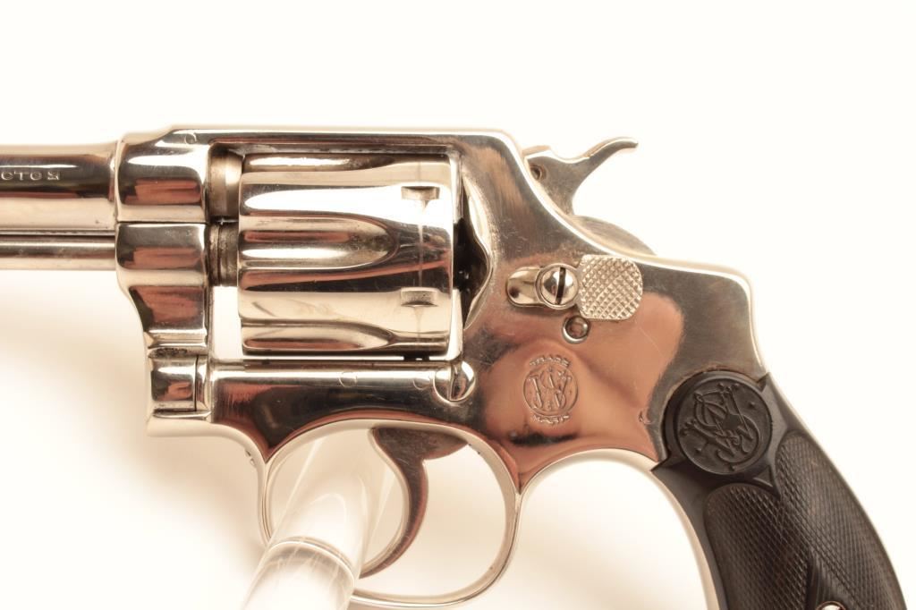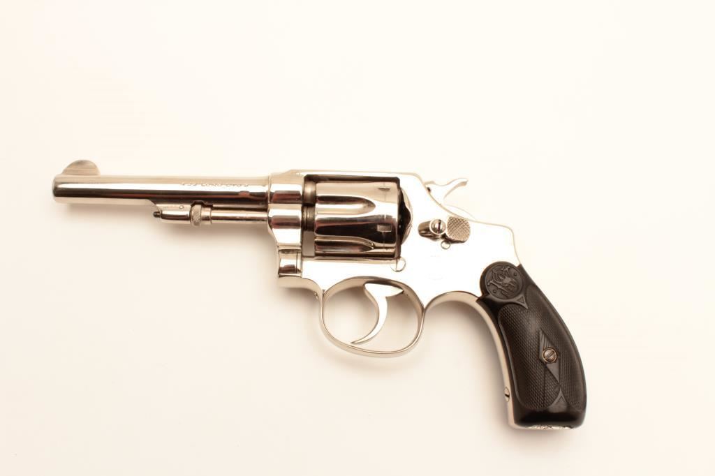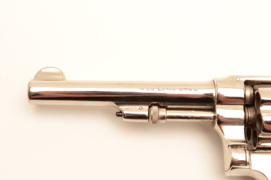 Smith & Wesson Hand Ejector DA revolver, .32 Long caliber, 4.25” barrel, re-nickel finish, checkered black hard rubber grips, S/N 88731; fair + condition as re-finished with good action, fair only bore, good markings and fair grips showing old losses to bottom of grips at strap pins; accompanied by a leather Bucheimer holster. (C&R/PPT). Est.: $125-$250.