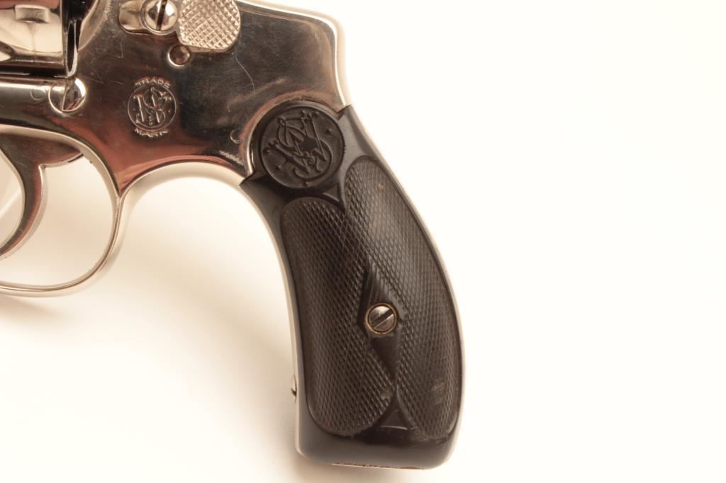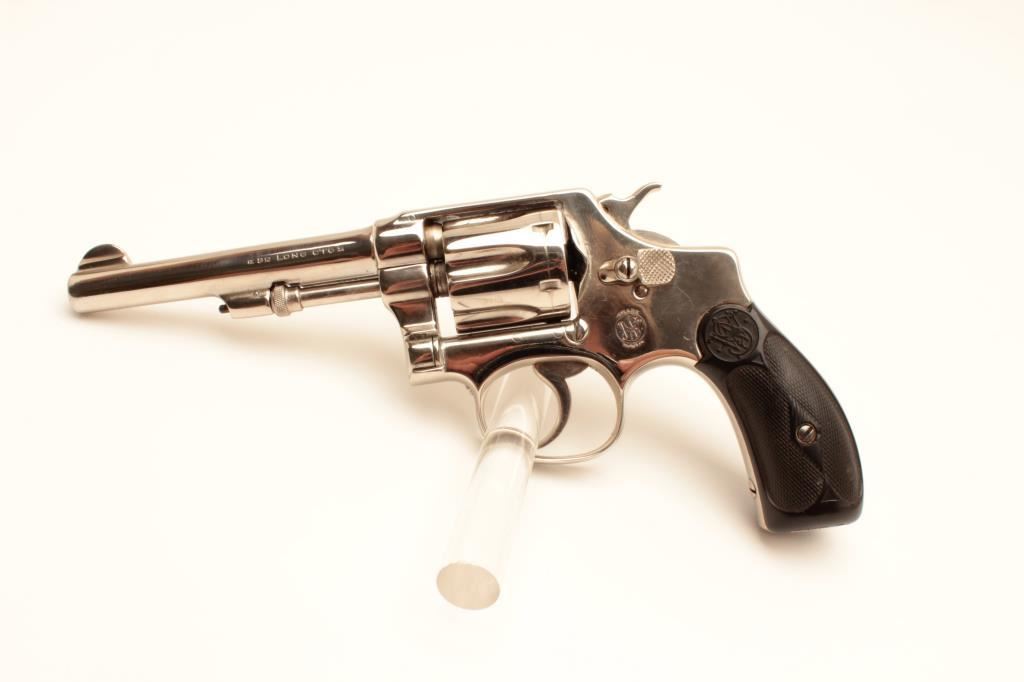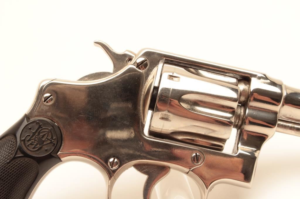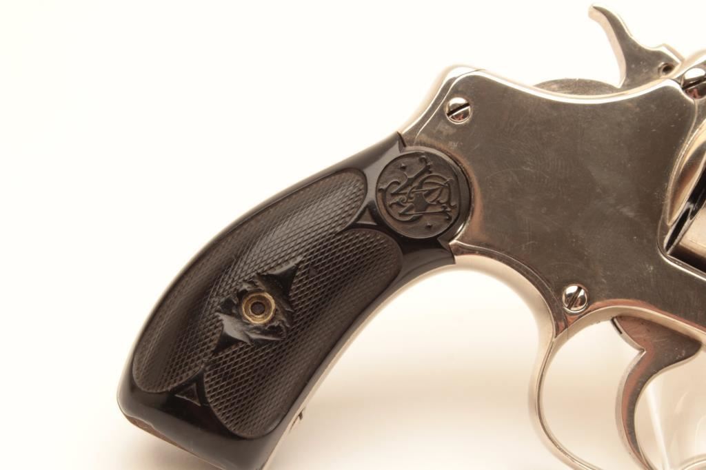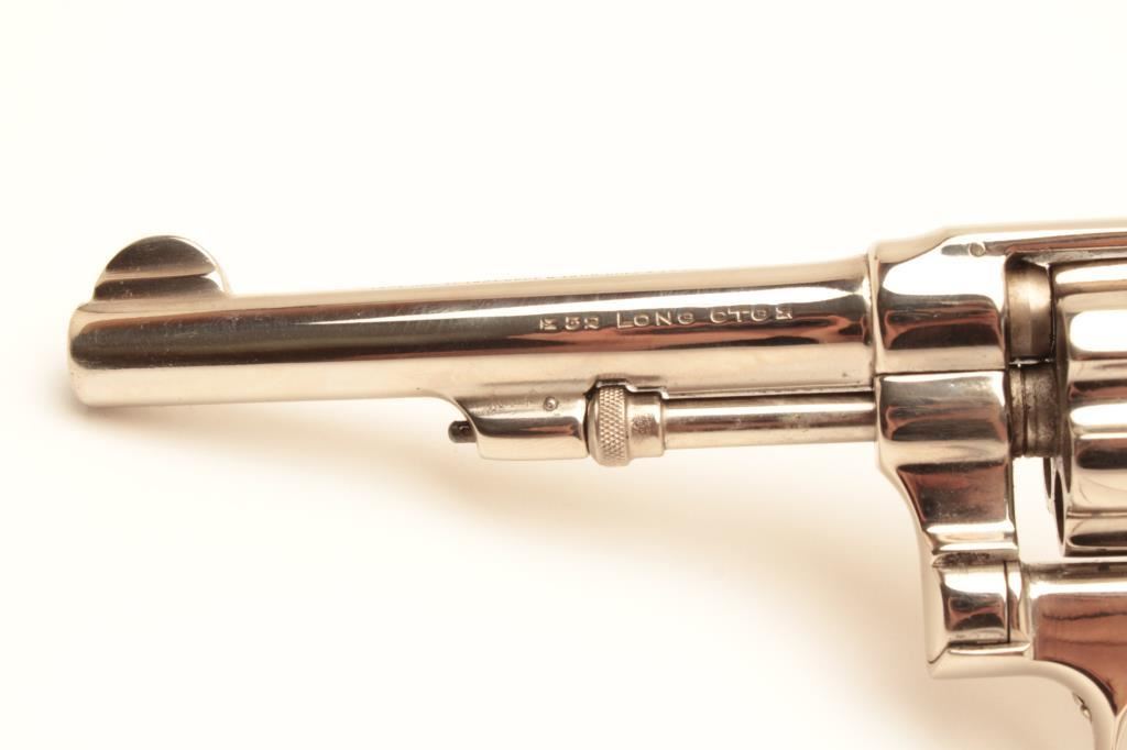 Smith & Wesson Hand Ejector DA revolver, .32 Long caliber, 4.25” barrel, re-nickel finish, checkered black hard rubber grips, S/N 88731; fair + condition as re-finished with good action, fair only bore, good markings and fair grips showing old losses to bottom of grips at strap pins; accompanied by a leather Bucheimer holster. (C&R/PPT). Est.: $125-$250.