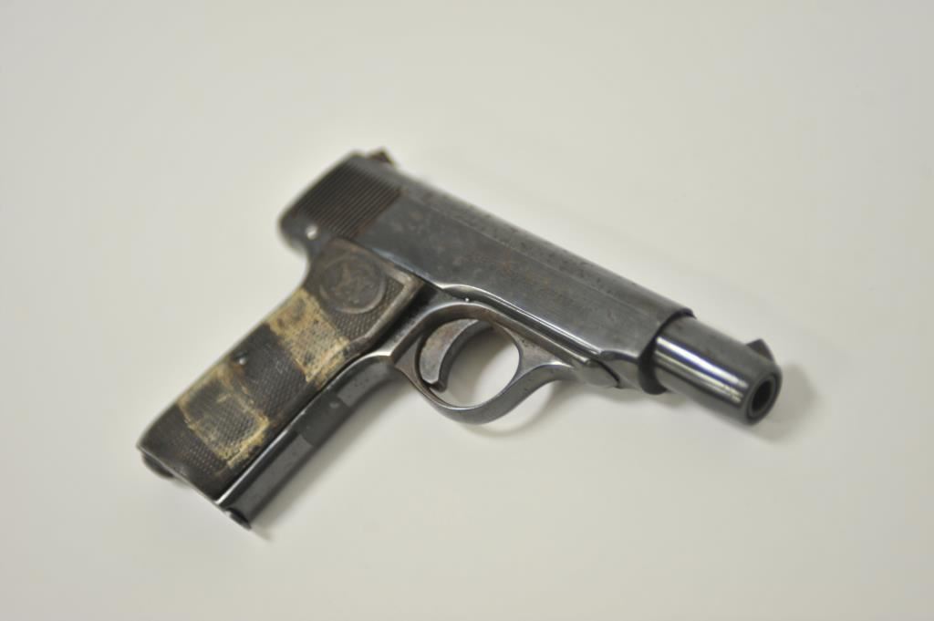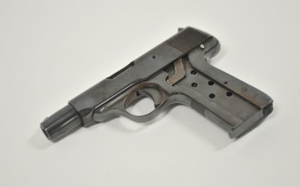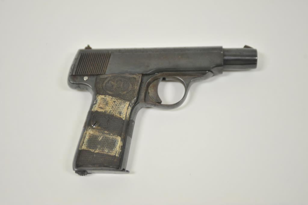 Walther pocket semi-automatic pistol, 7.65mm caliber, 3.5” barrel, re-blued finish, missing left checkered hard rubber grip, S/N 228564; fair condition with scattered spots of surface rust and erosion; dark bore, visible markings, remaining grip is heavily worn. (C&R/PPT). Est.: $100-$200.