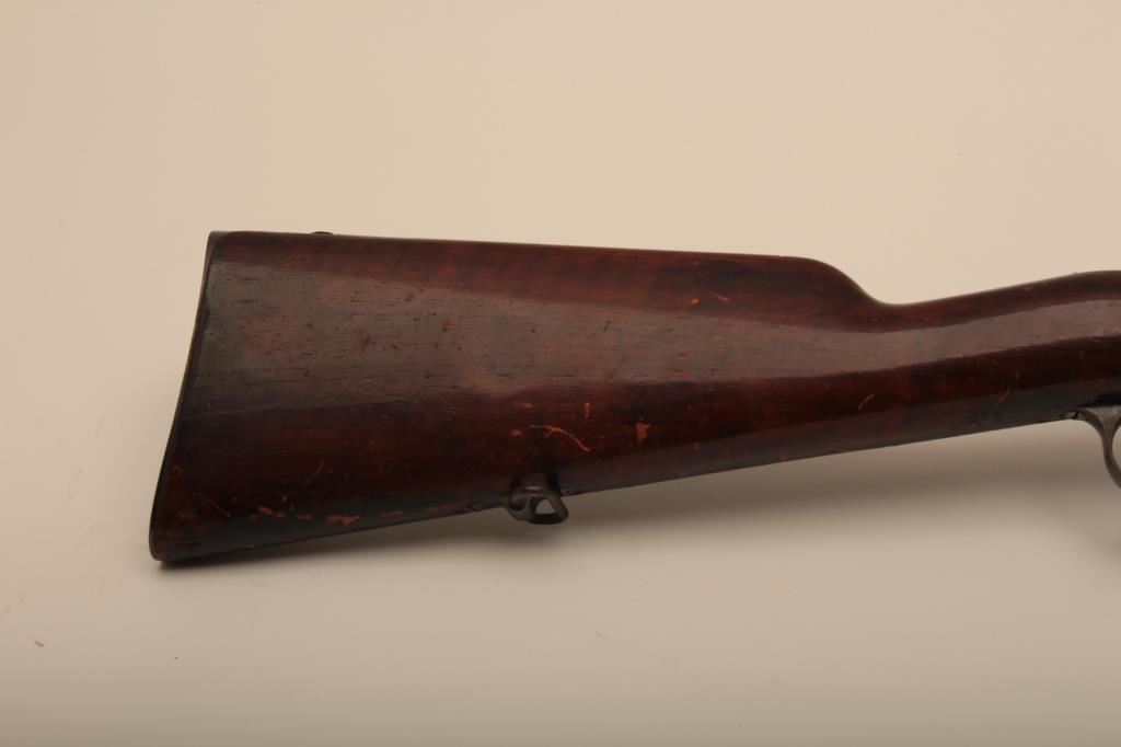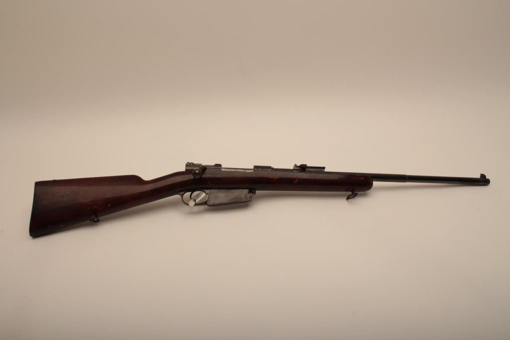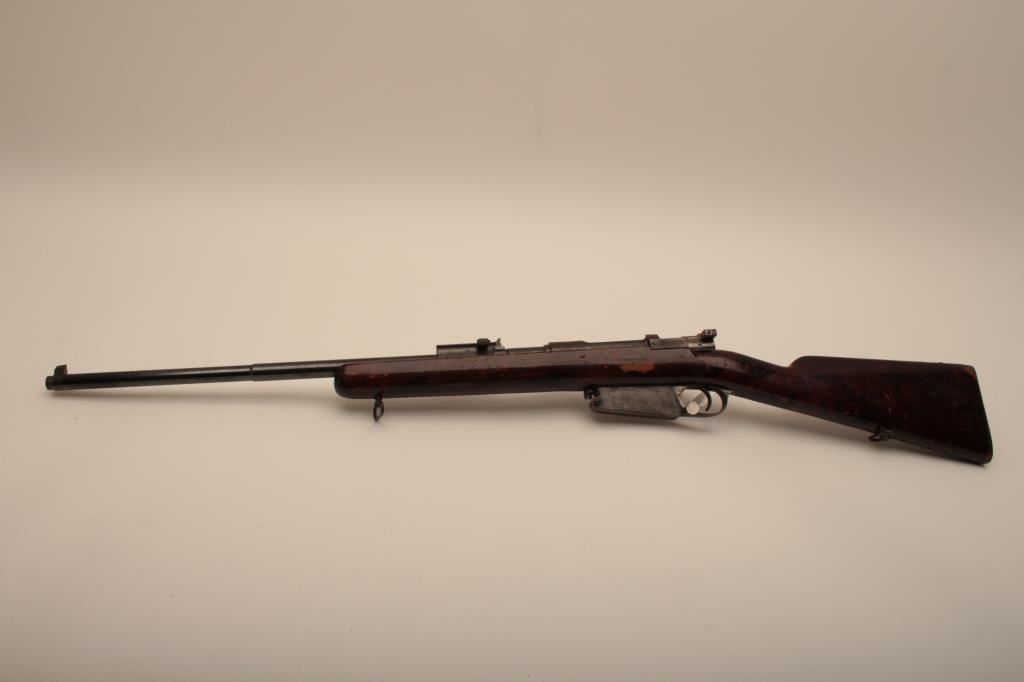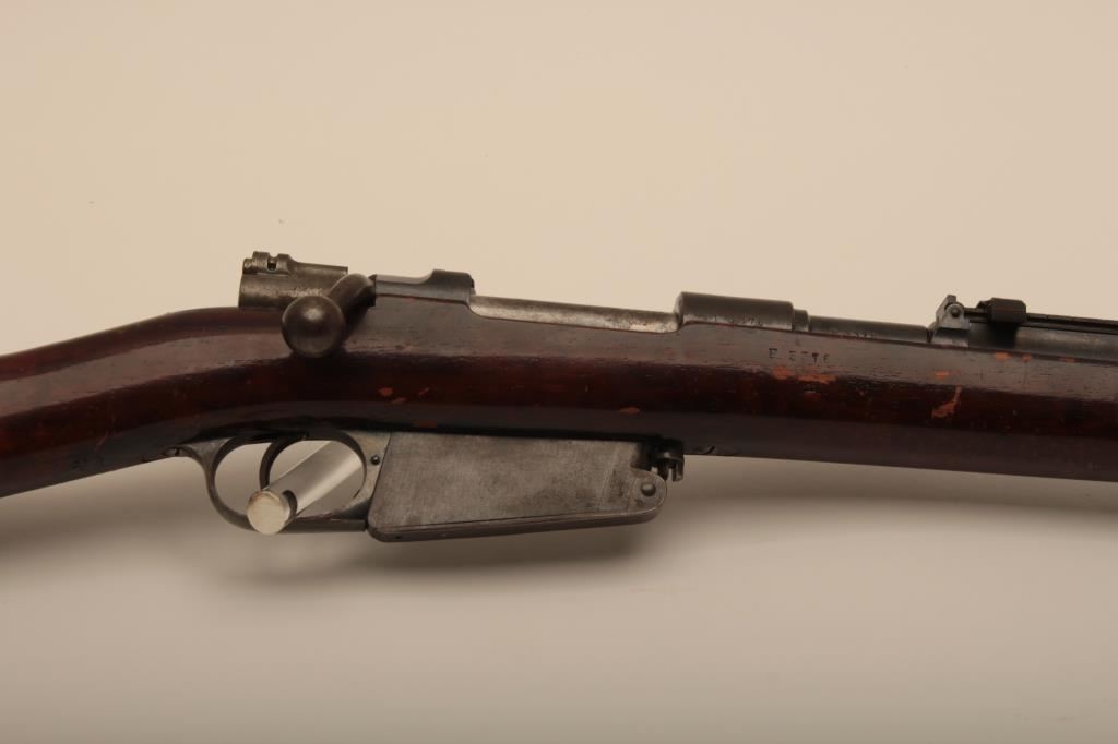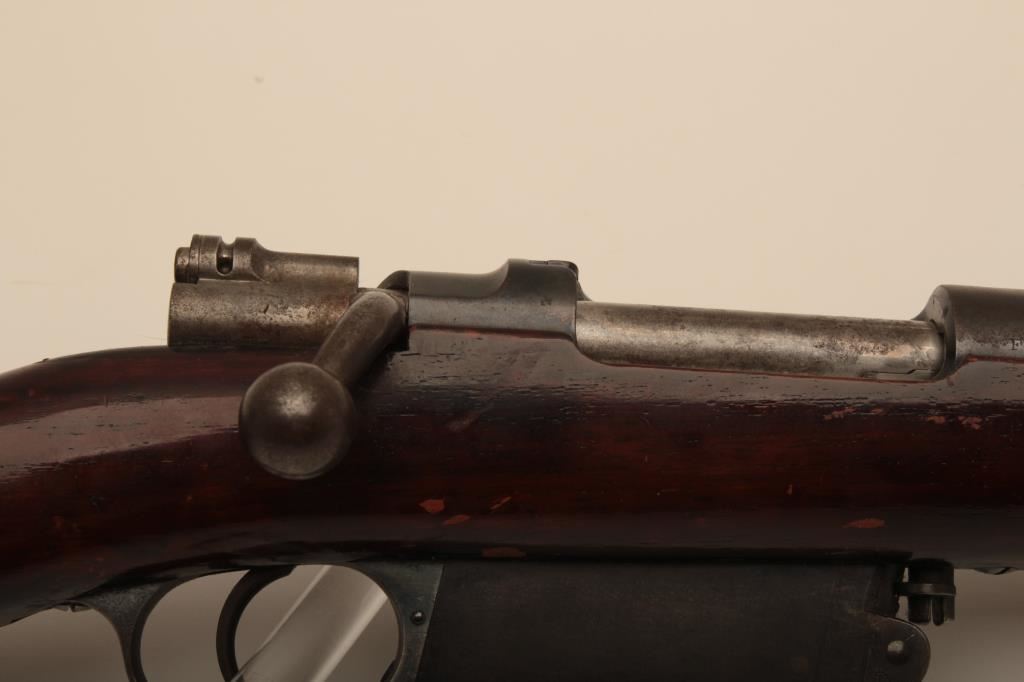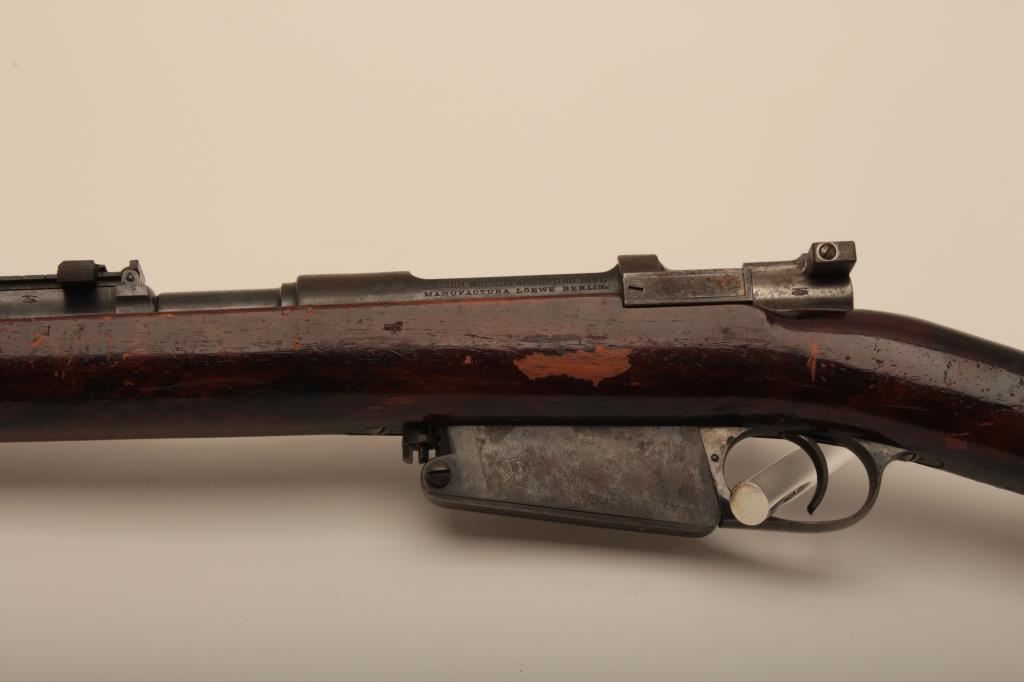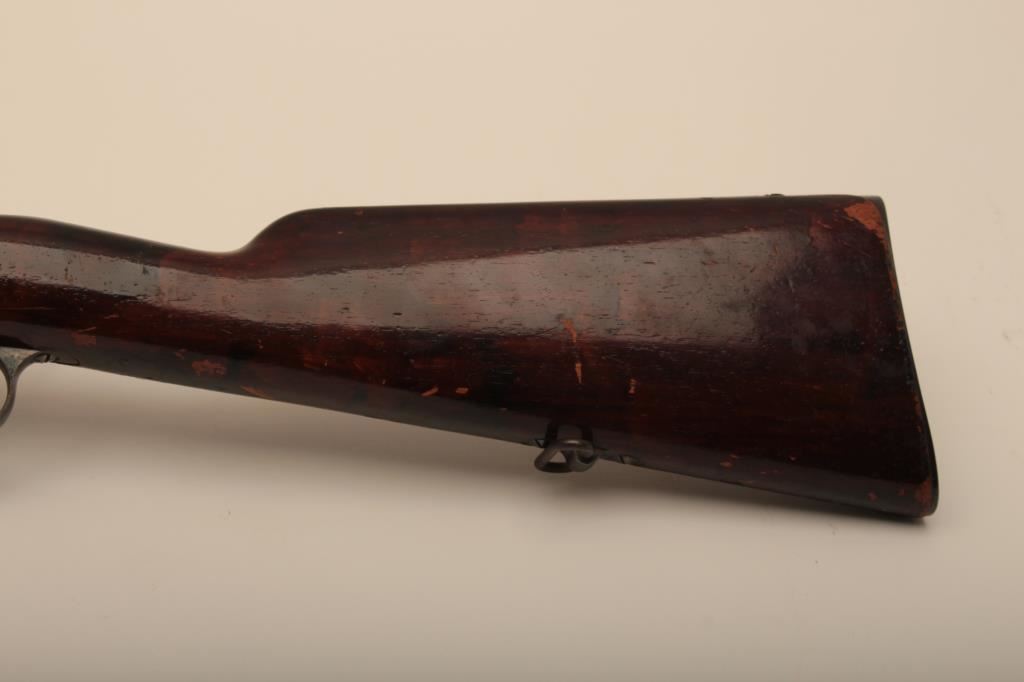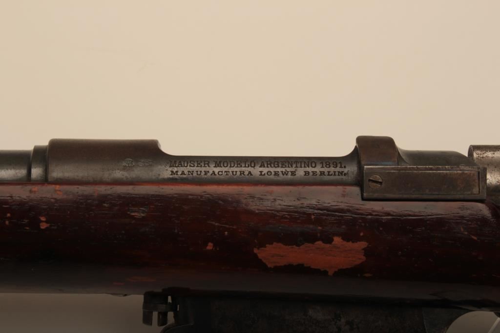 Argentine Model 1891 by Loewe of Berlin in 7.5 caliber, S/N F3376. The barrel measures 23” with stock reduced and fore arm removed. Crest grounded and refinished by “El Crappe” the unknown gunsmith. Bore is very dark. Working condition. Est.: $50-$100