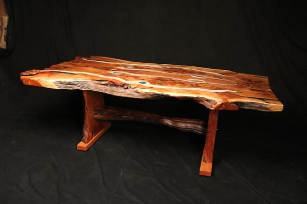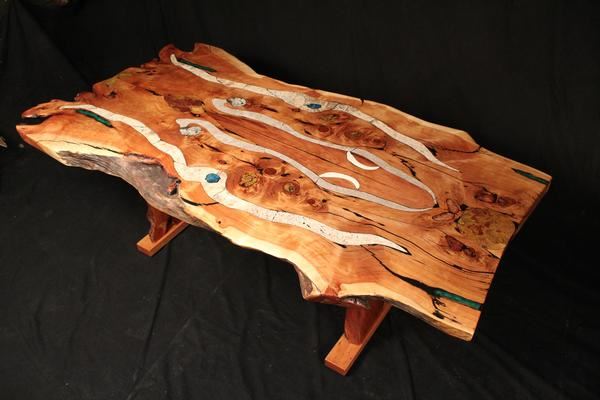 Andy Sanchez Furniture has donated a Unique Artistic Table titled 'Elephant Tusk Table.' The white marble and wild boar tusk inlay in this alligator juniper table made Andy think of elephant tusks and thus the design and name. Other inlays in this tabletop include North African ammonites, Blue Stone from India, and Malachite. The marble is mined in New Mexico where Andy was born and raised. Andy Sanchez, his sons, and now Daniel, have been working together building artistic furniture for over 29 years. Andy Sanchez is one of the first to use natural slabs with stone inlays. This table measures 7-ft. by 42-in.-ft. and it weighs an estimated 500-lbs. For more information, contact Andy Sanchez at 505-385-1189 and visit www.andysanchez.com.