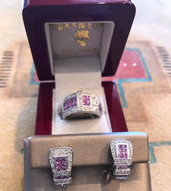 Ornaments Fine Jewelry has donated a beautiful suite consisting of Ladies 14K White Gold Ring and Earrings. This stunning work has deep, color saturated pink sapphires and brilliant white diamonds, all invisibly set in a buckle design. The oversize wide band dome ring and matching omega backed earrings all totaling approximately 6.1 TCW sapphires and diamonds. For more information, contact Melinda Simpson at ornaments77@gmail.com