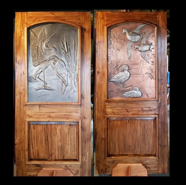 Legacy Forge & Millwork Doors has donated an Artistic Metal Art Framed in Knotty Alder Door. This exquisitely handcrafted door showcases two unique artistic wildlife scenes in molten cast metal, sculptured by the late R. Scott Jarvie and son Jay Jarvie. One side of the door features beautiful 'Wood Ducks' cast in a base metal of zinc with a copper background and highly polished silver finish, with two ducks in flight and two on the water. The other side features elegant 'Cranes' standing in water next to cattails, plated in nickel and enhanced with a charming natural patina. The custom door and raised molding framing these beautiful works is Knotty Alder wood, hand selected and crafted with old world quality by our master craftsman in our shop in Klamath Falls, OR. For more information, contact Kristen Clark at 541-363-2992 and visit www.legacyforge.com.