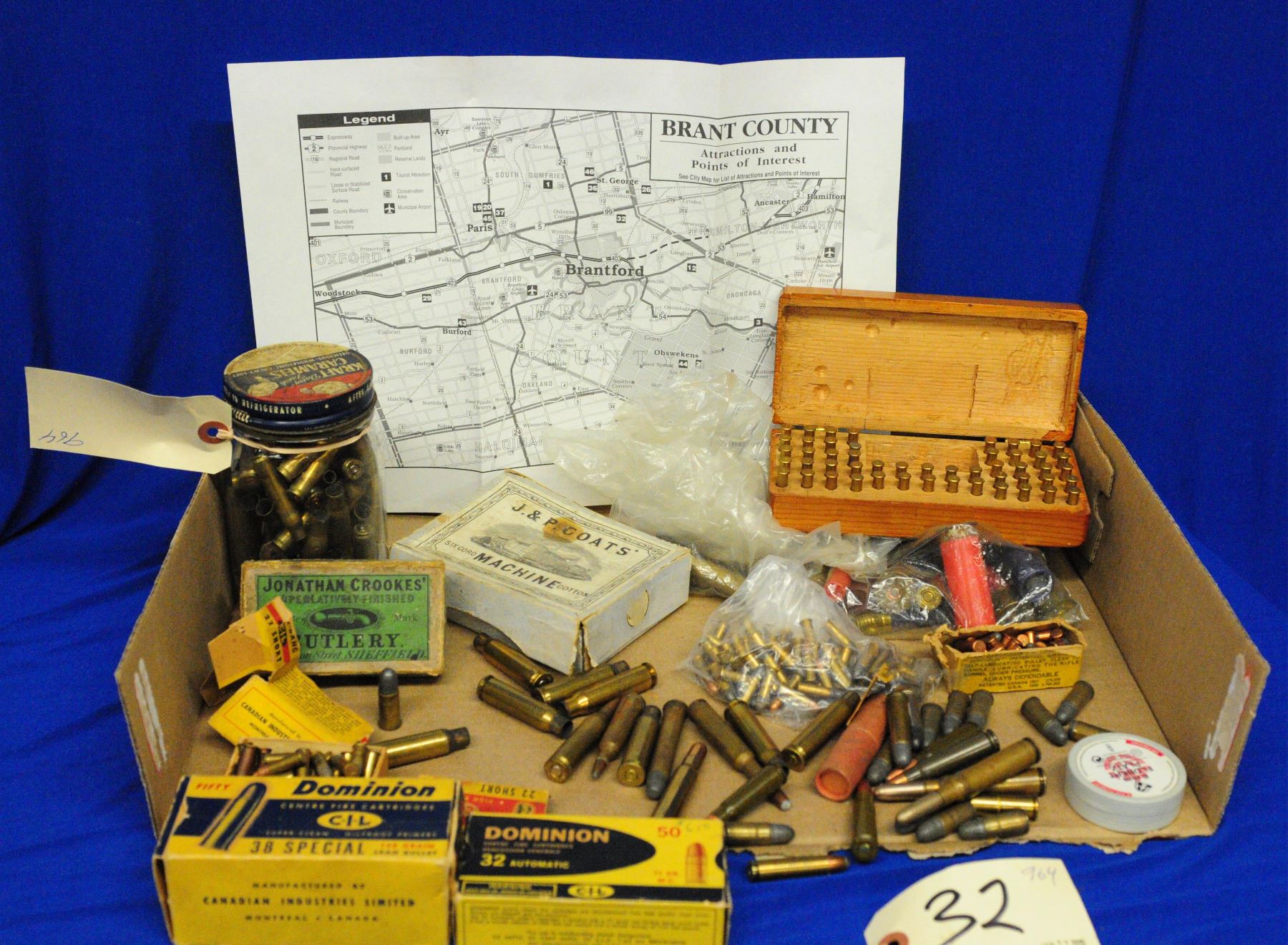 Some vintage 23 rnds 22 auto, 22 rnds 22 cb caps, 161 rnds 22 lr, 48 rnds hand made 38 spl wax filled shells, 23 rnds 32 auto, 11 rnds mixed shotgun shells, jar of mixed brass, 8 pcs 307 win. brass, 5 rnds 8mm, 4 rnds 38 spl., 12 rnds 38 s&w, container peerless lion brand bb's, container 6mm flobert platz, 2.05 kg of 30 cal. projectiles, 8 rnds 30-06 cass reloads, 7 rnds of other misc, rifle ammo