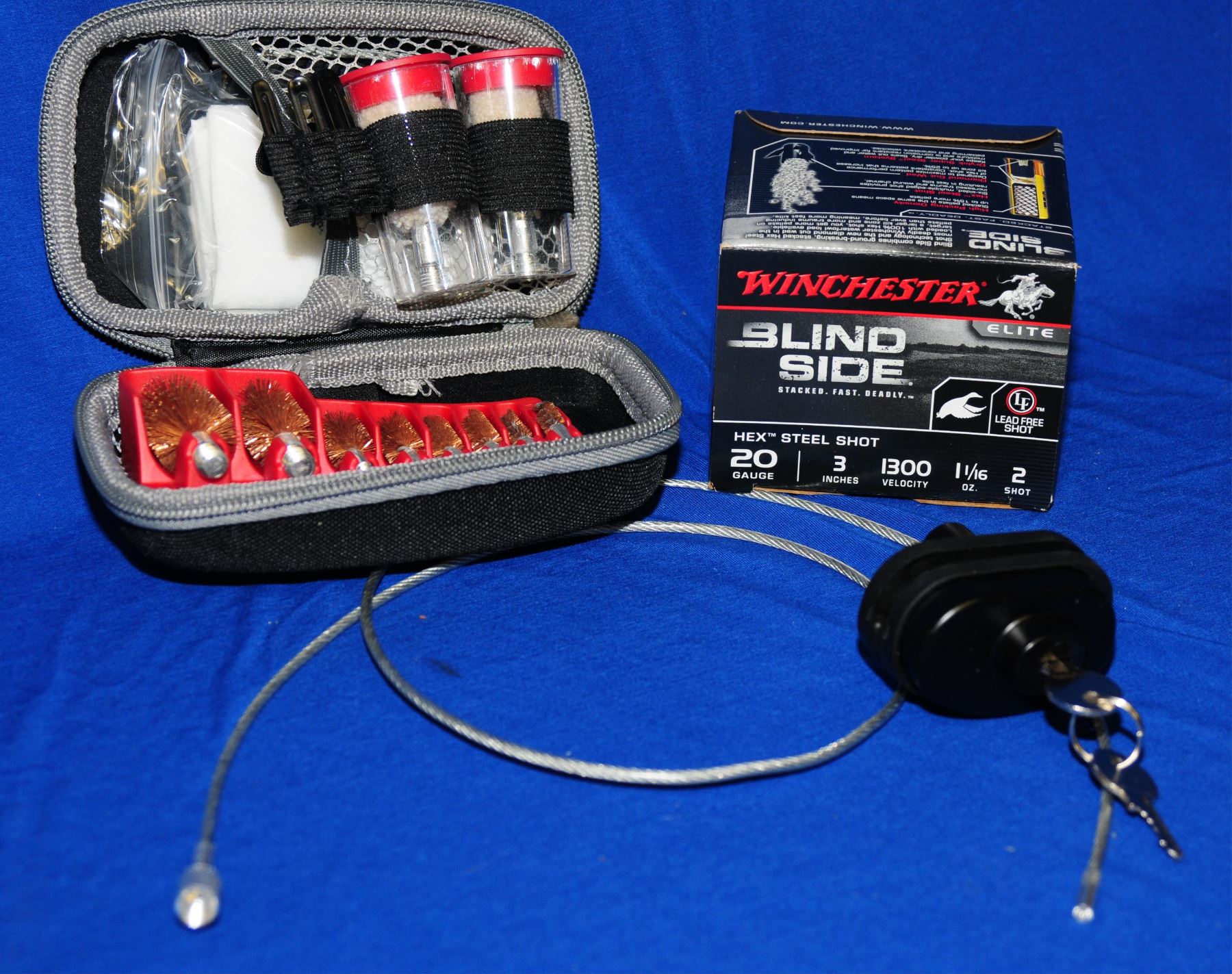 25 rnds Winchester Blind Side 20ga x 3", one trigger lock, universal gun cleaning kit.