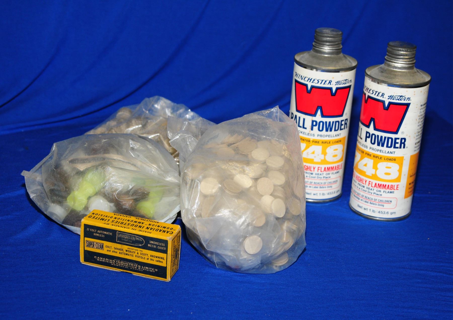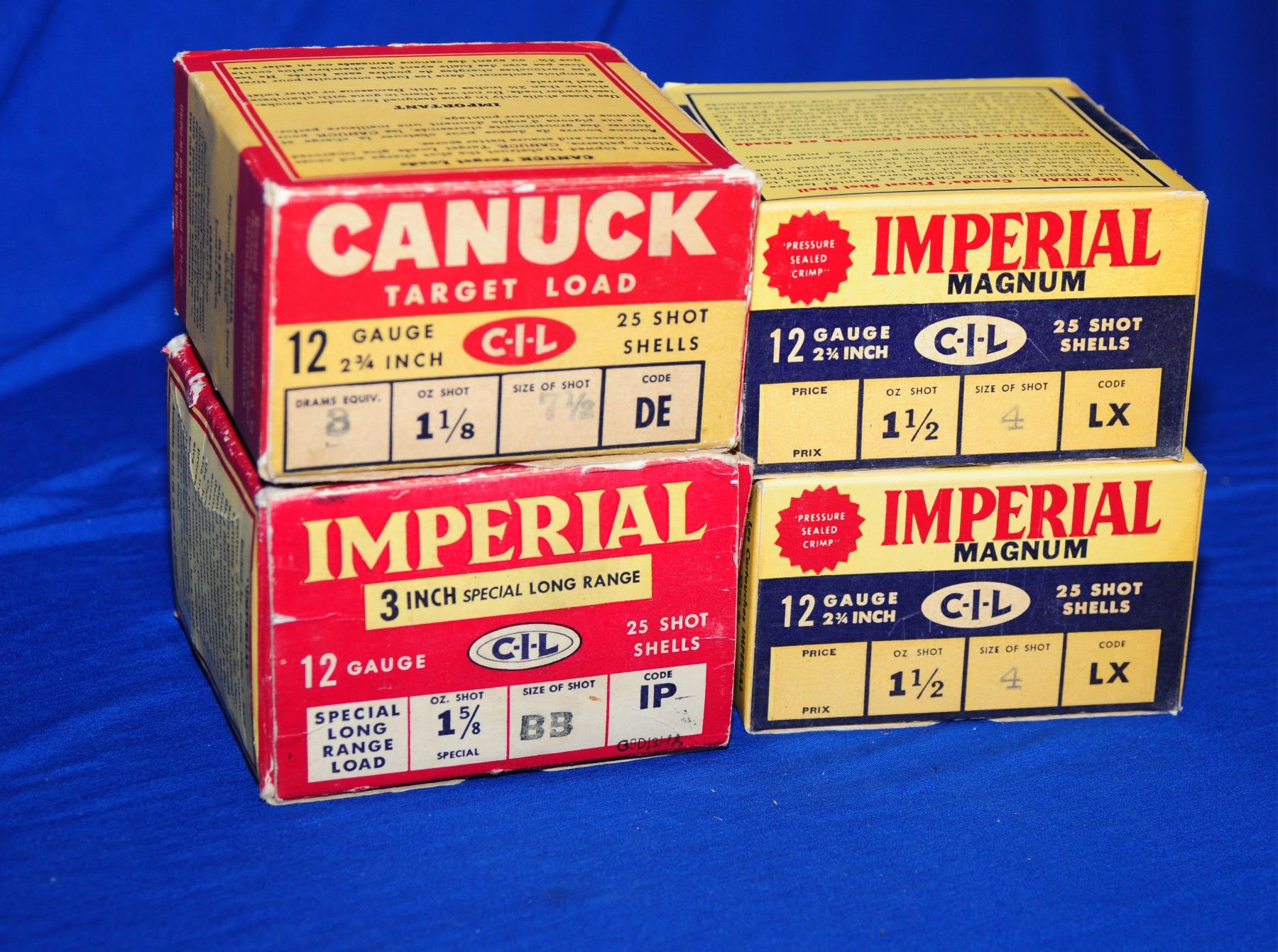50 rnds Imperial 12Ga x 2 3/4" shotshells in vintages boxes, three vintage CIL ammo boxes, 1 1/8 LB Winchester 748 propellant, paper and felt wads.