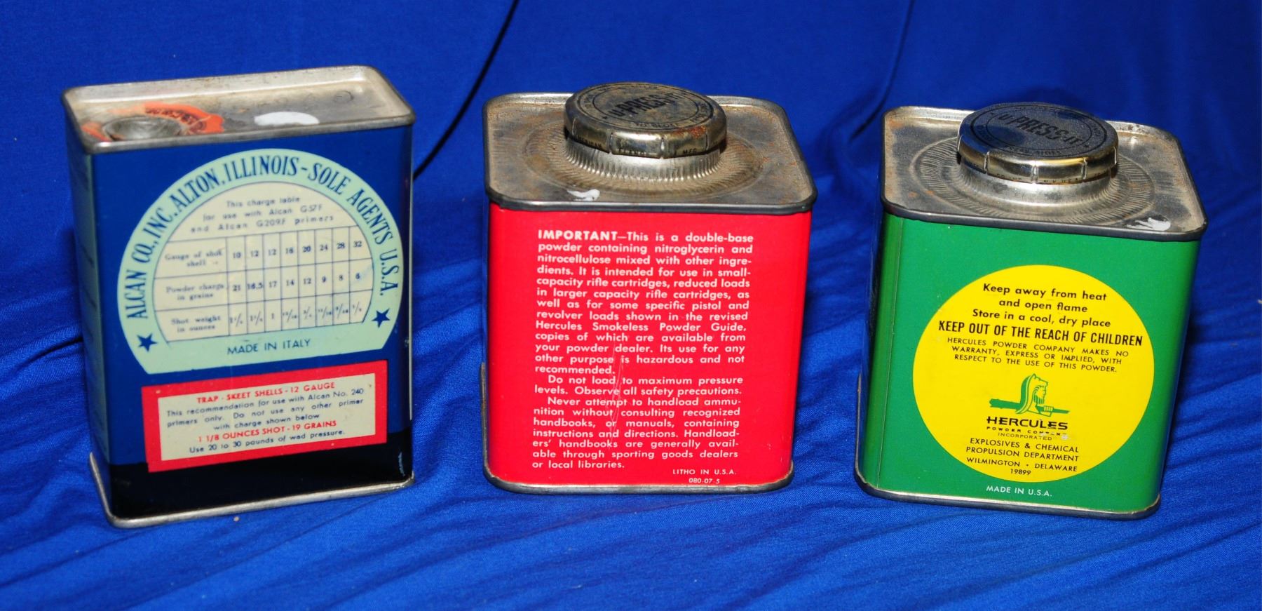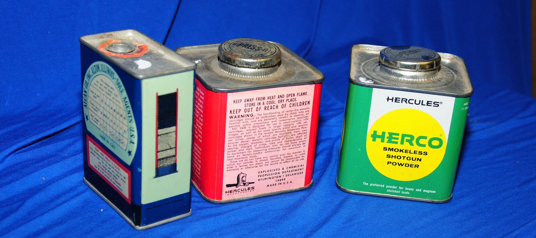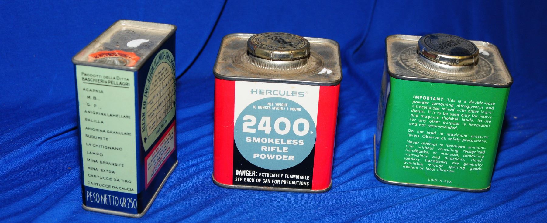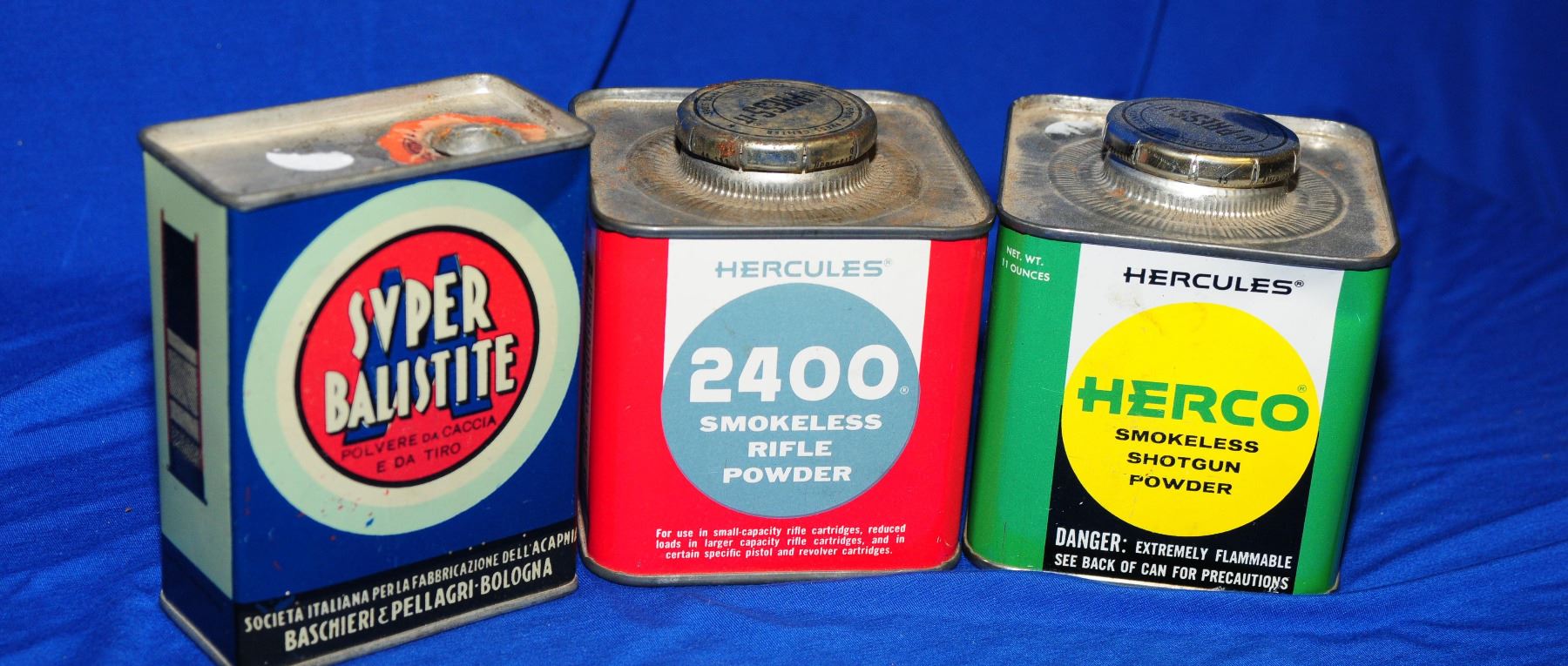 3 collectable antique powder cans, 1 Hercules 2400 smokeless rifle powder, 1 Hercules Herco smokeless shotgun powder, 1 SVPER BALISTITE powder can