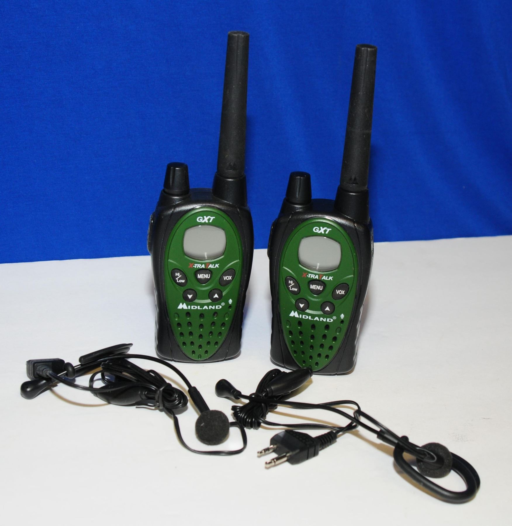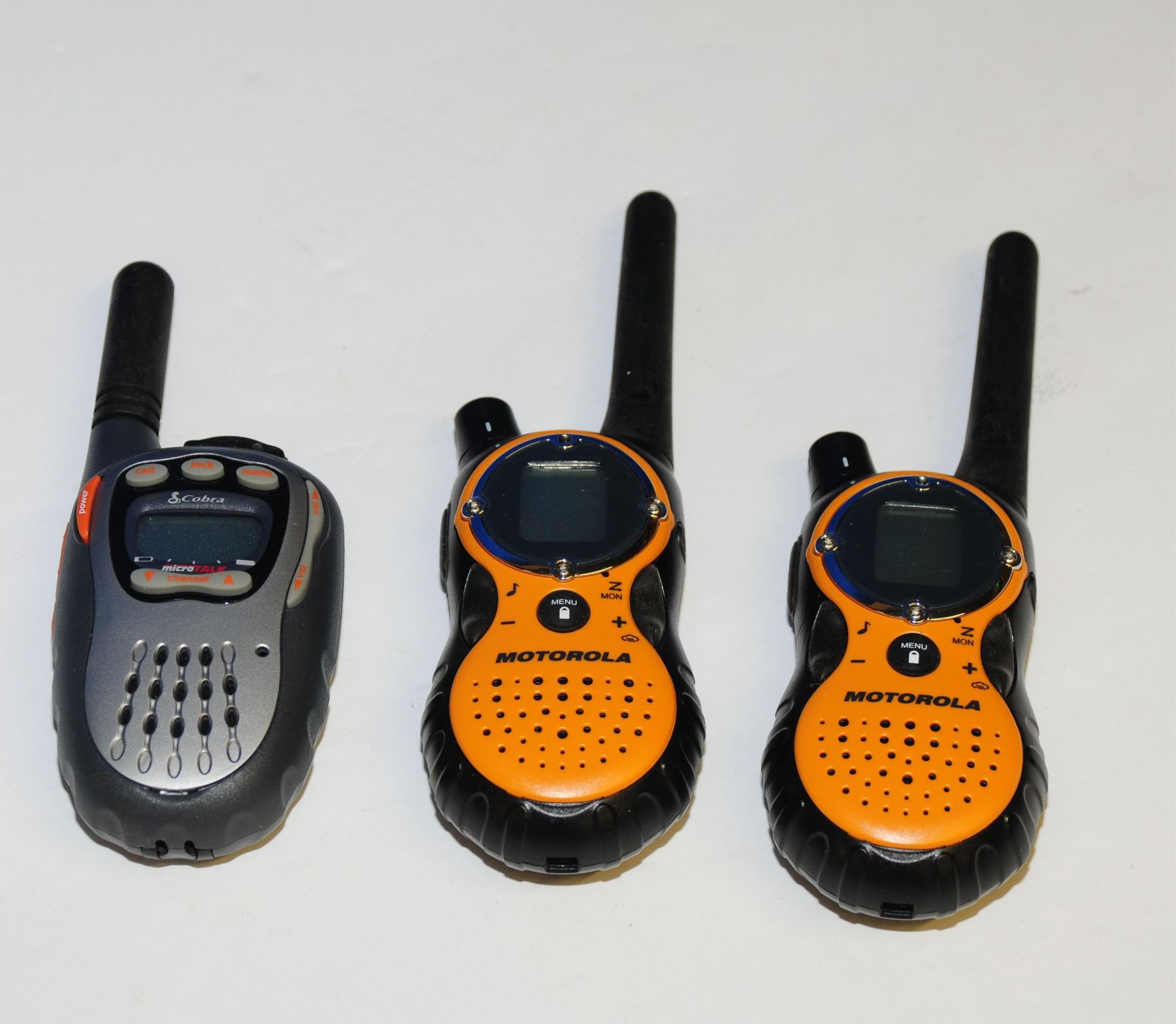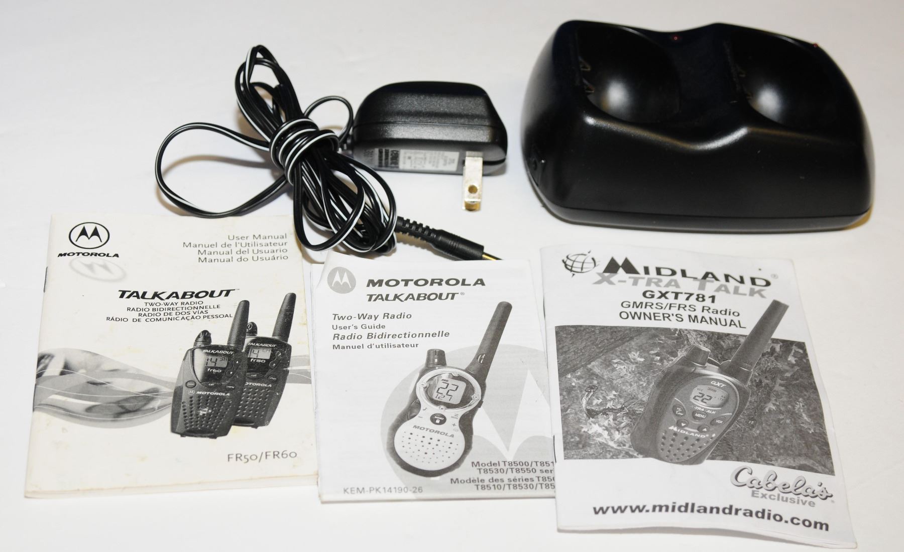 One set of Motorola Talkabouts with charger and no batteries, one set of Midland X-TRA TALK radios with ear buds and no batteries, one single Cobra radio with no batteries