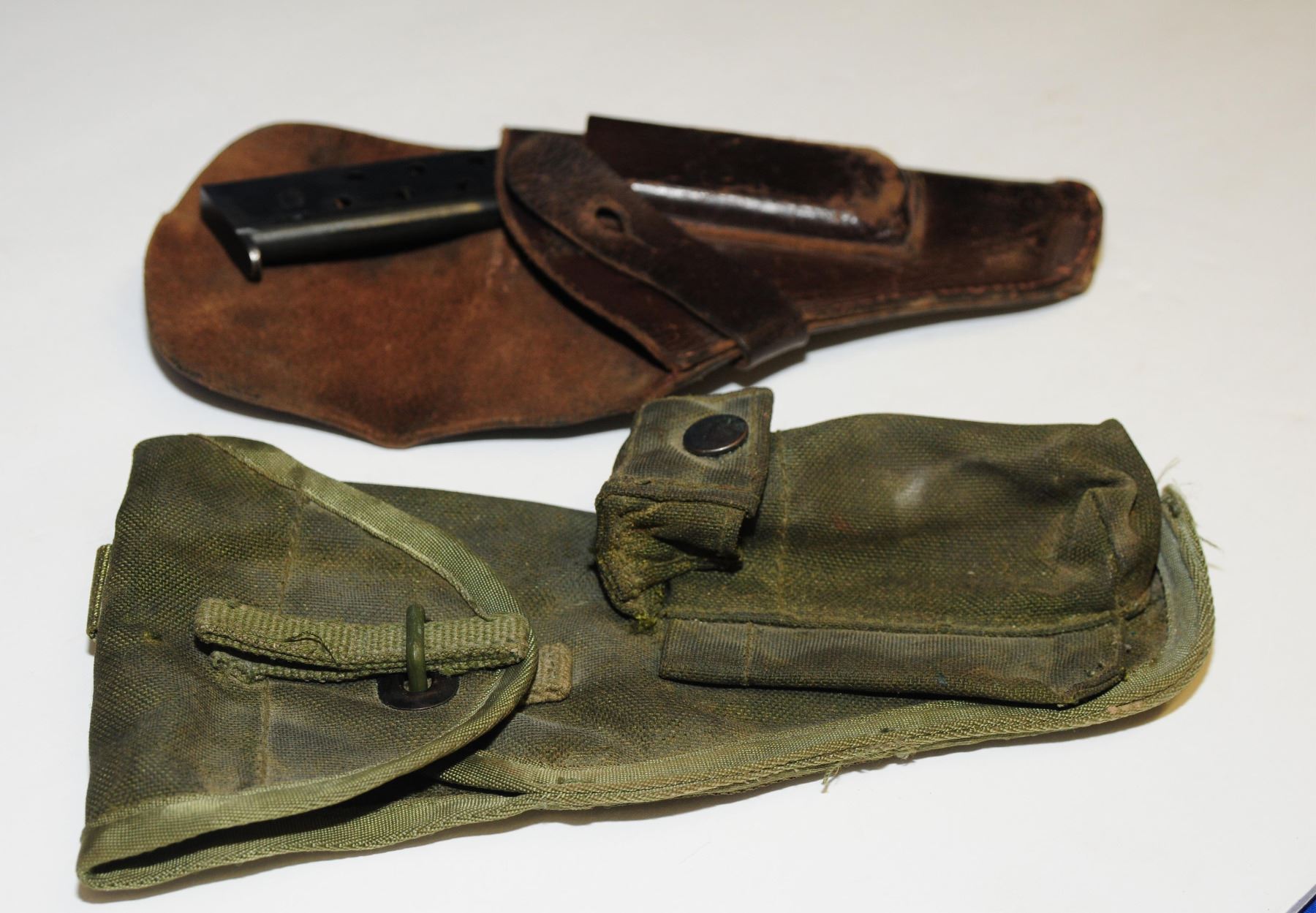 Green canvas Canadian Army Browning HP holster and a WW2 leather holster with a 7.65mm mag.
