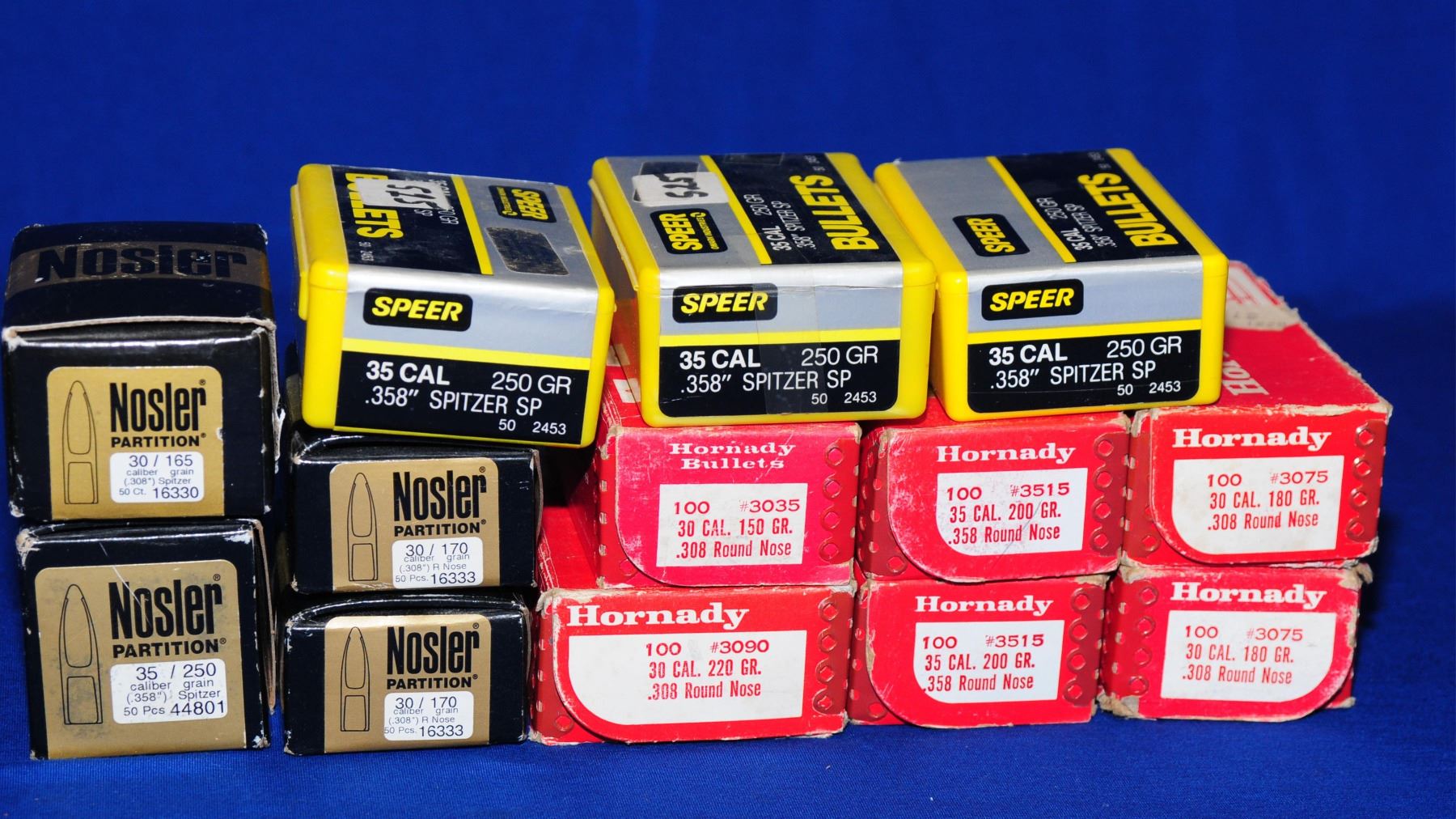 Roughly 200 pcs Speer .35 cal. 250 gr and 200 pcs Hornady .35 cal. 200 gr., roughly 160 pcs Hornady .30 cal. 180 gr.,100 pcs Hornady .30 cal. 150 gr., 50 pcs Hornady .30 cal. 150 gr., 100 pcs Nosler .30 cal. 170 gr., and 50 pcs Nosler .30 cal. 165 gr.