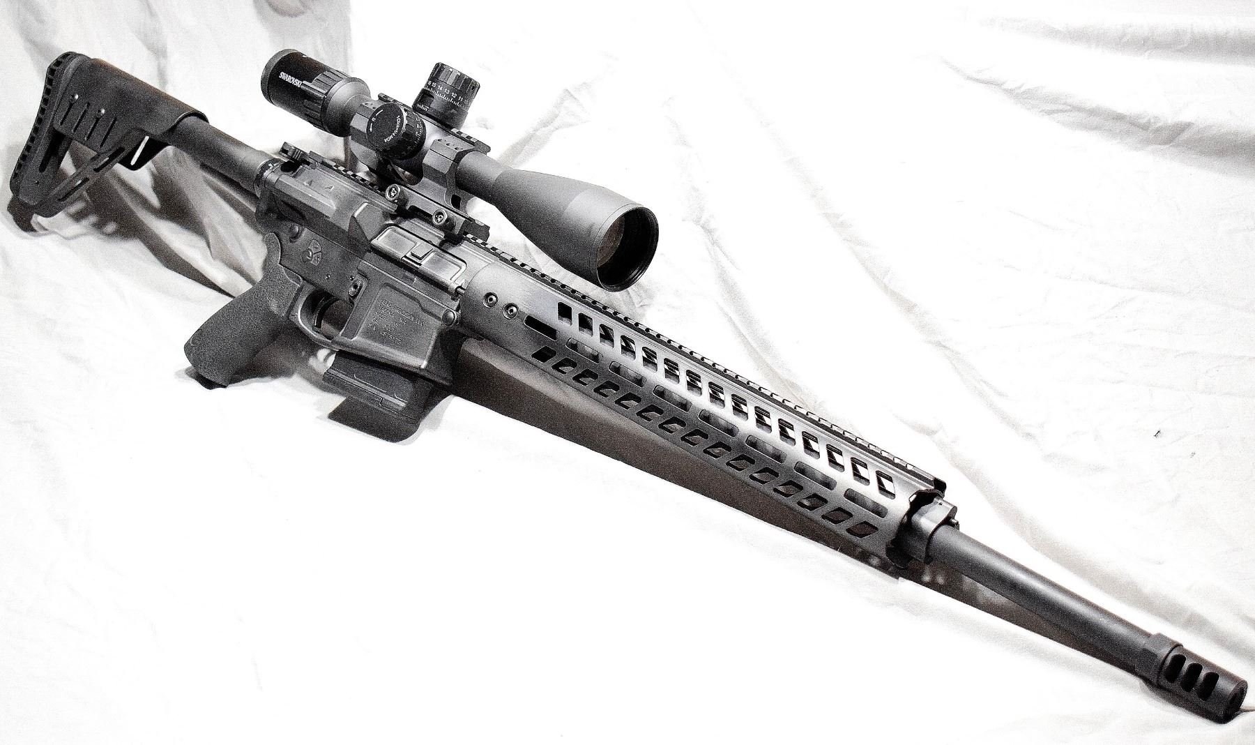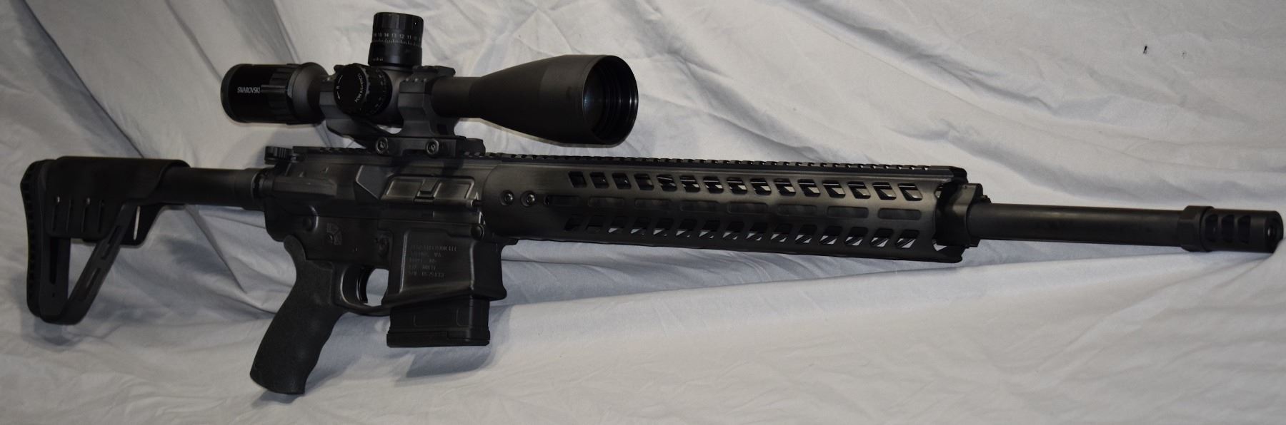 ROMTAG Riflewerks has built this lightweight 6.5 Creedmoor AR-10 featuring a carbon fiber butt assembly, a carbon fiber handguard, a 22” 6.5 CM proof research barrel, single stage precision trigger, adjustable gas, JP silent captured spring, 2-color cerakote and topped off with Swarovski X5 5-25x56 - 4WX optics. The product images shown are for illustration purposes only and may not be an exact representation of the final product.
