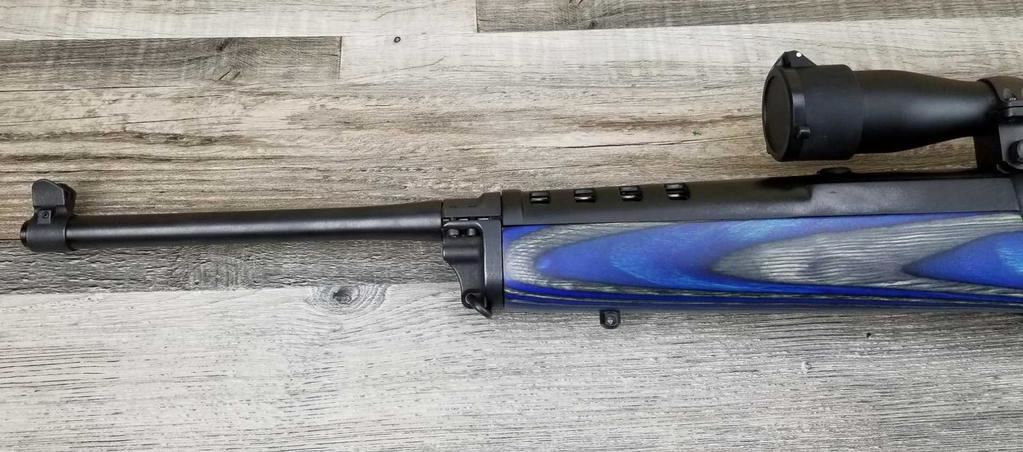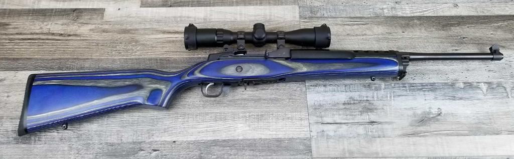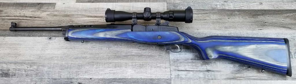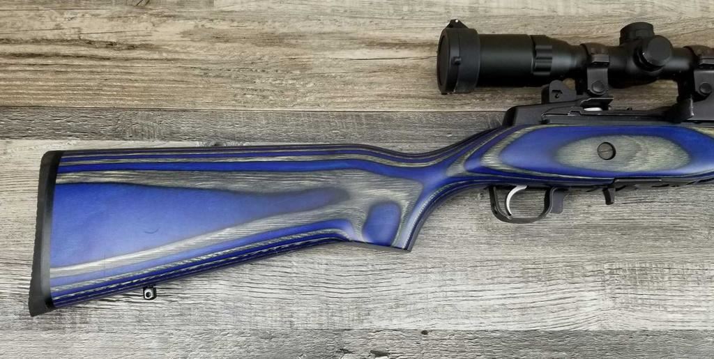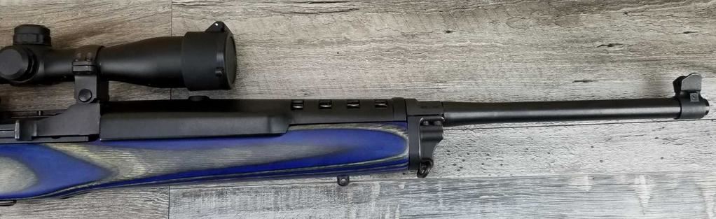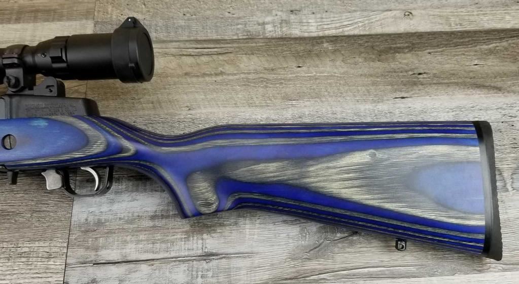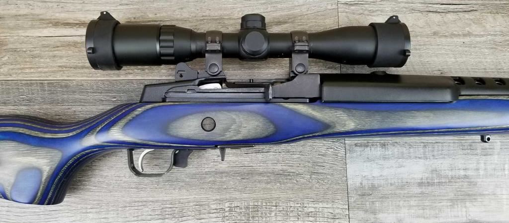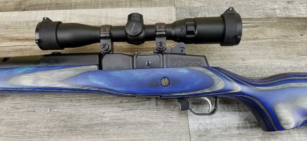CUSTOM BLUE AND GRAY LAMINATE STOCK. CENTER POINT 3X7 SCOPE. APPEARS TO BE AS NEW.