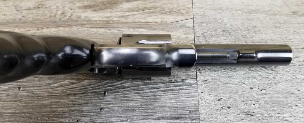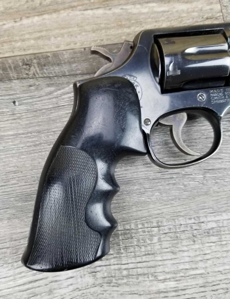 SHOWS HOLSTER WEAR AT MUZZLE END. PAINT ON FRONT SIGHT. REPLACED GRIPS.