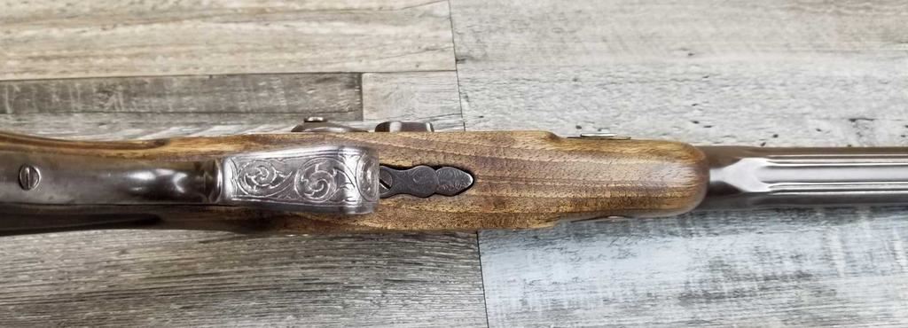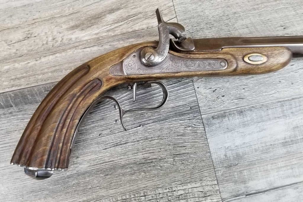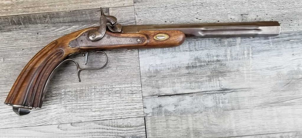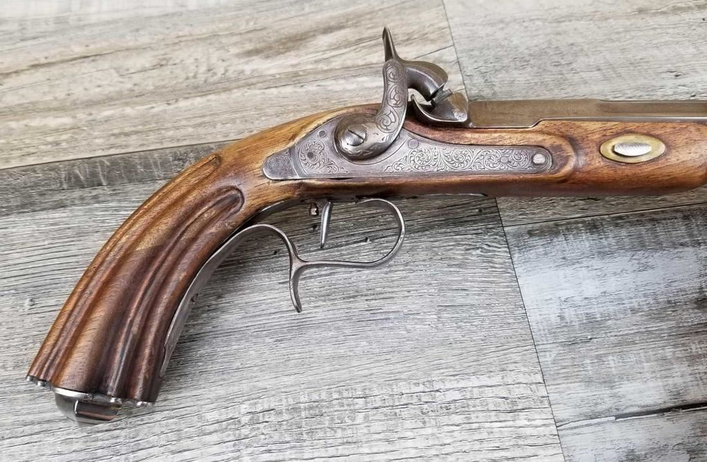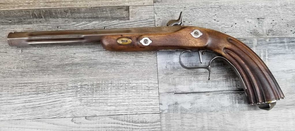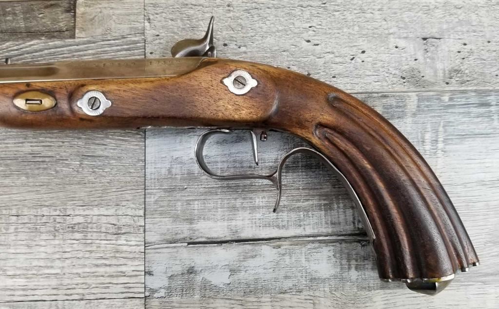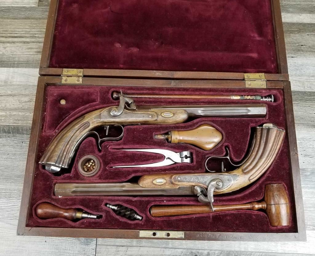 NICELY MADE EUROPEAN COPY OF FRENCH DUELING PISTOLS. IN BEAUTIFULY INLAYED EUROPEAN FITTED WALNUT CASE WITH ALL ACCESSORIES, JUST MISSING THE LID TO THE CAP CONTAINER. LID SHOWS SOME MINOR WATER DAMAGE AND ONE SMALL LOSS.