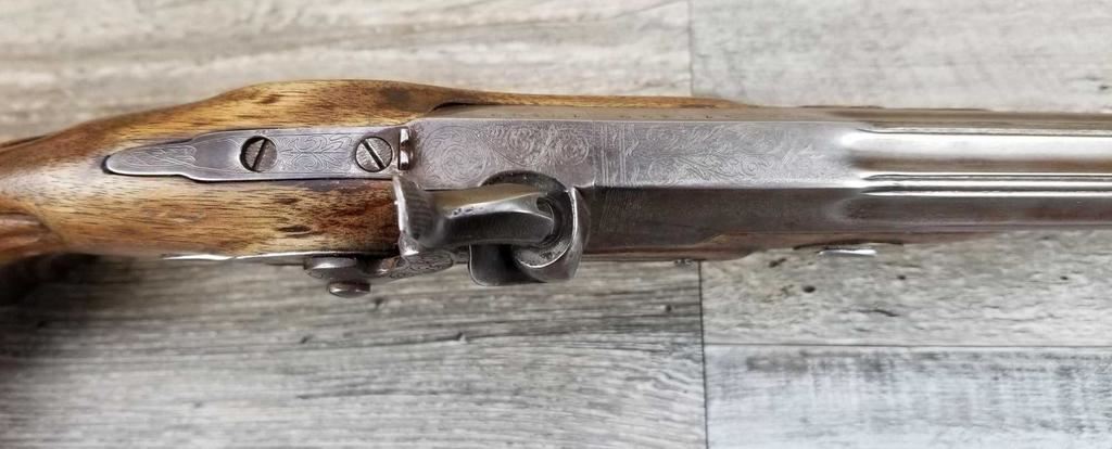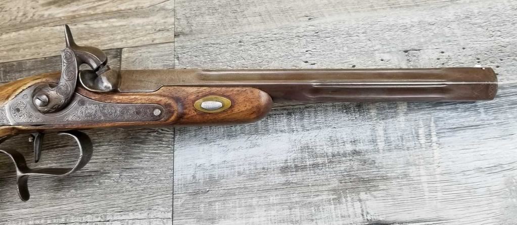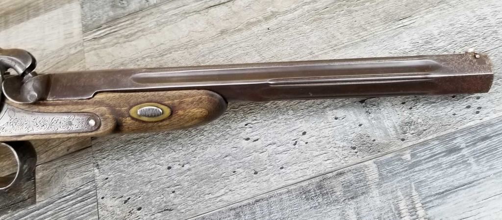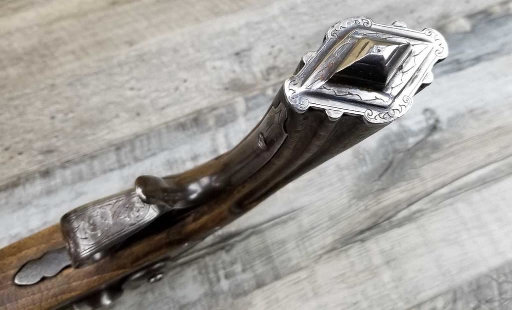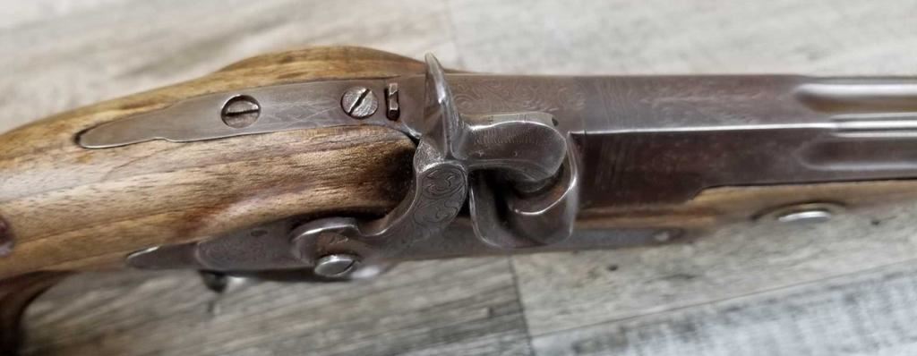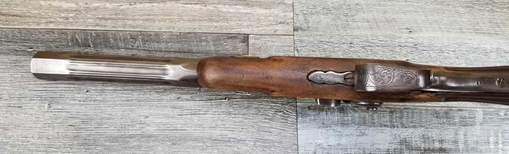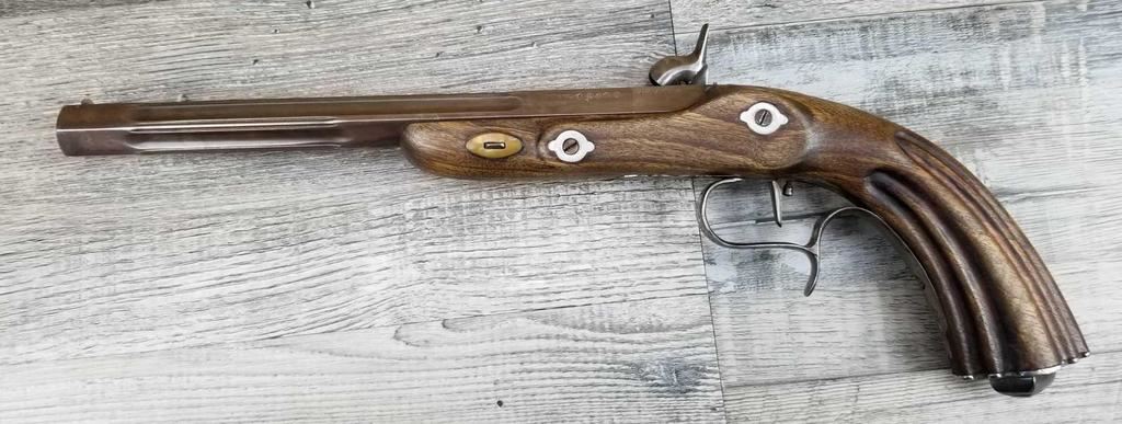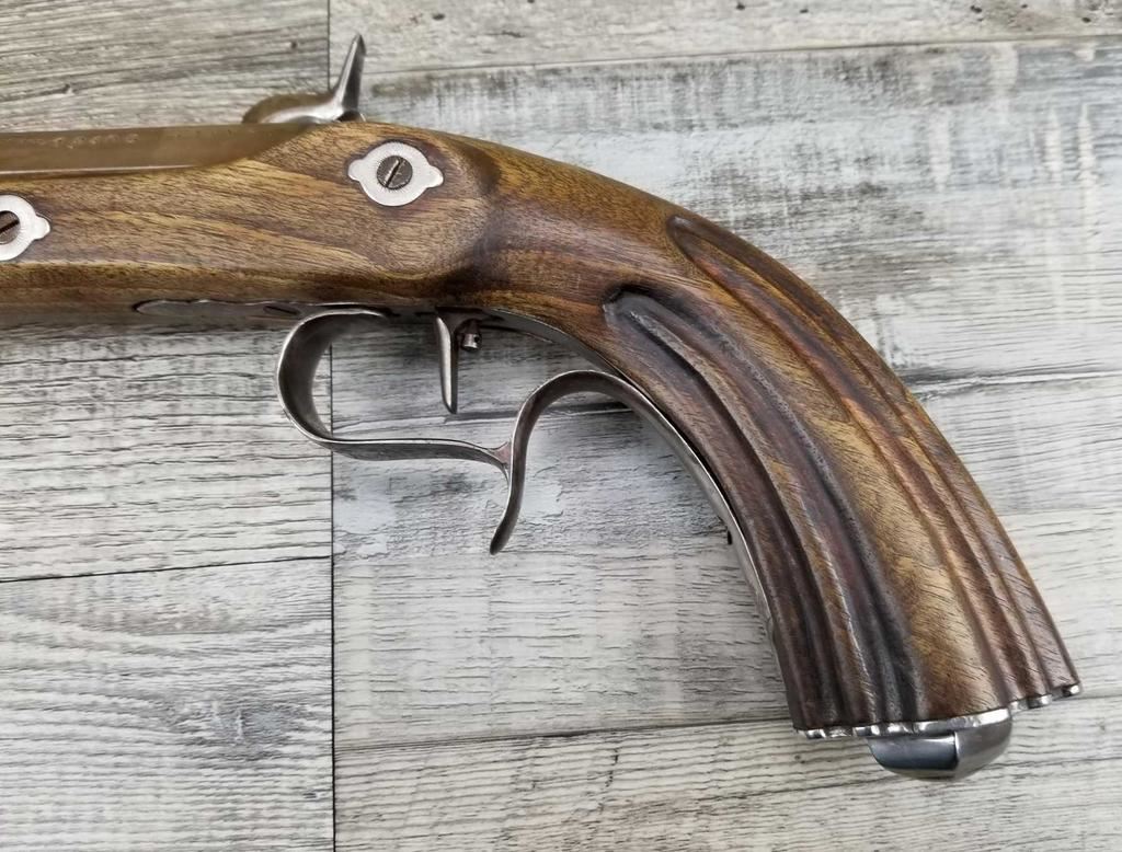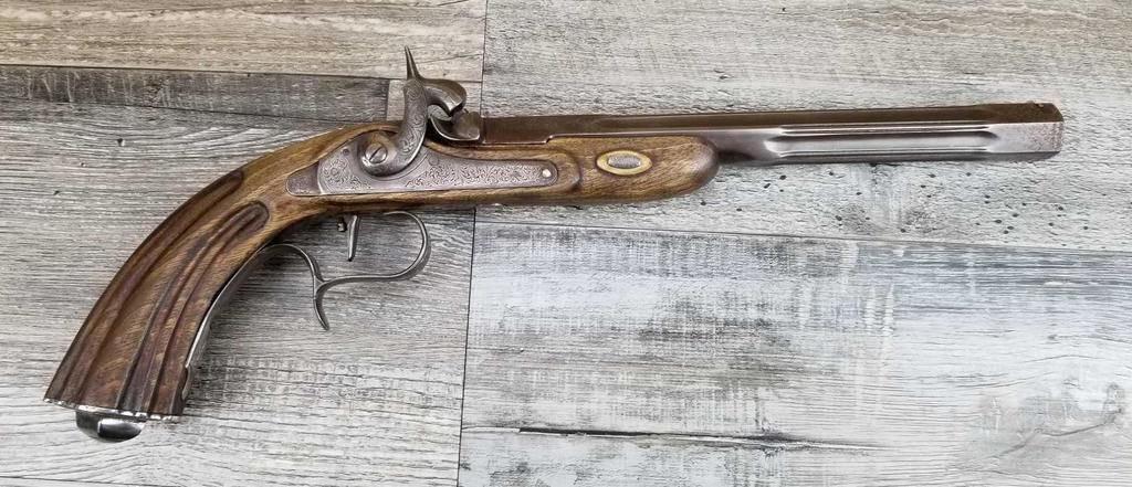 NICELY MADE EUROPEAN COPY OF FRENCH DUELING PISTOLS. IN BEAUTIFULY INLAYED EUROPEAN FITTED WALNUT CASE WITH ALL ACCESSORIES, JUST MISSING THE LID TO THE CAP CONTAINER. LID SHOWS SOME MINOR WATER DAMAGE AND ONE SMALL LOSS.