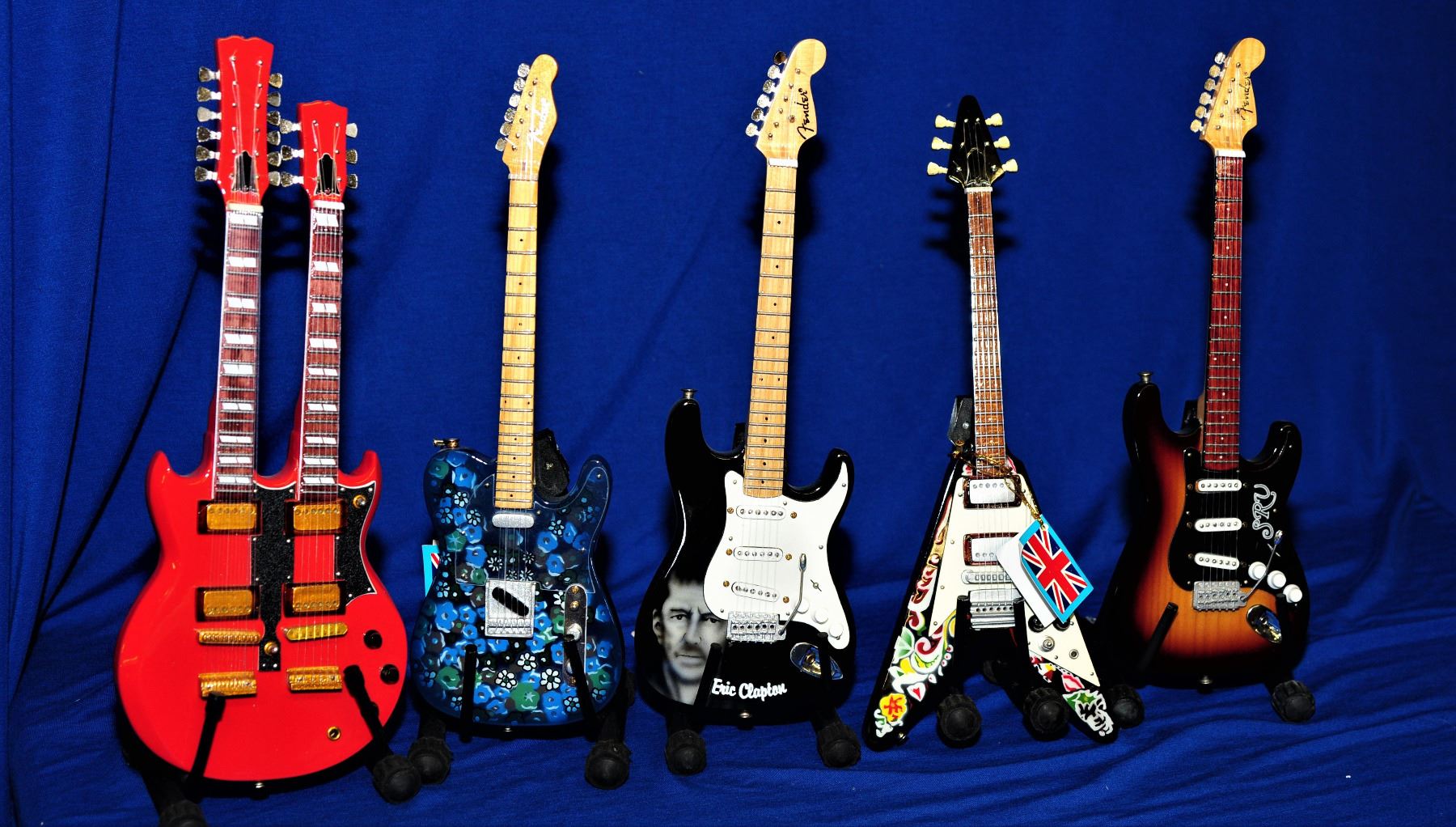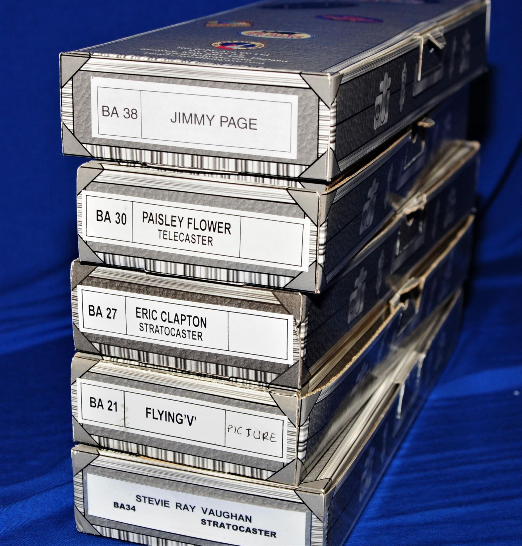 1) Paisley Flower Telecaster 2) Jimmy Page Gibson SG Double Neck 3) Eric Clapton Stratocaster 4) Stevie Ray Vaughn Stratocaster 50 Flying V all in very good condition in Little Heroes boxes