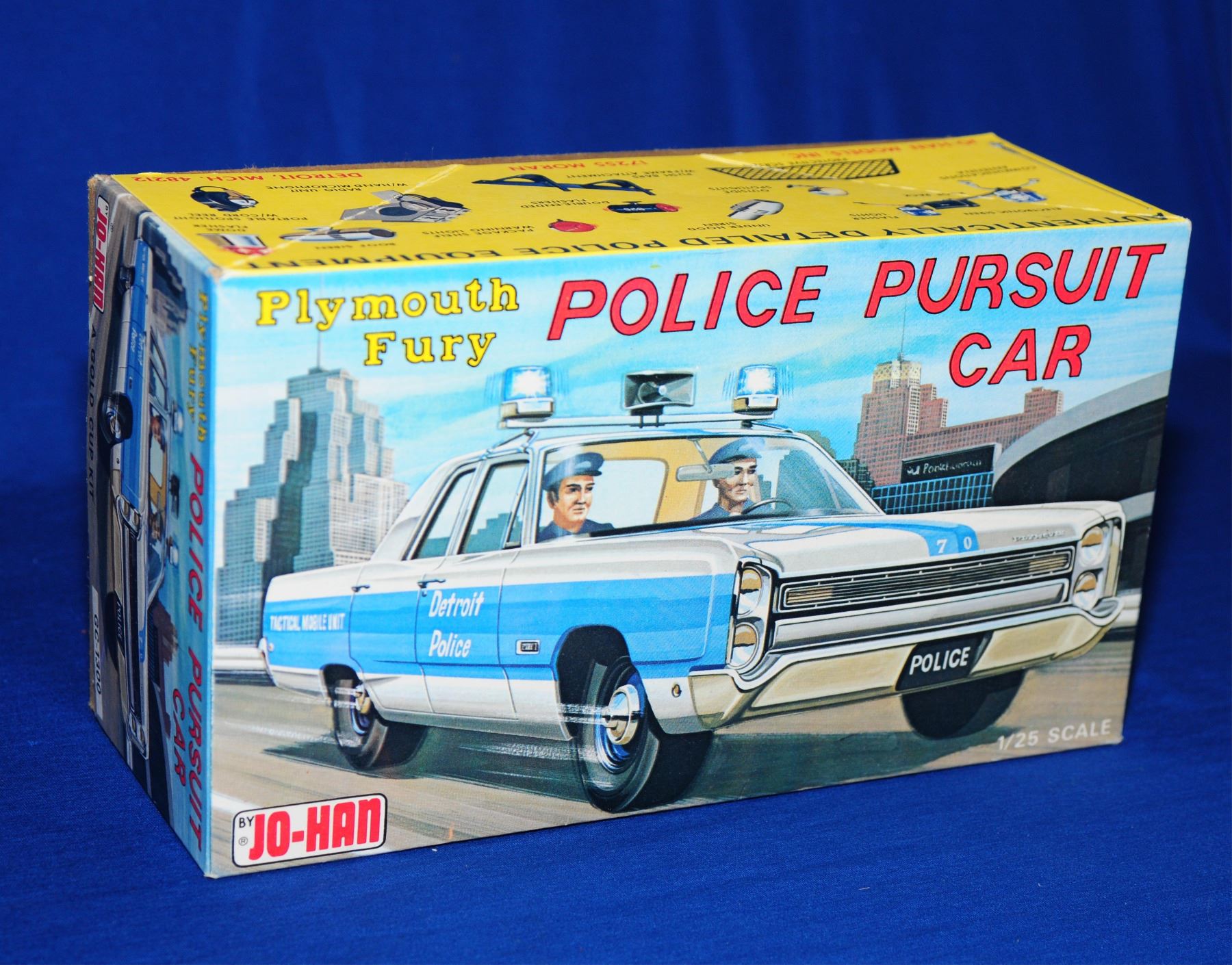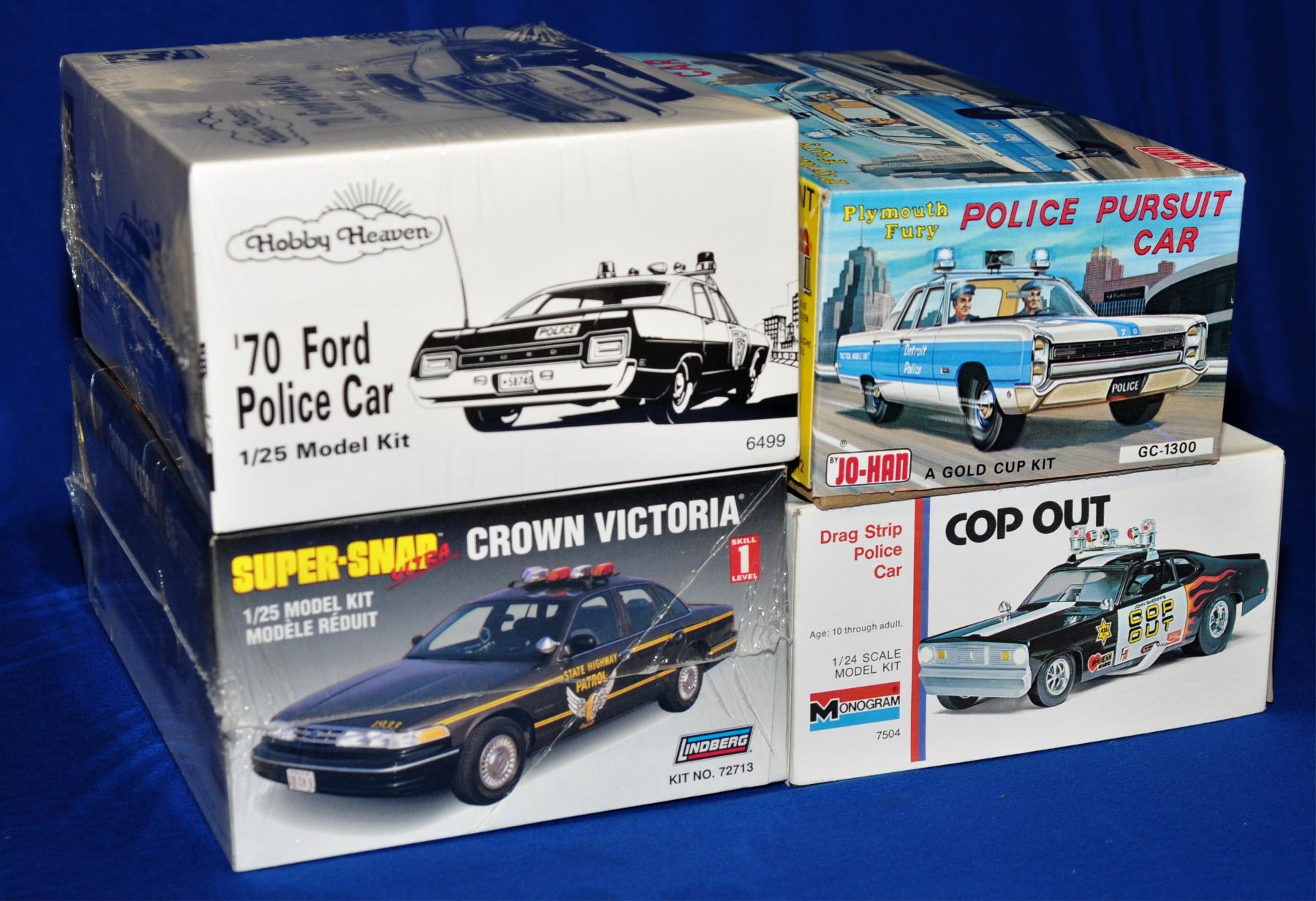 1)1:25 scale AMT 1970 Ford Police car 2) 1:25 scale Lindberg Crown Vic Ohio State Hwy. Patrol Minimal gluing and no paint needed 3) 1:25 scale Jo-Han Plymouth Fury Police Pursuit car 4) 1:24 scale Monogram Cop Out drag strip police car 2 are unopened