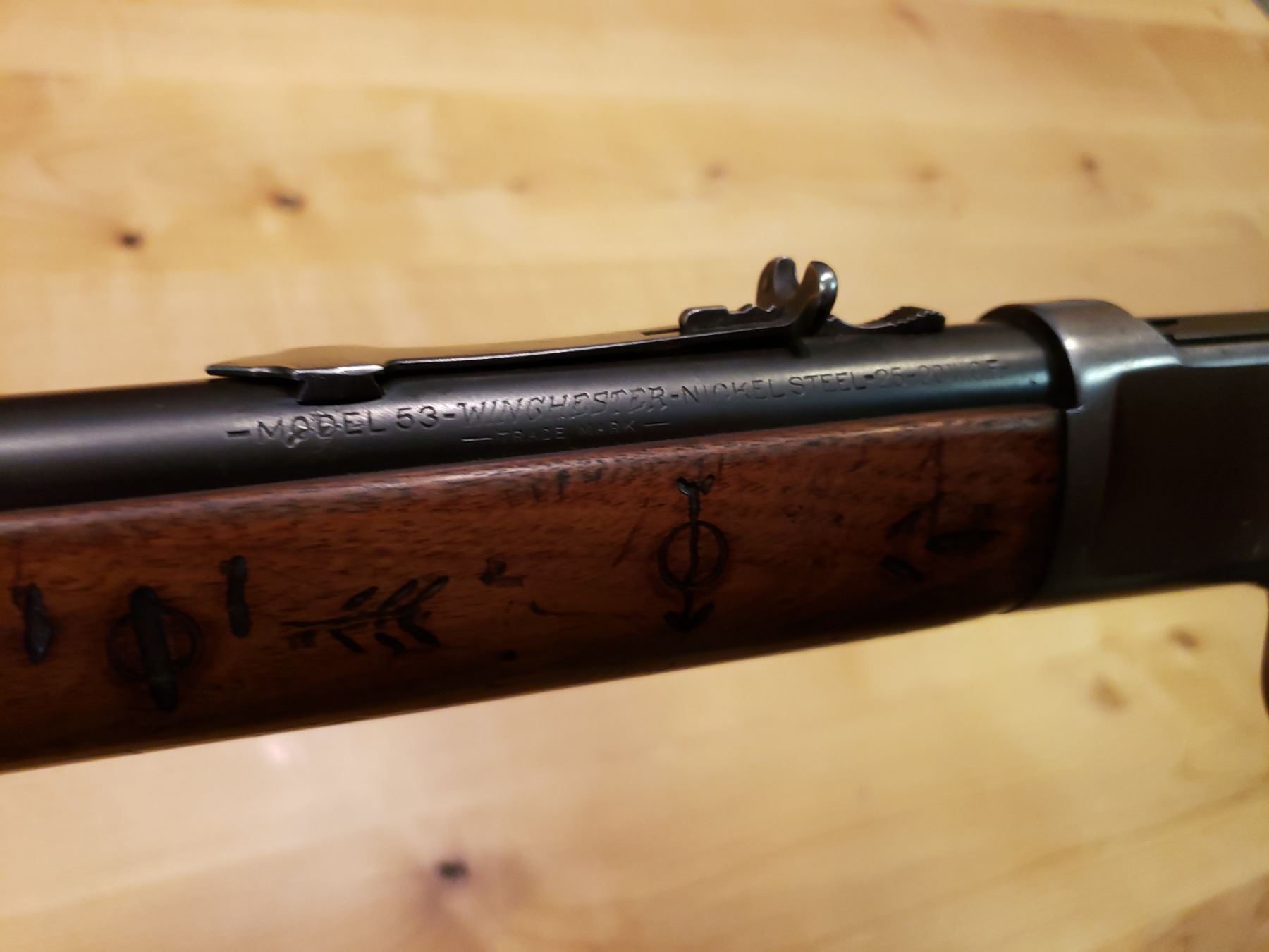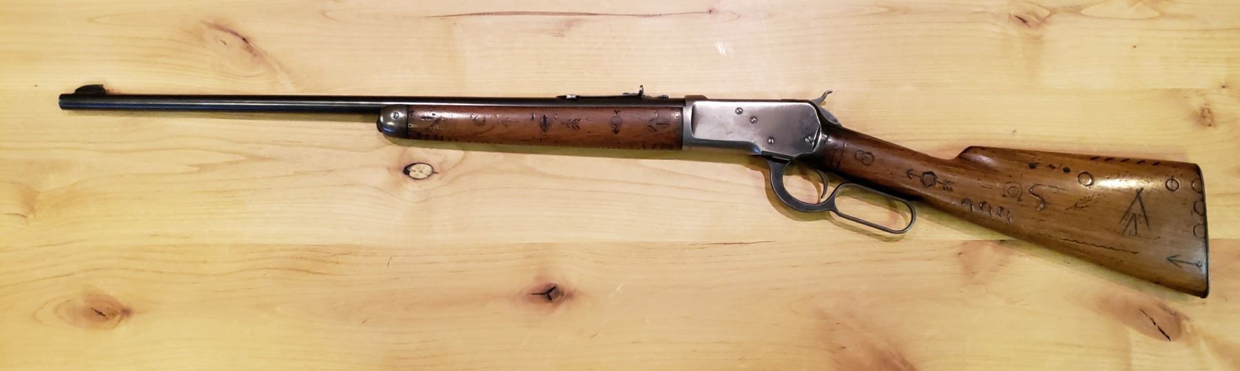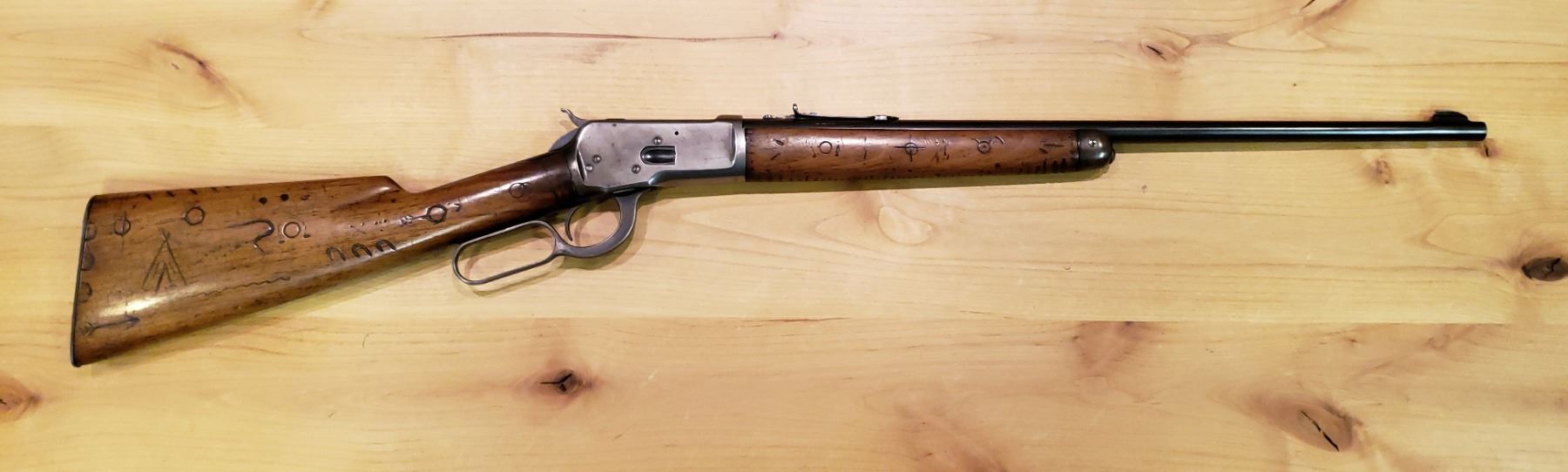 22” barrel-made in 1929, Serial #984782 (The model 53 was one of the least produced models that Winchester made) The story behind this rifle is that it was supposedly owned by a Blackfoot Native American from the Blackfoot Indian reservation in Blackfoot, Idaho. The gentleman was born in approximately the 1880’s and lived his whole life in that area. The rifle was made in 1929 so it’s not known when or where he acquired it. He marked the rifle in the traditional Blackfoot style and hunted with the rifle the rest of his life. He passed away in the late 50’s early 60’s and the rifle was purchased from one of his grandsons. Typically rifles of this nature and quality are in museums. The opportunity to have one In a private collection is priceless and very rare.