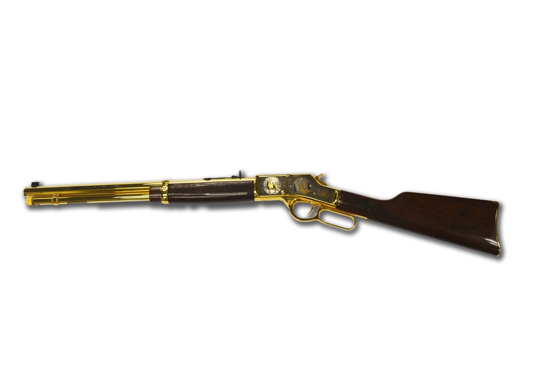 From the Mule Deer Foundation gun vault, a truly amazing limited edition “Henry Big Boy”, 45 Caliber rifle, finished in five tone gold, which includes 24-karat gold, antique gold, high gloss nickel, antique nickel and black. #1 of 25 individually numbered limited edition rifles.